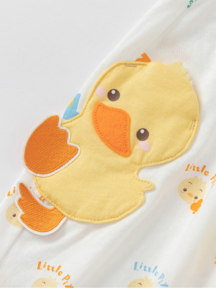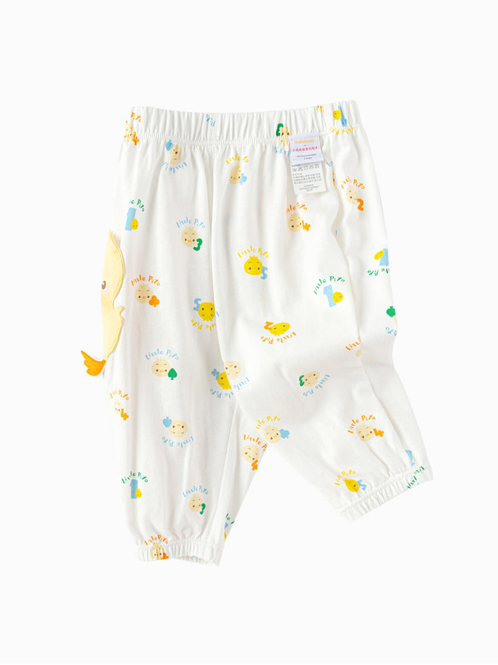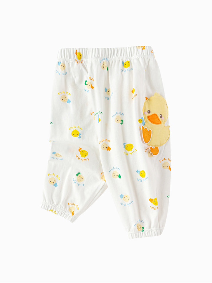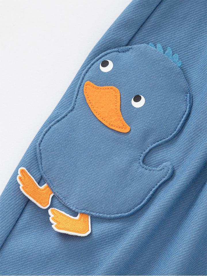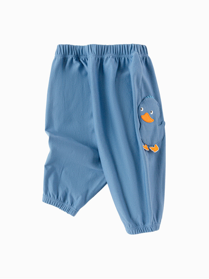 baby boy casual pants, decorated with a print on the front side and a duck patch detail on the side of one leg, comes with a comfy elasticated waistband