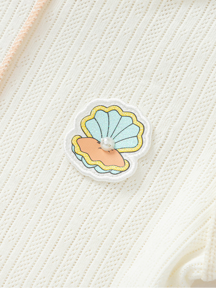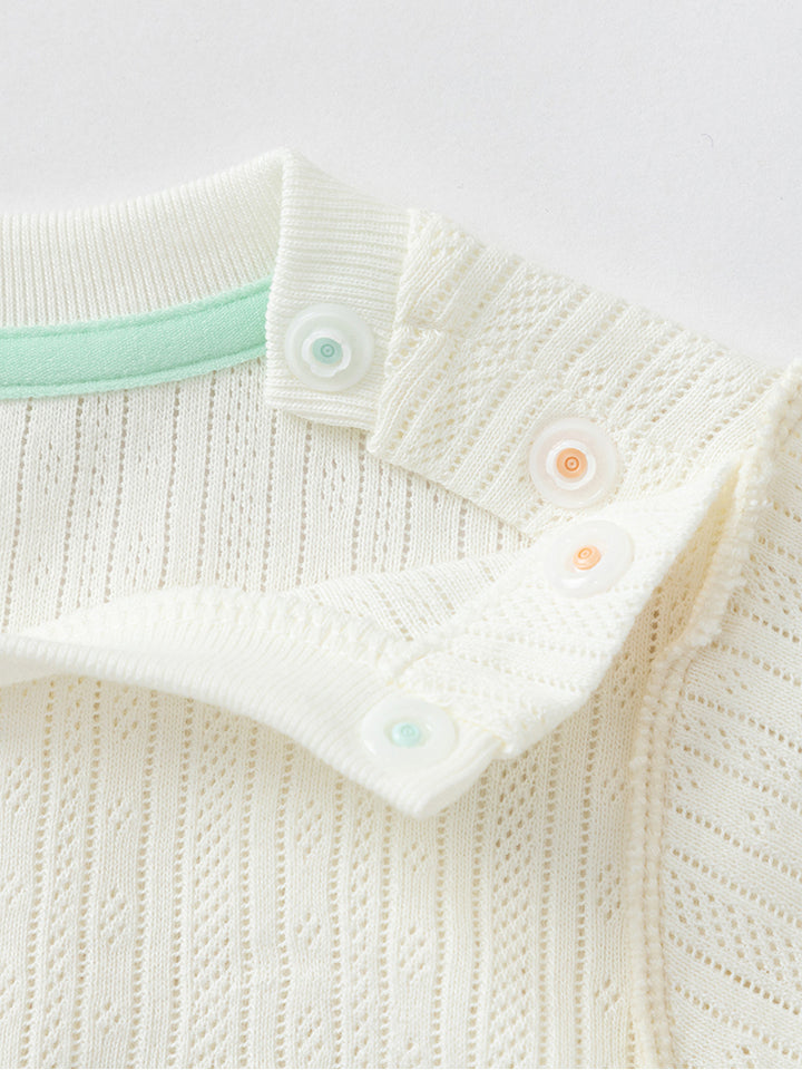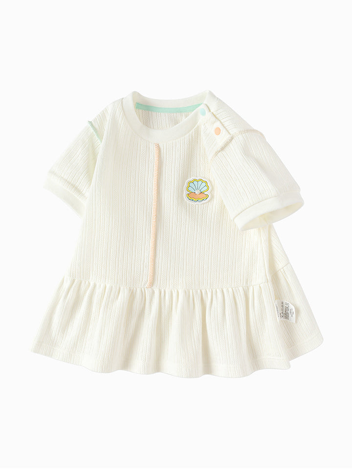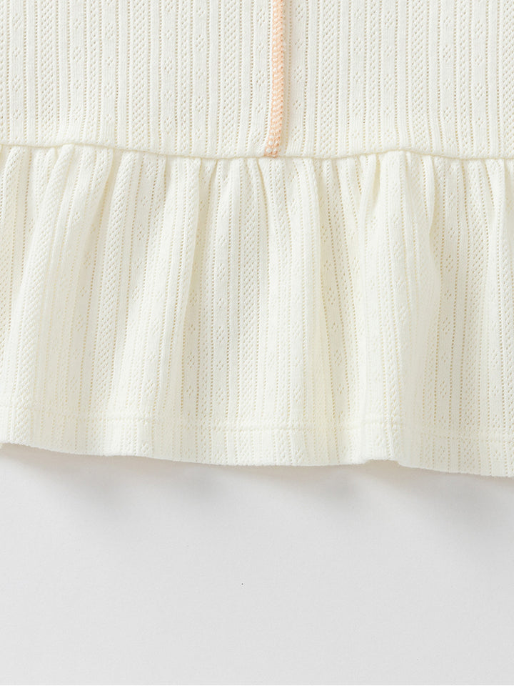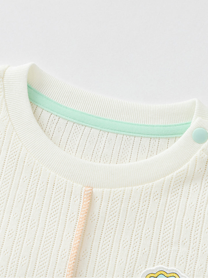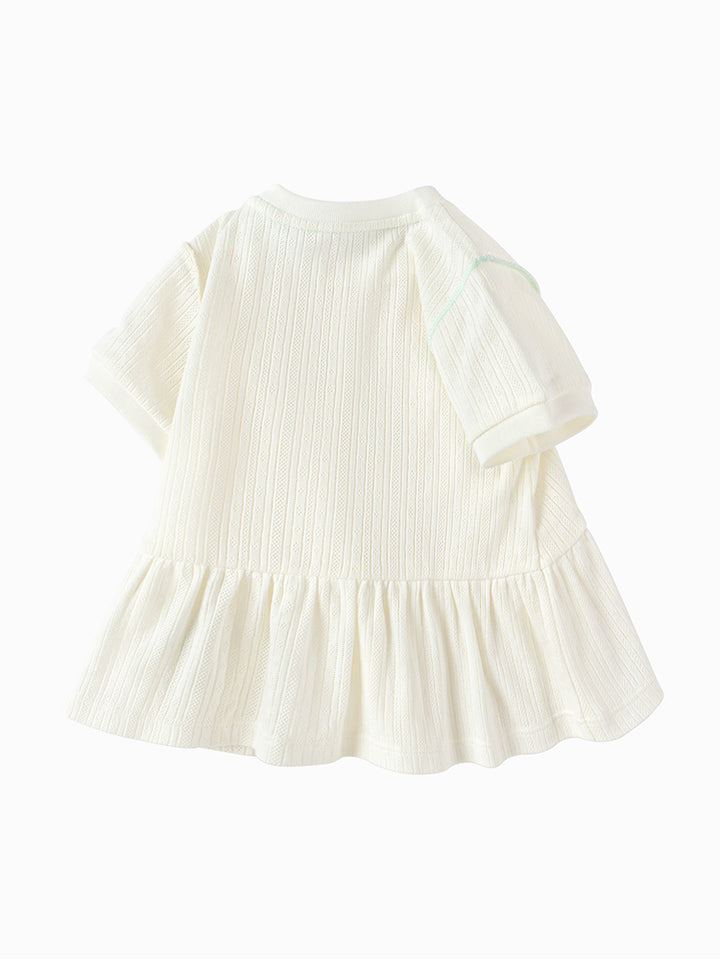 short sleeves baby girl t-shirt, decorated with a textured pattern fabric, ruffled detail on bottom side and a small patch detail on chest front side, comes with push buttons for closure on one shoulder and with a rounded shape neckline