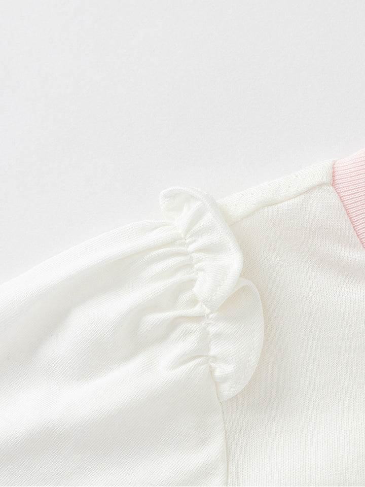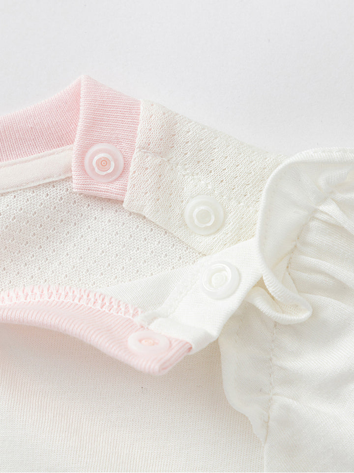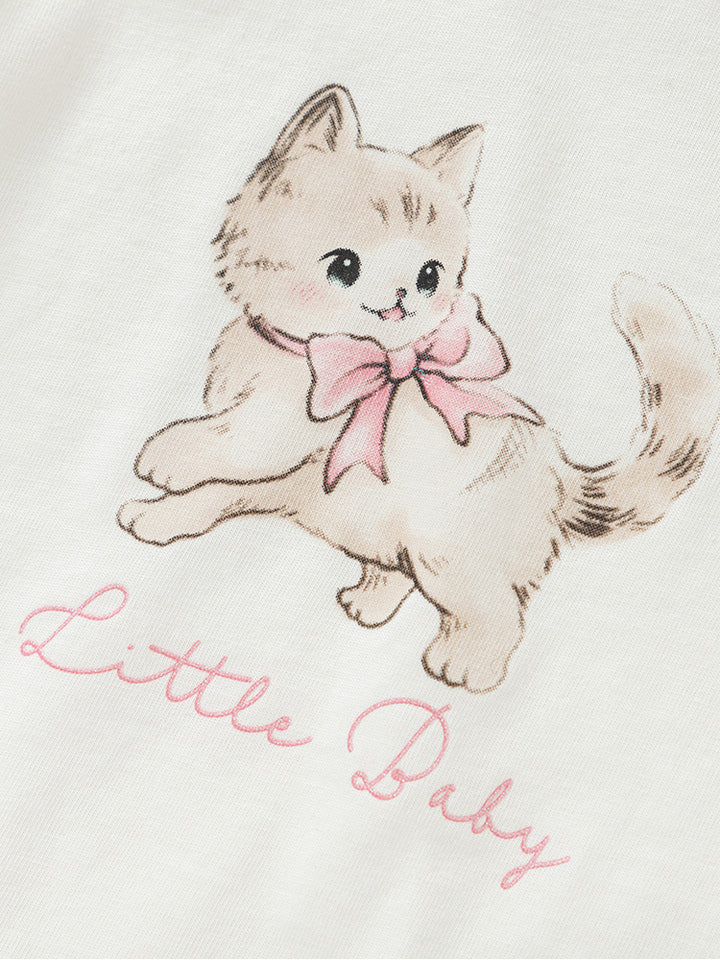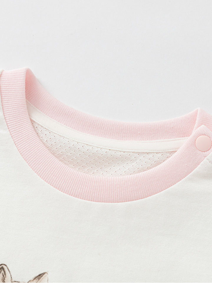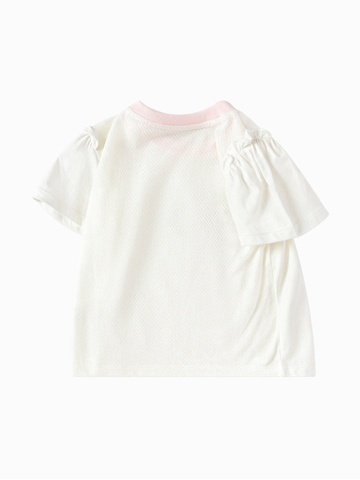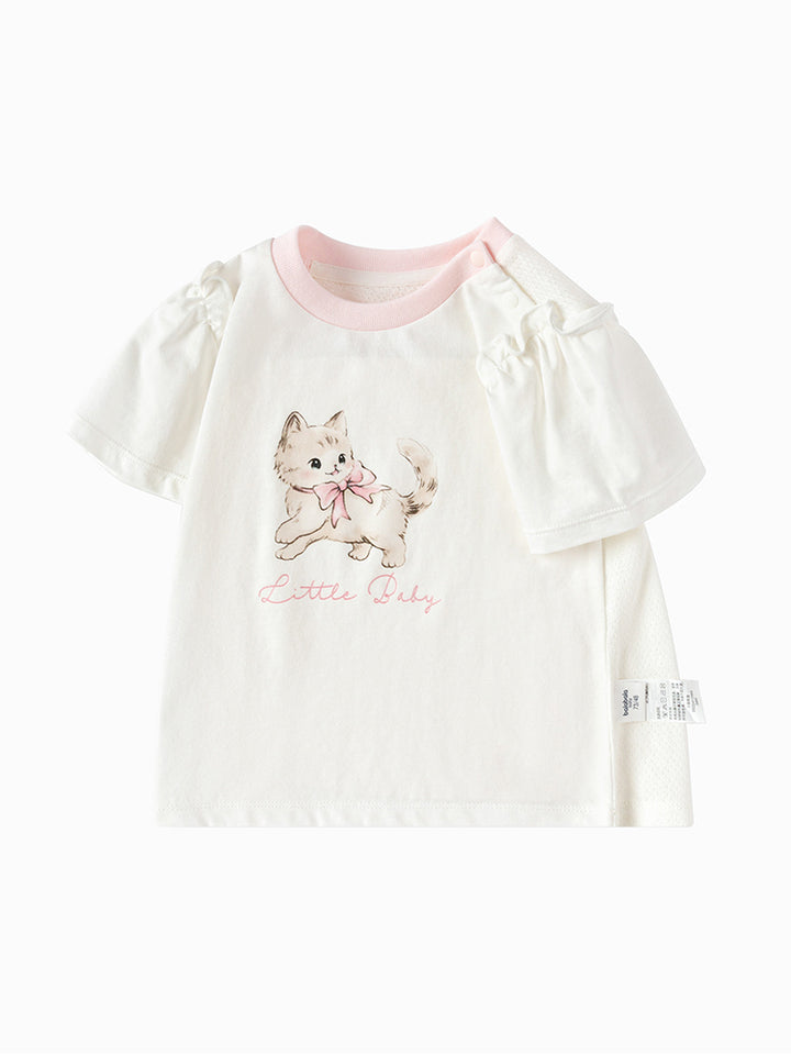 short sleeves baby girl t-shirt, decorated with a textured pattern fabric and a print on the front side, comes with buttons for closure on one shoulder and with a rounded shape neckline