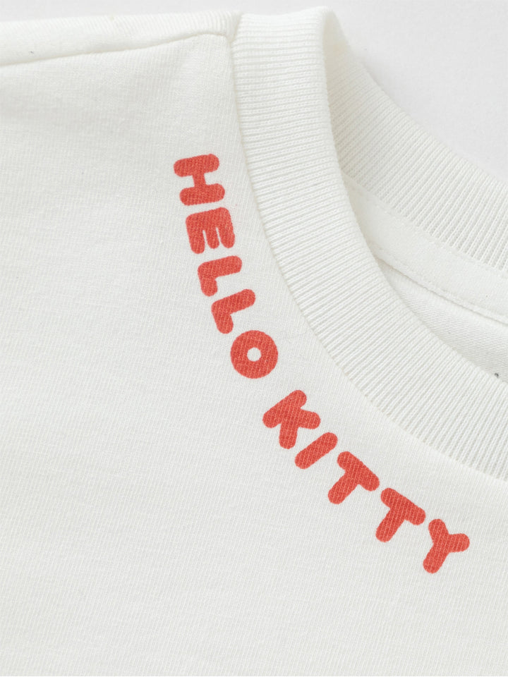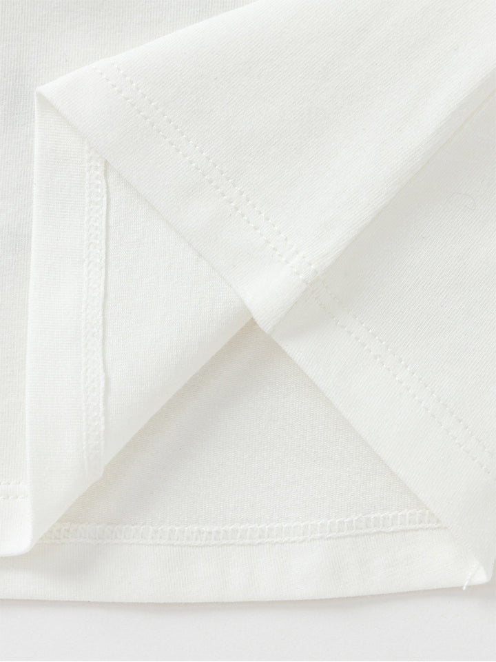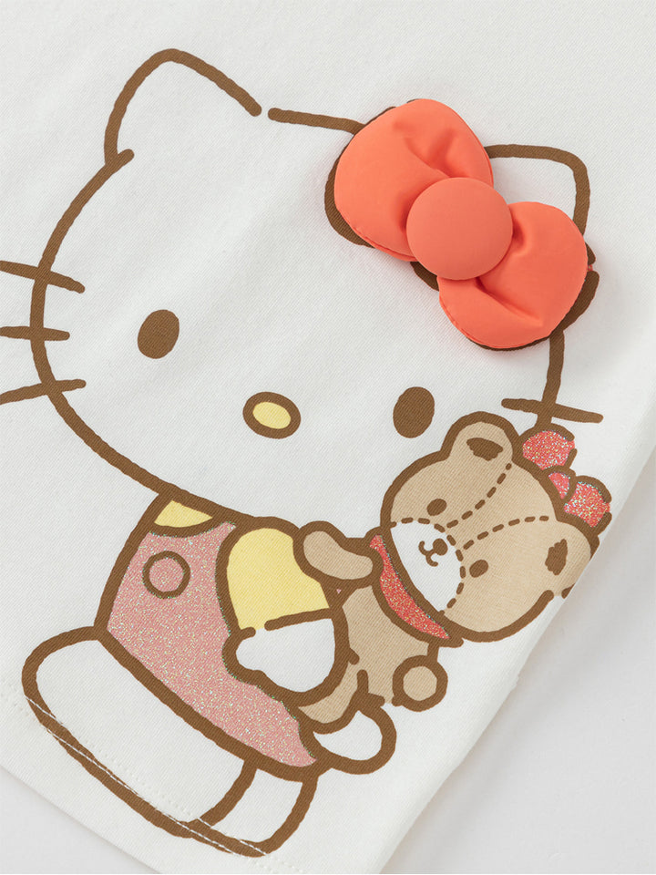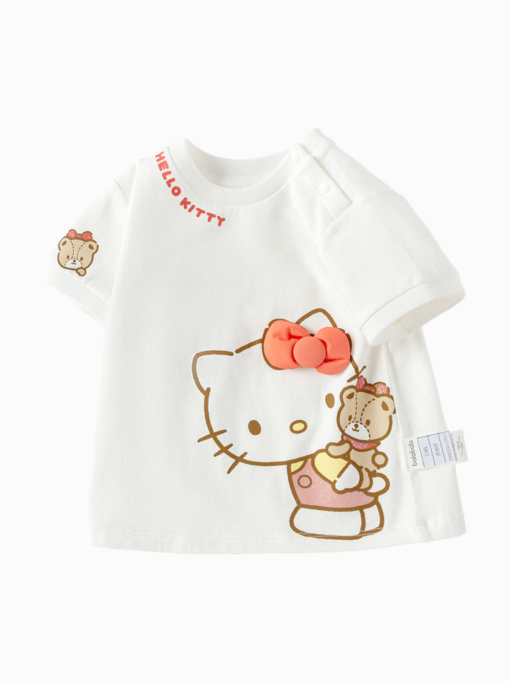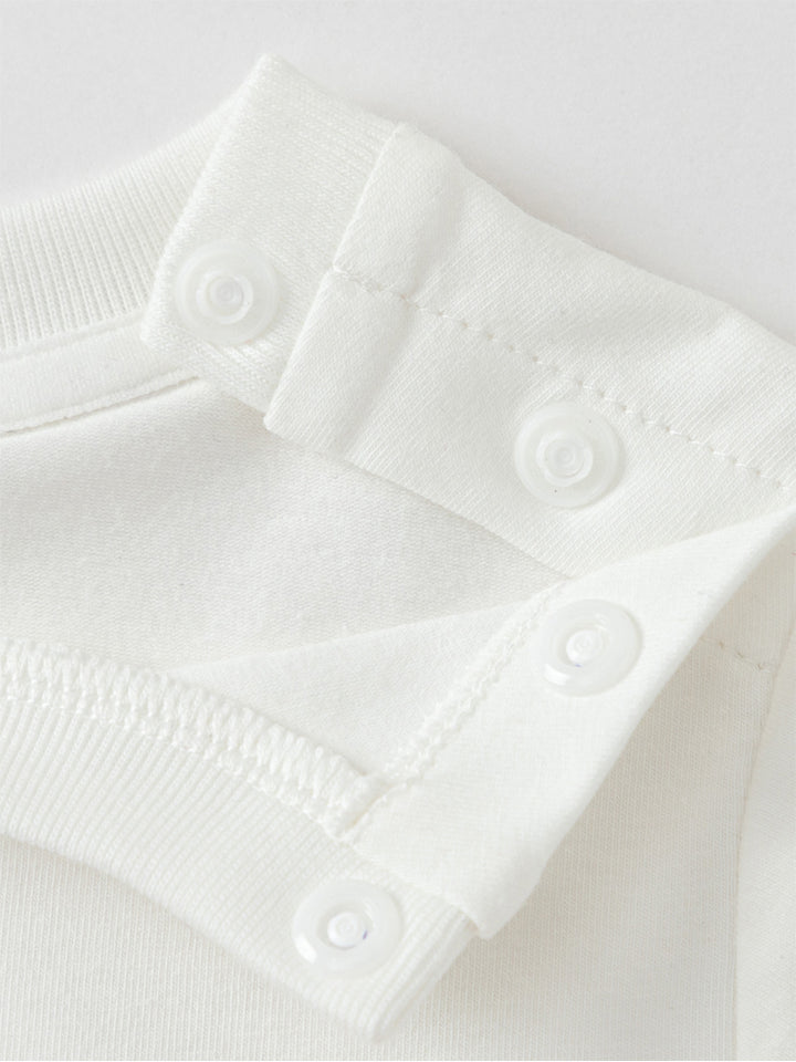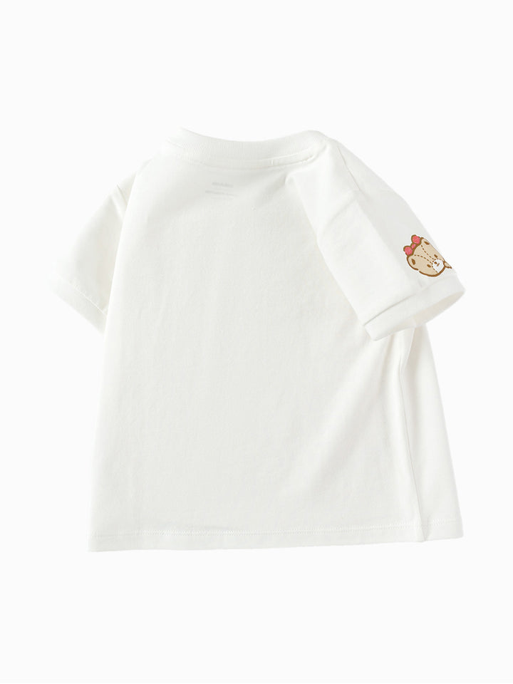 short sleeves baby girl t-shirt, decorated with a print on the front side, comes with push buttons for closure on one shoulder and a rounded shape neckline