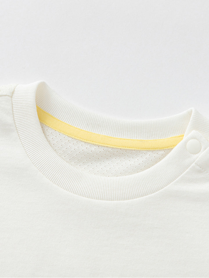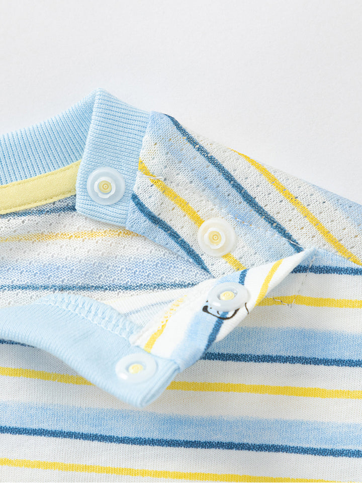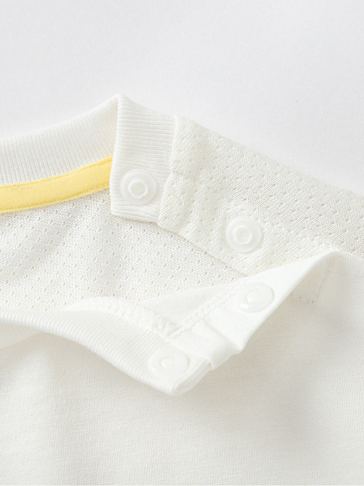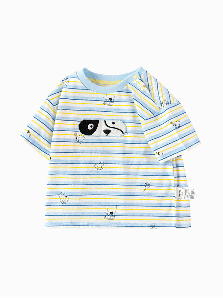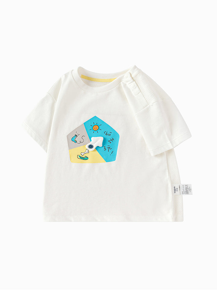 short sleeves baby boy t-shirt, decorated with a textured pattern fabric and a print on the front side, comes with buttons for closure on one shoulder and with a rounded shape neckline