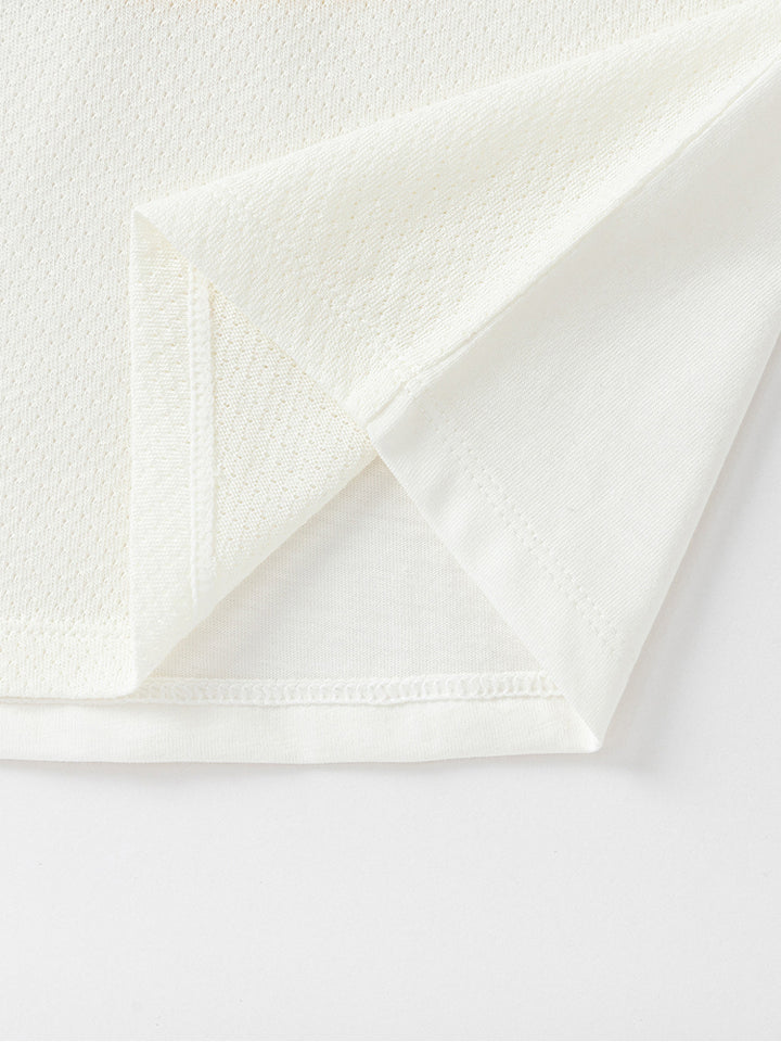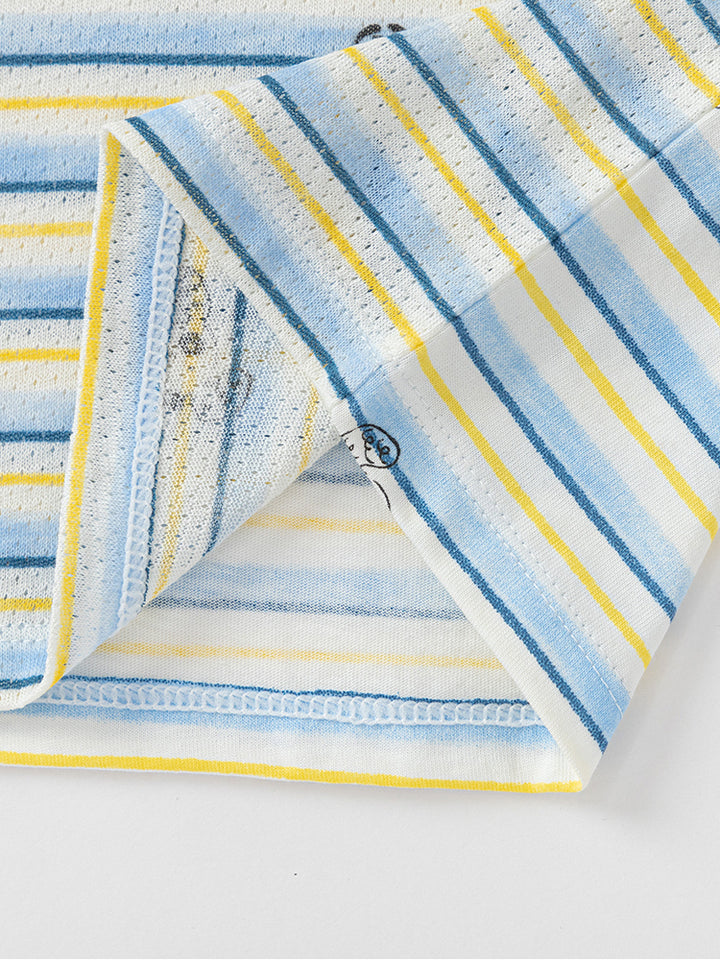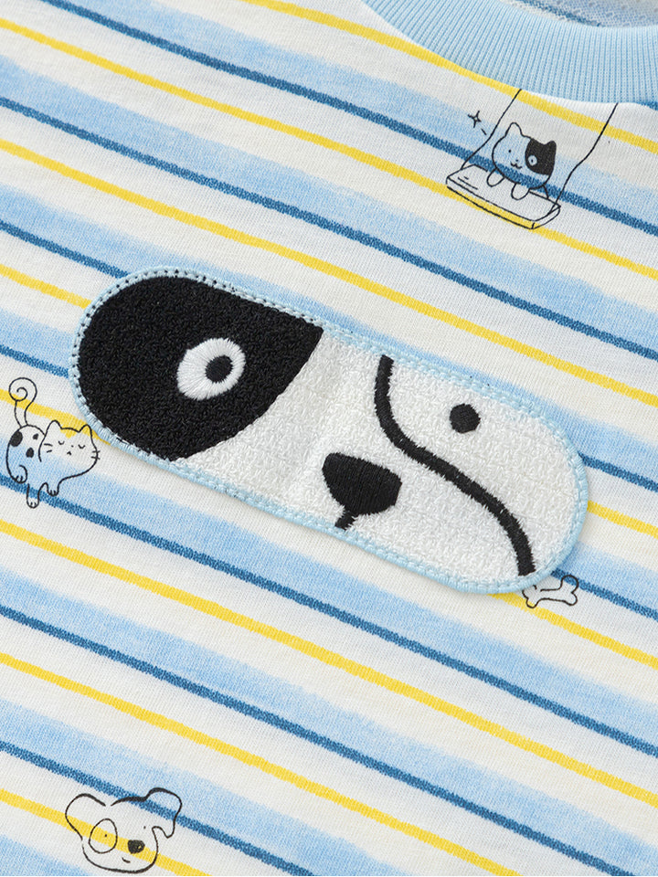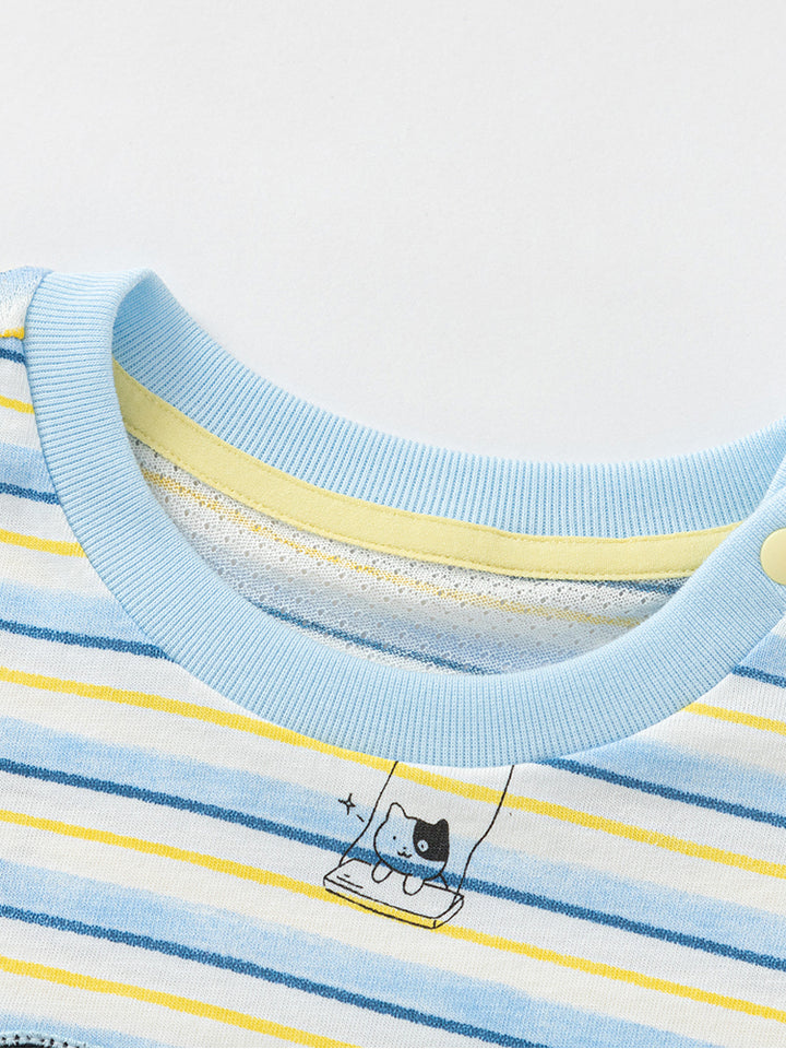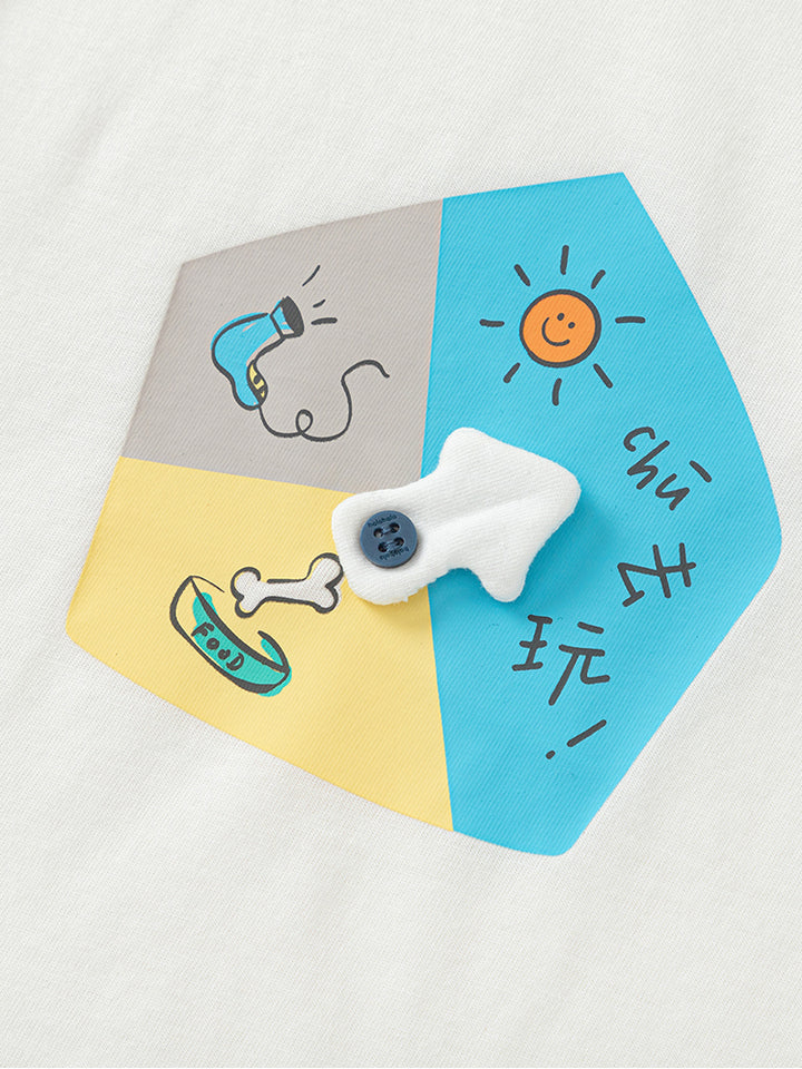 short sleeves baby boy t-shirt, decorated with a textured pattern fabric and a print on the front side, comes with buttons for closure on one shoulder and with a rounded shape neckline