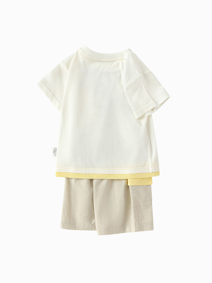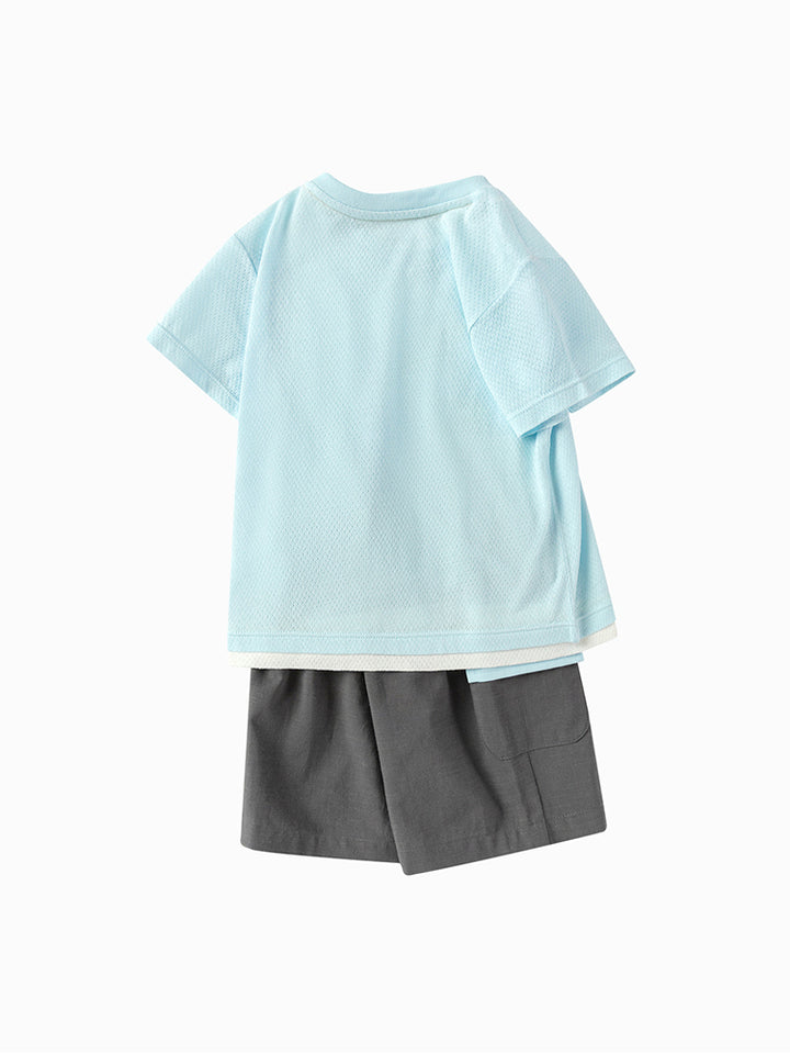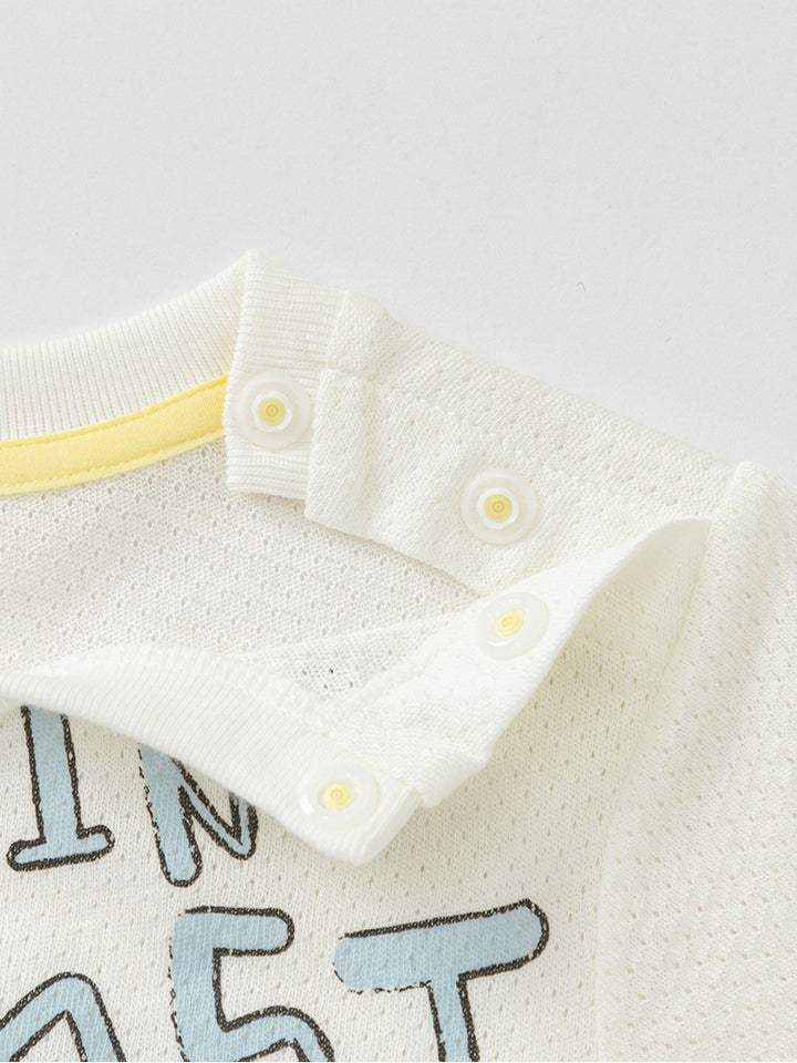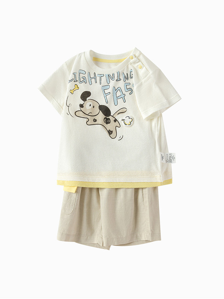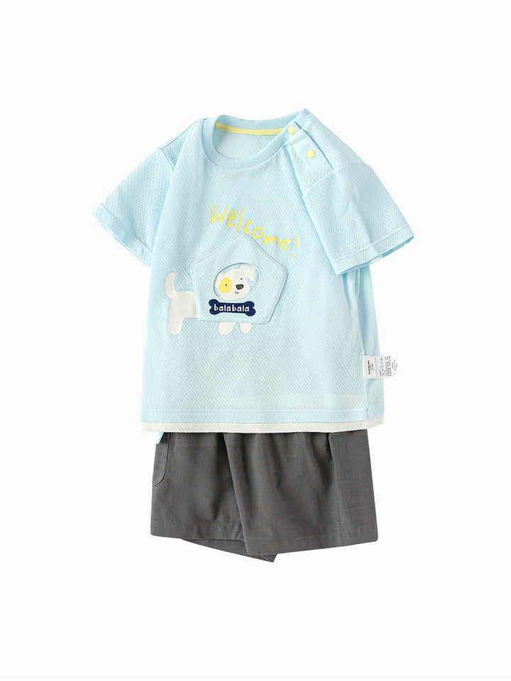 baby boy set of two pieces, a short sleeves t-shirt decorated with a textured pattern fabric and a print on the front side, comes with buttons for closure on one shoulder and with a rounded shape neckline, and a casual shorts, comes with a flap pocket on the side of one leg and with a comfy elasticated waistband