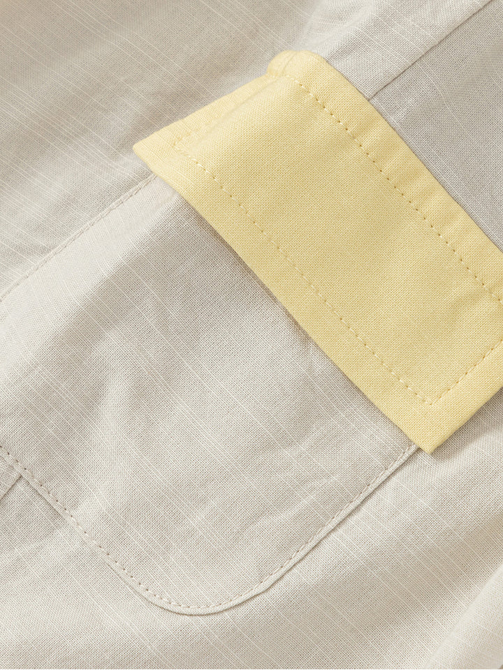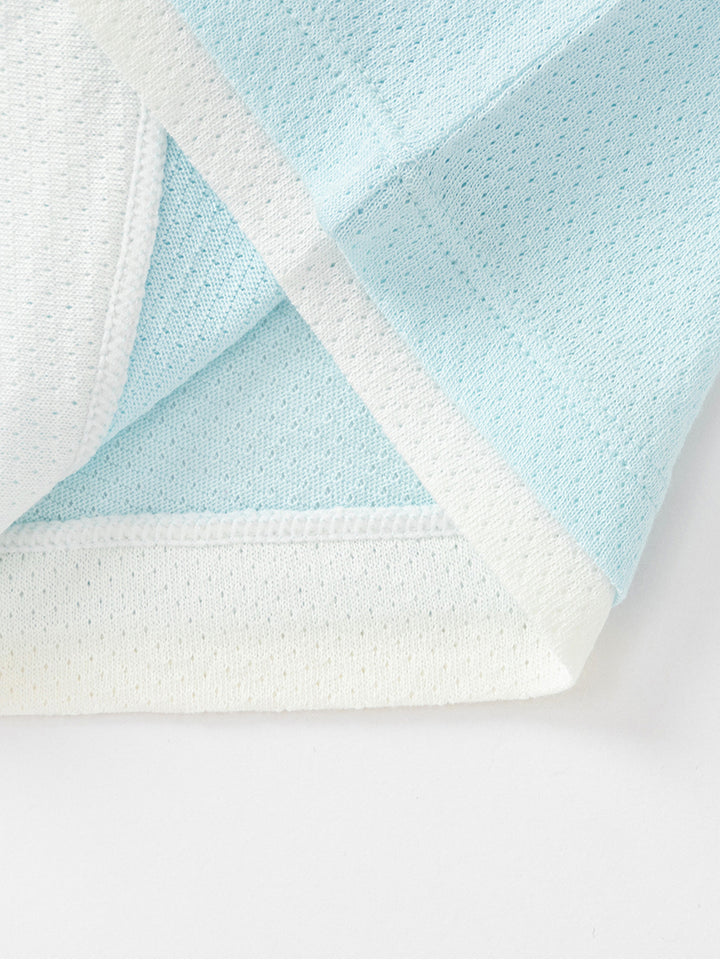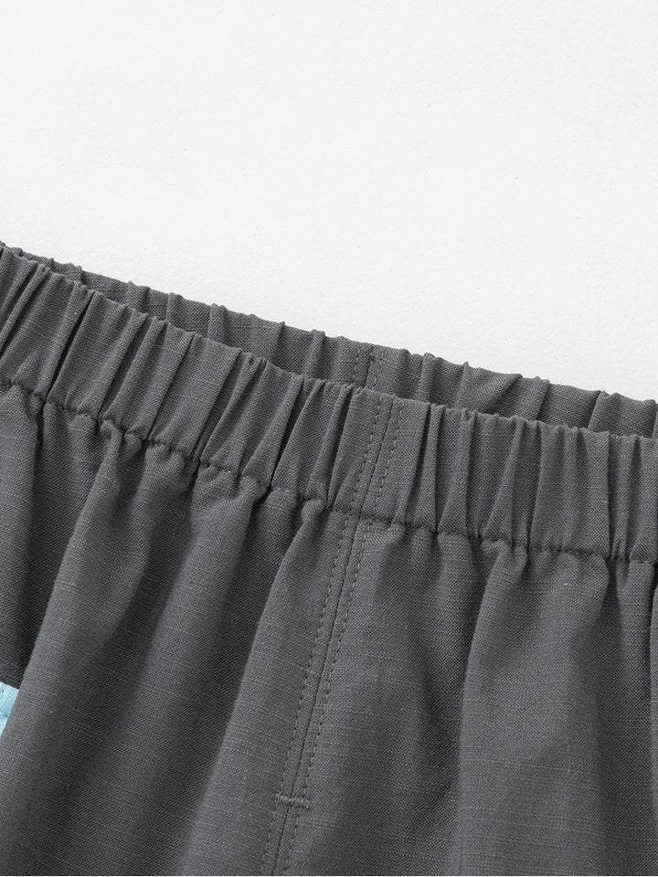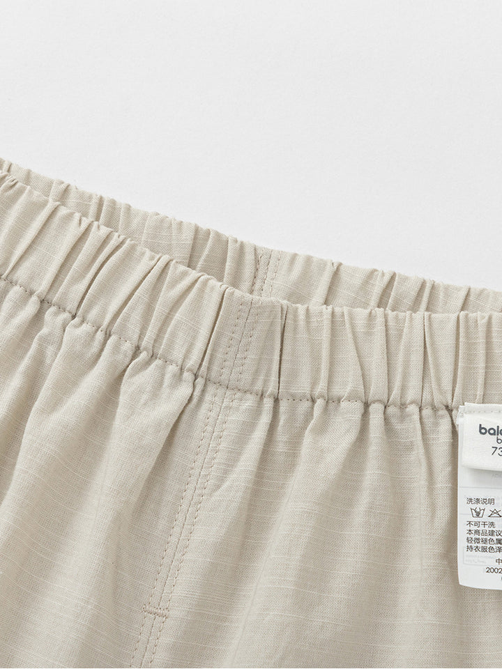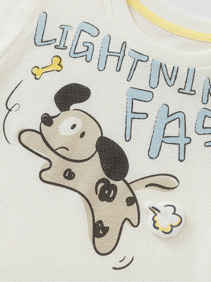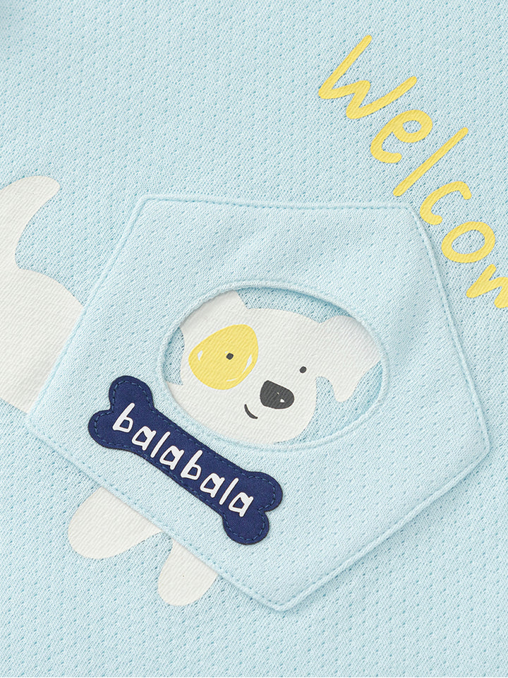 baby boy set of two pieces, a short sleeves t-shirt decorated with a textured pattern fabric and a print on the front side, comes with buttons for closure on one shoulder and with a rounded shape neckline, and a casual shorts, comes with a flap pocket on the side of one leg and with a comfy elasticated waistband