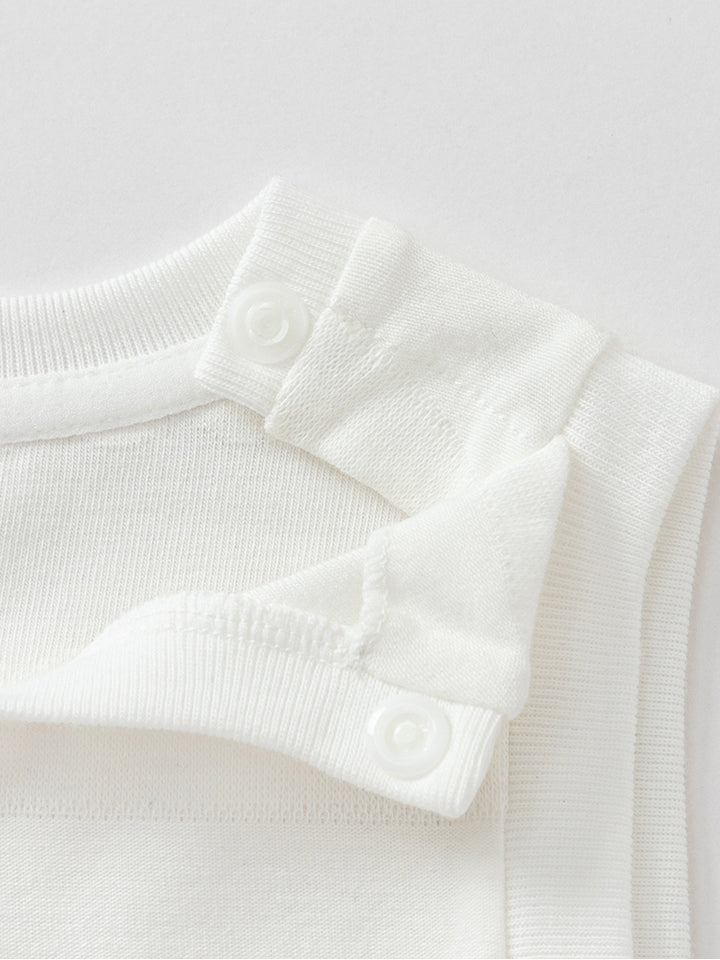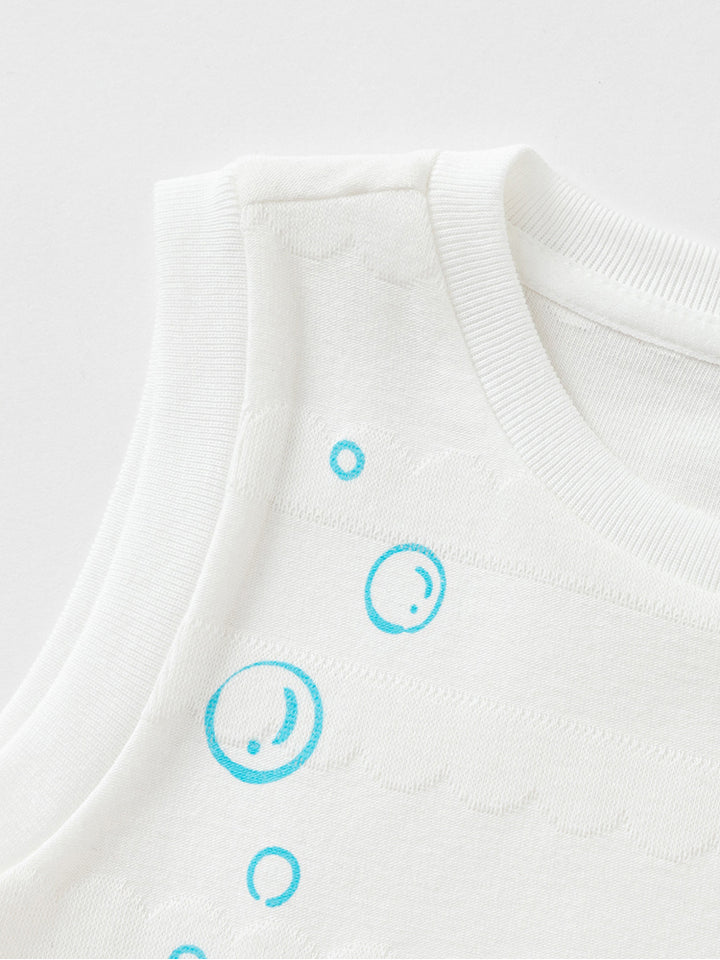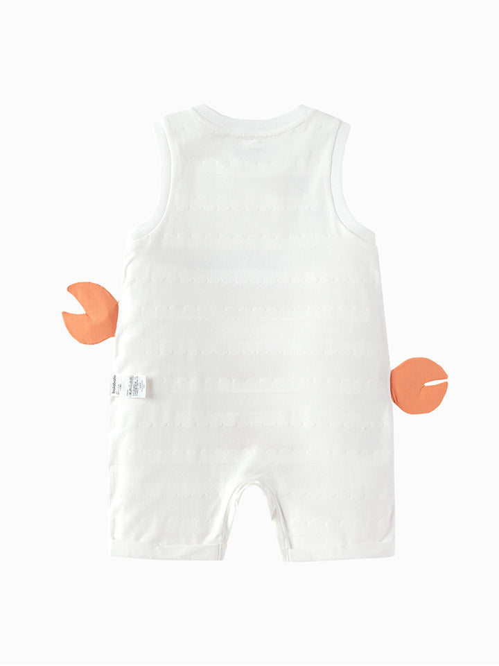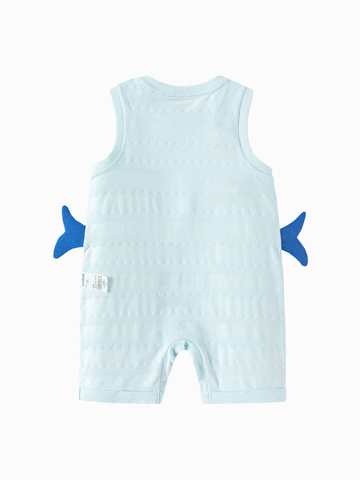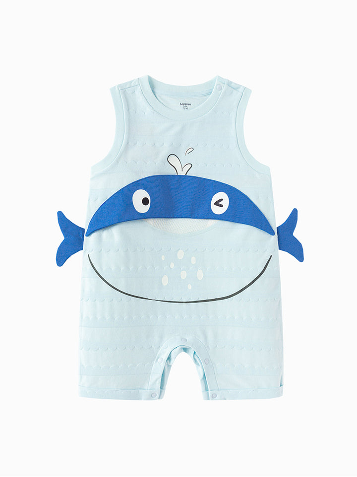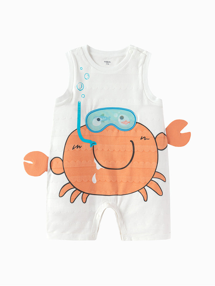 sleeveless baby boy overall, decorated with a print on the front side, comes with push buttons for closure on one shoulder and on bottom side and with a rounded shape neckline