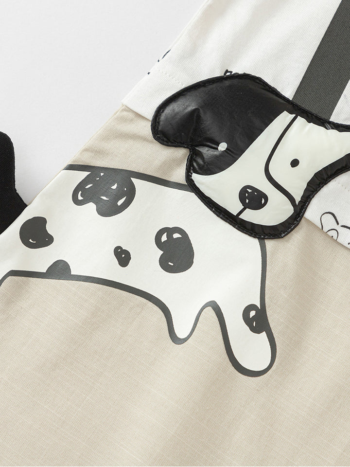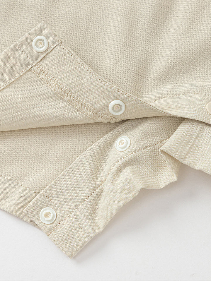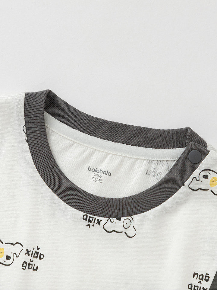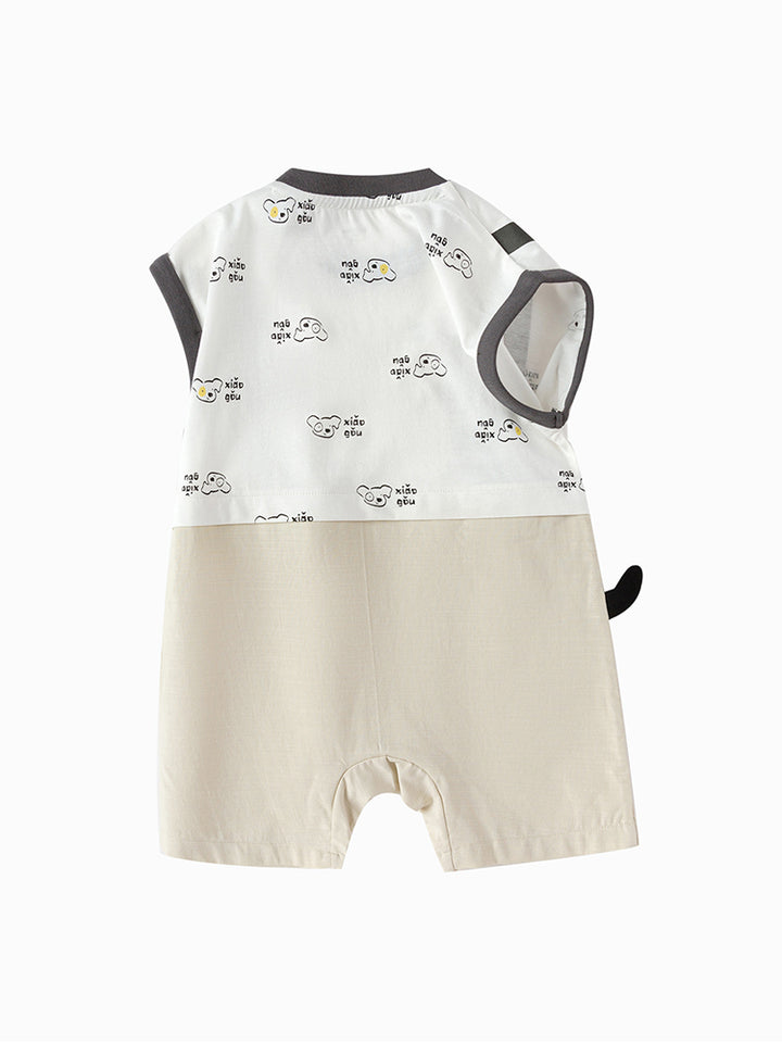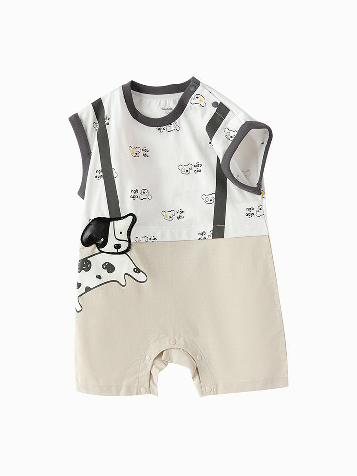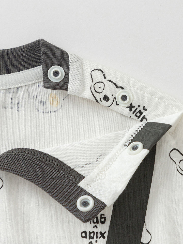 short sleeves baby boy overall decorated with a printed pattern on upper side, comes with buttons for closure on one shoulder and on bottom side and with a rounded shape neckline