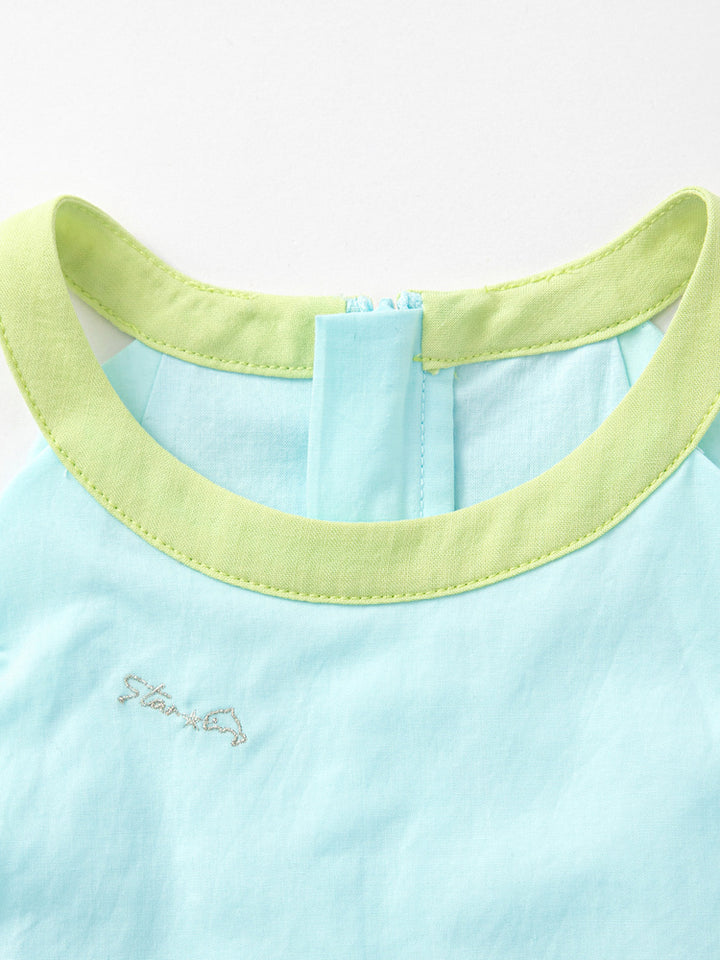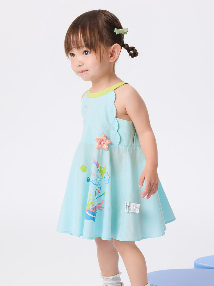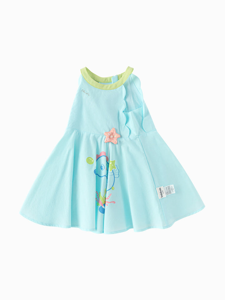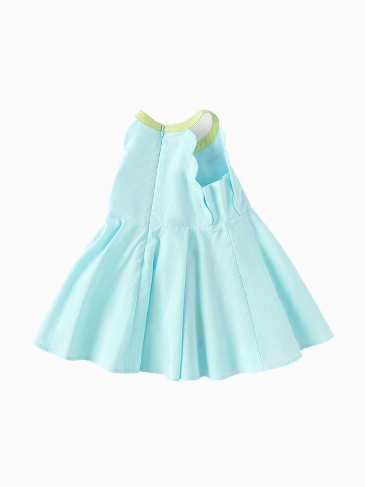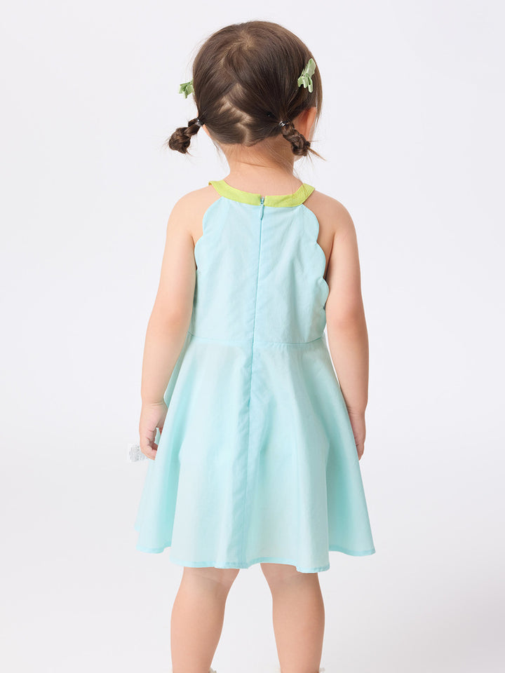 This sweet sleeveless baby dress features a large skirt with small waist pleats, a petal-shaped design on the front and back, and a widened halter collar. The back zipper closure ensures easy wear, combining style and comfort.