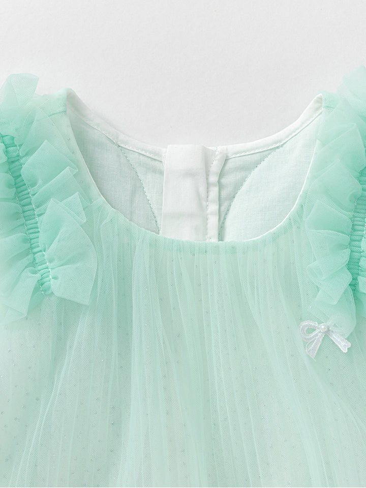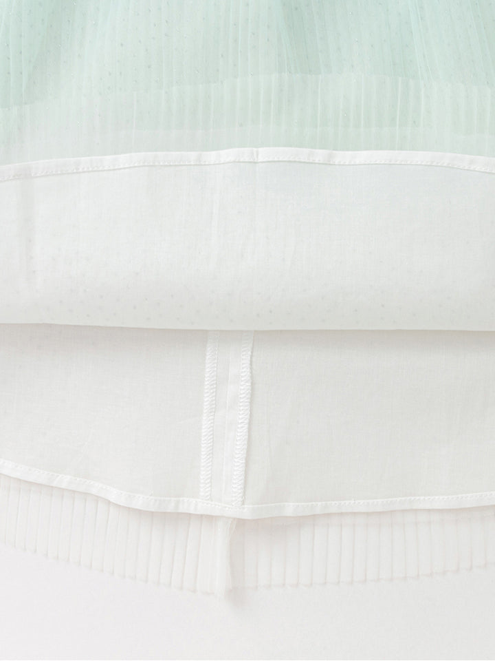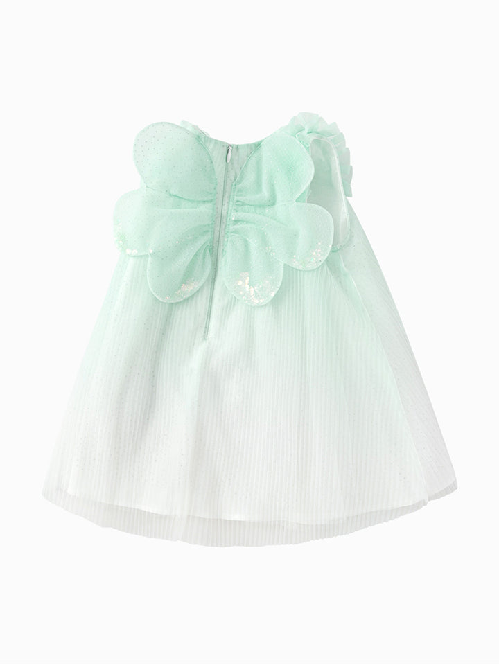 sleeveless flowy dress in a gradient colored pattern, decorated with tulle fabric details on shoulders, comes with zipper for closure on the back side and with a rounded shape neckline