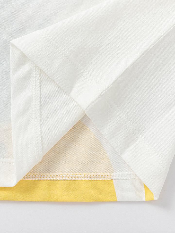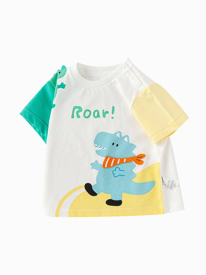 short sleeves t-shirt, decorated with a print on the front side, comes with buttons on one shoulder and with a rounded shape neckline