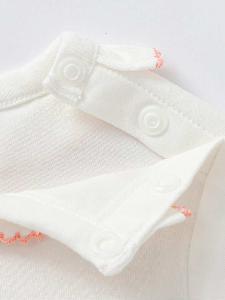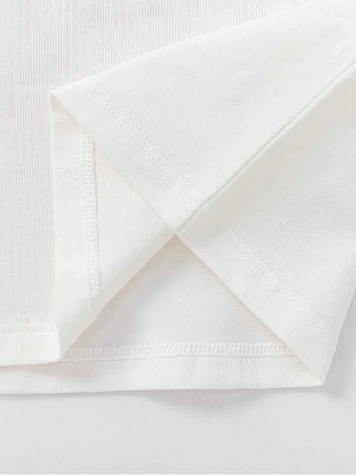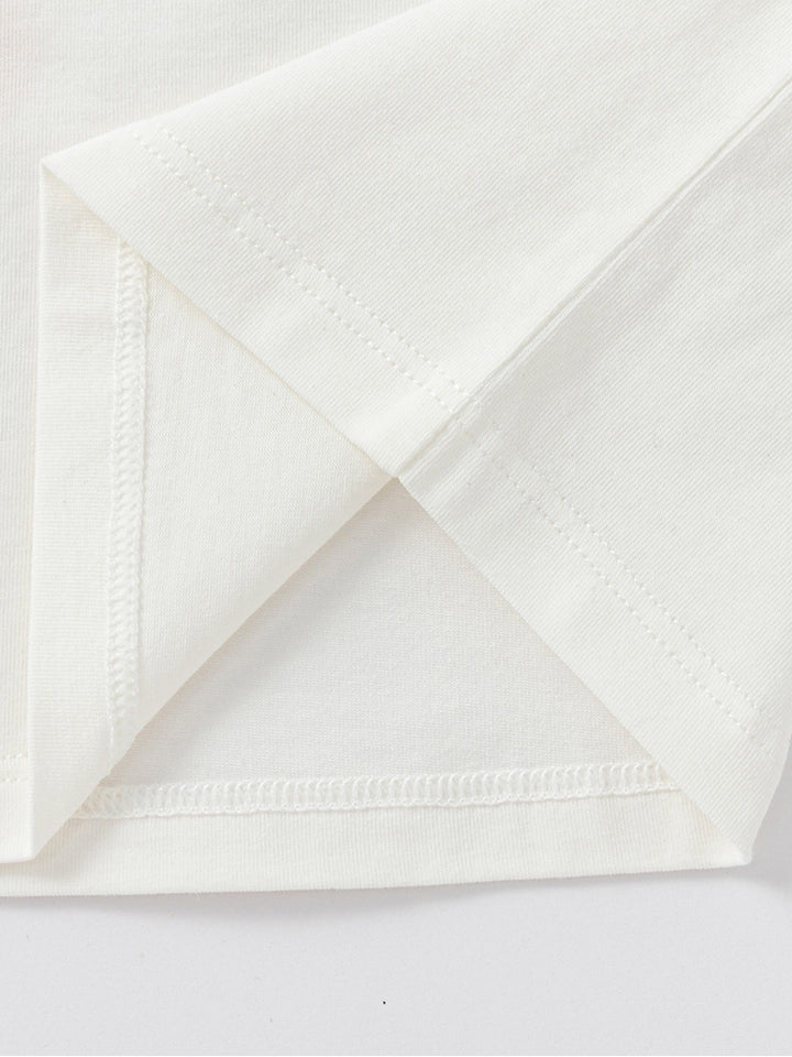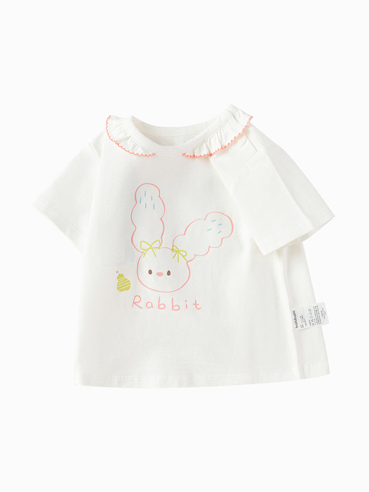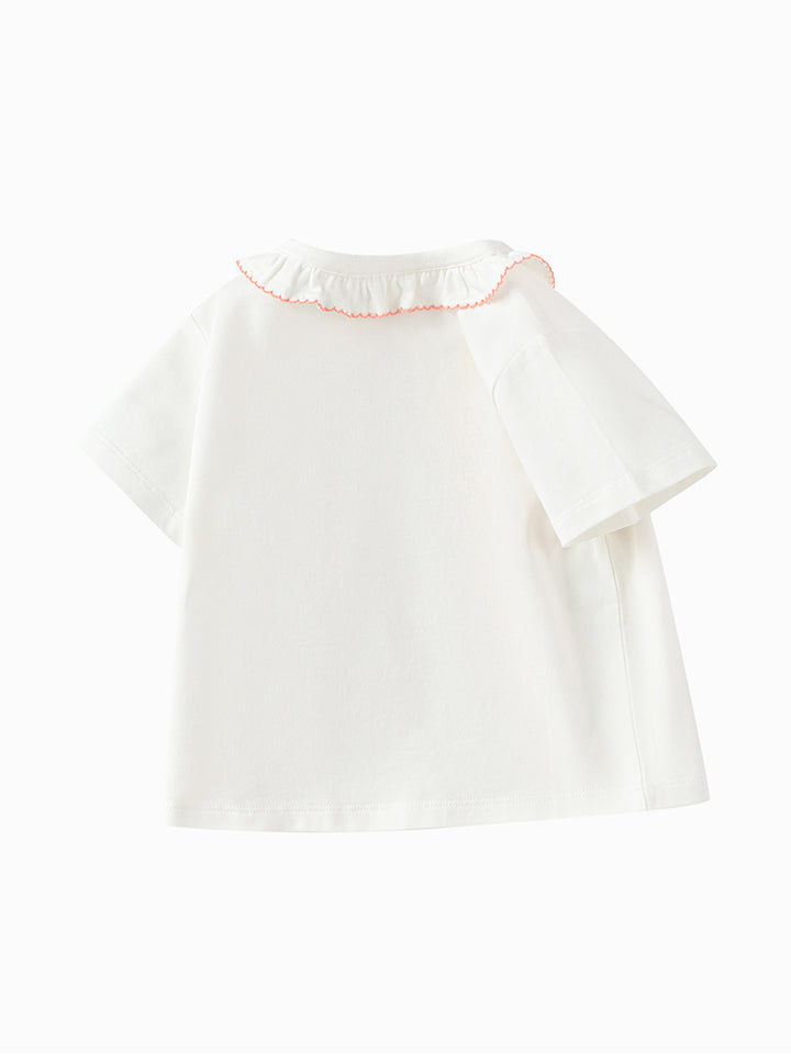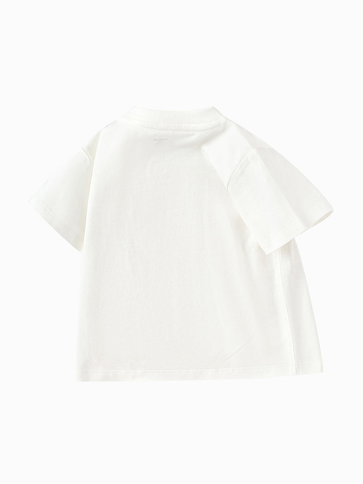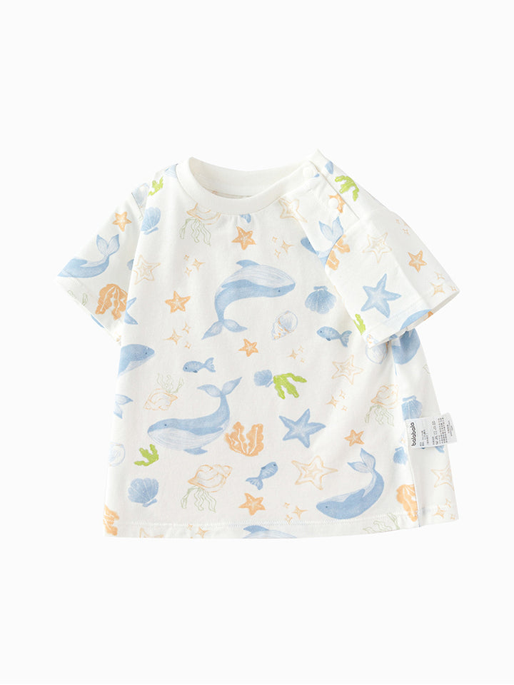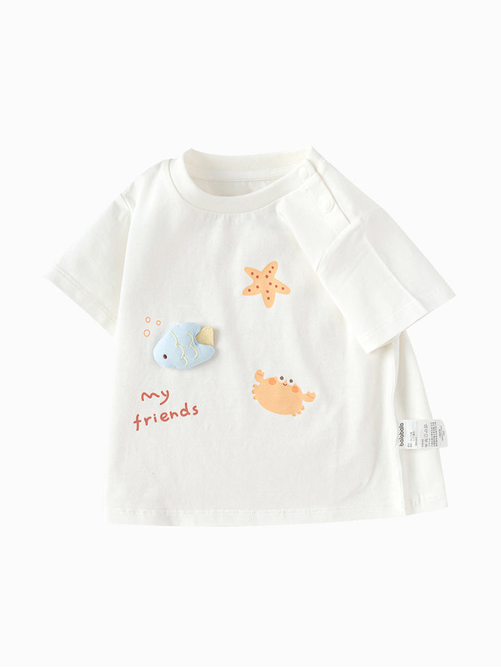 short sleeves t-shirt, decorated with a print on the front side, comes with buttons on one shoulder and with a rounded shape neckline