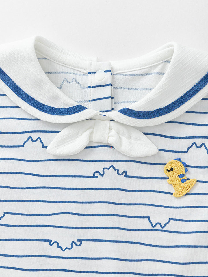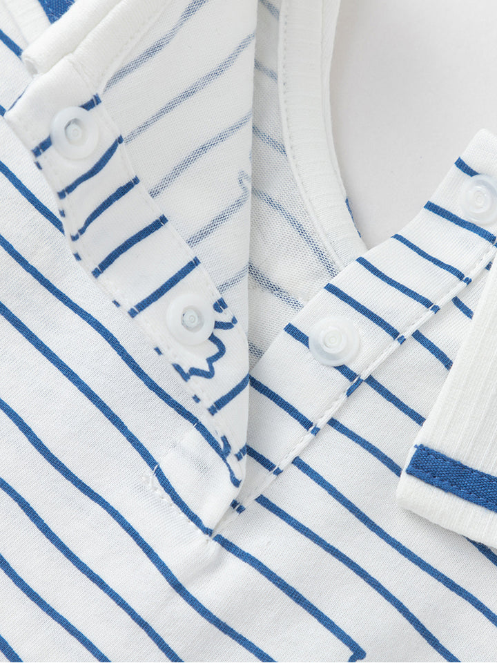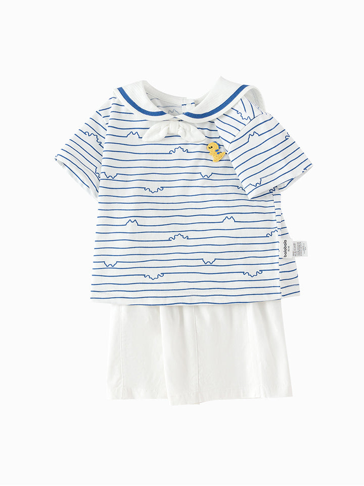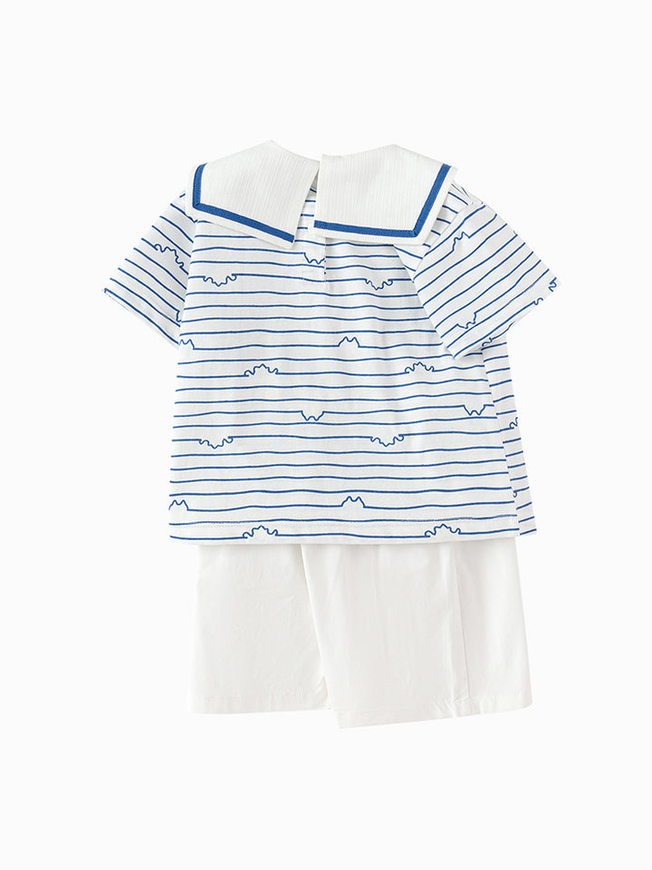 boys set of two pieces, a short sleeves top decorated with a striped pattern, comes with buttons on the back side and a classic regular collar, and a shorts in a solid mono colored pattern, comes with a comfy elasticated waistband