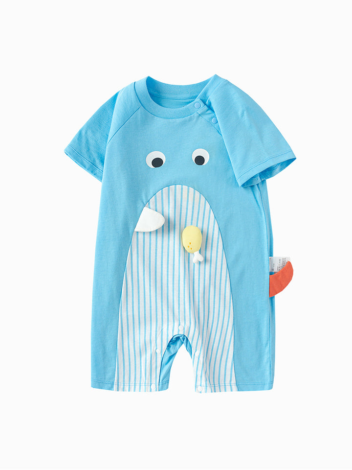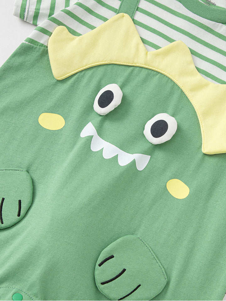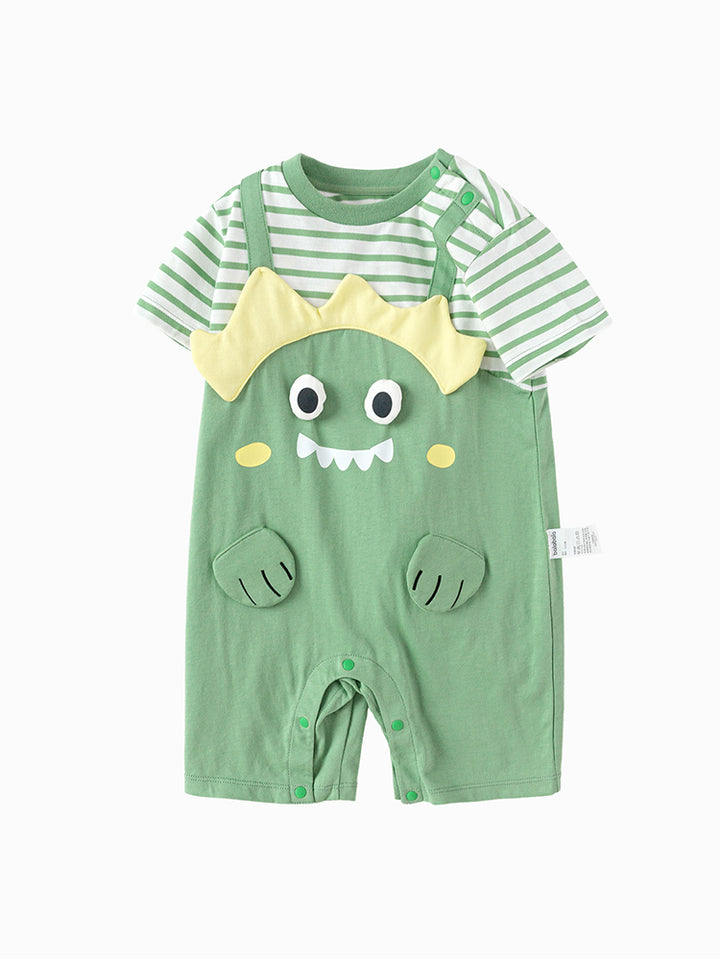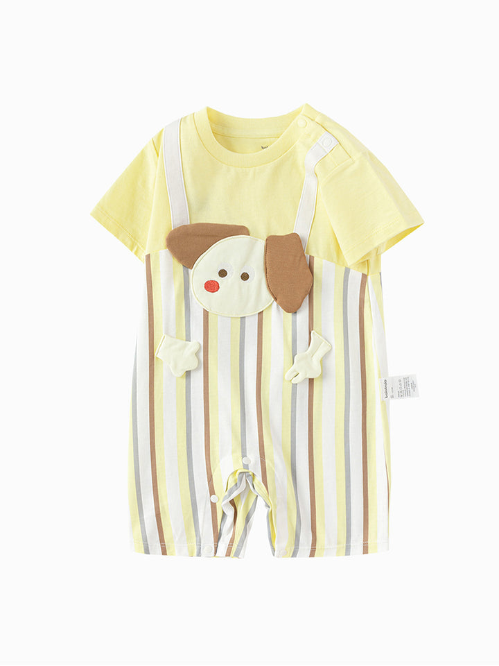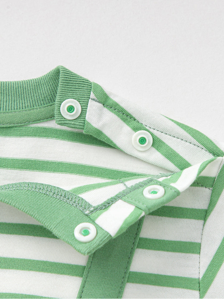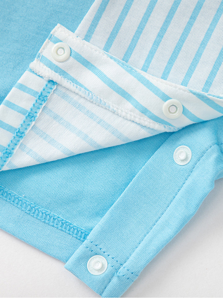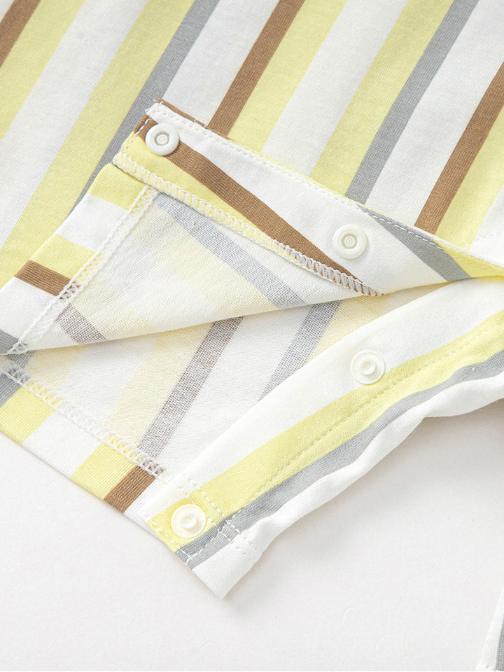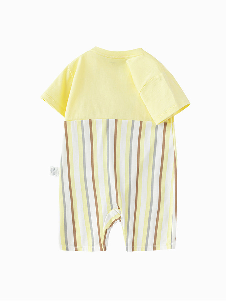 short sleeves bodysuit decorated with striped details on upper side and fun design on the front side, comes with bottom buttons and a rounded shape neckline