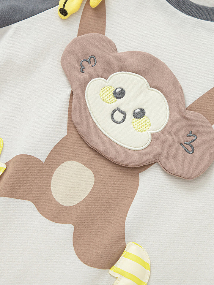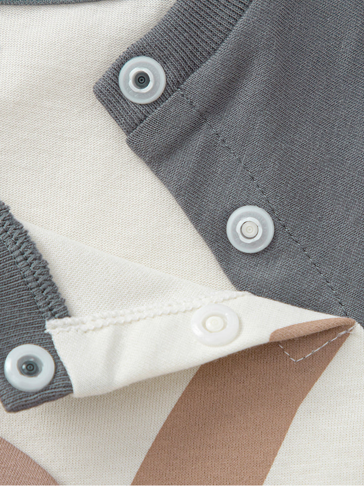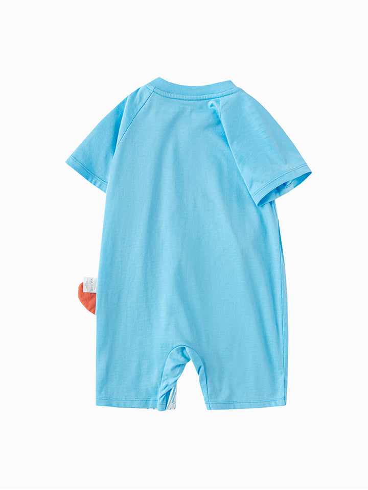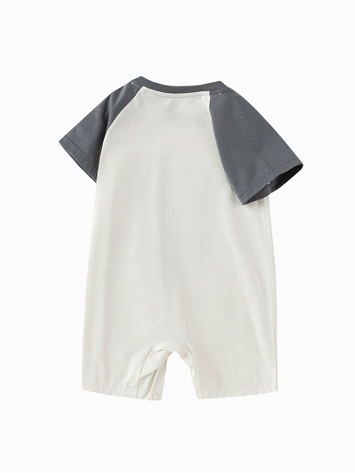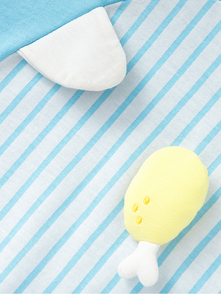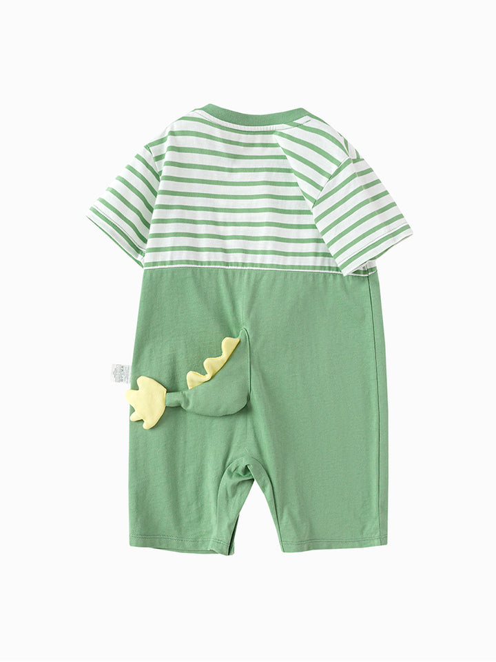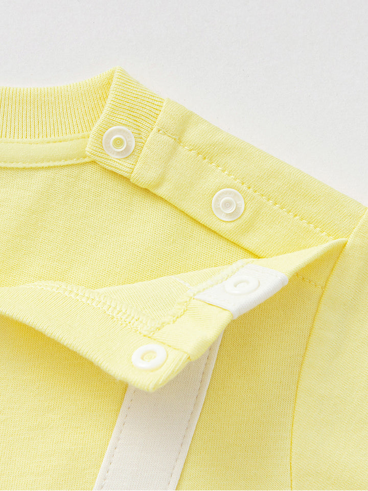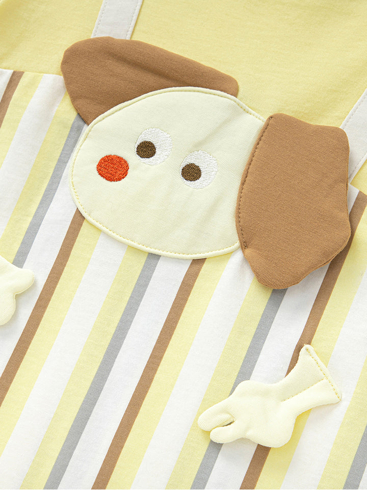 short sleeves bodysuit decorated with striped details on upper side and fun design on the front side, comes with bottom buttons and a rounded shape neckline