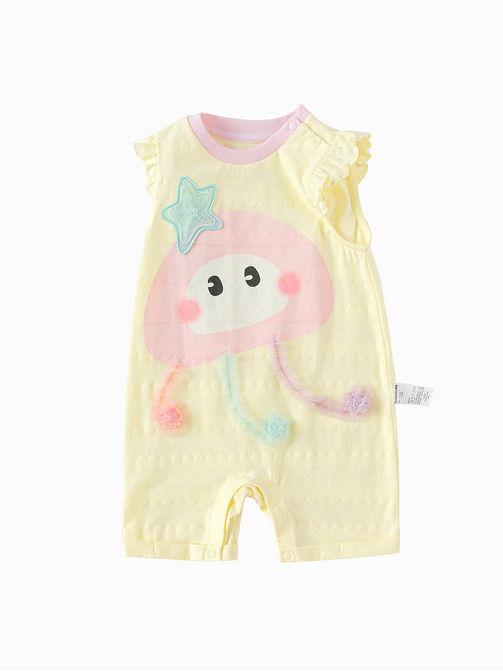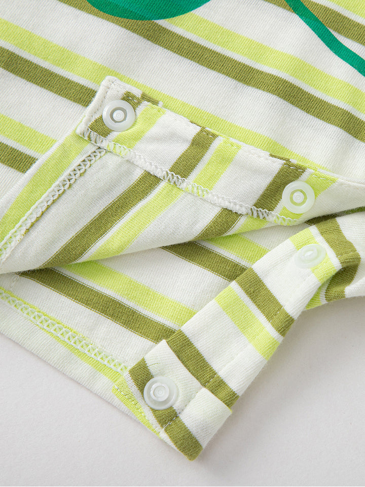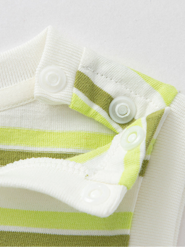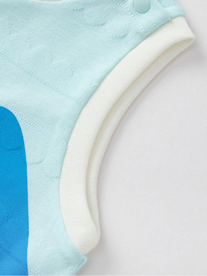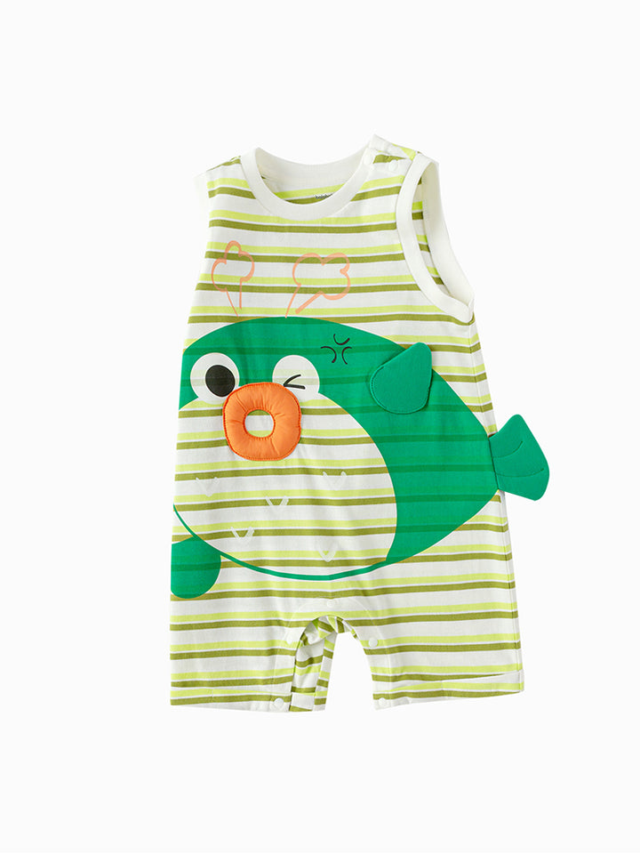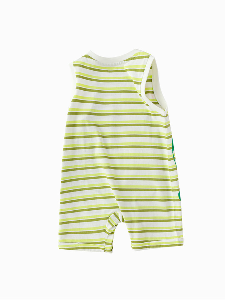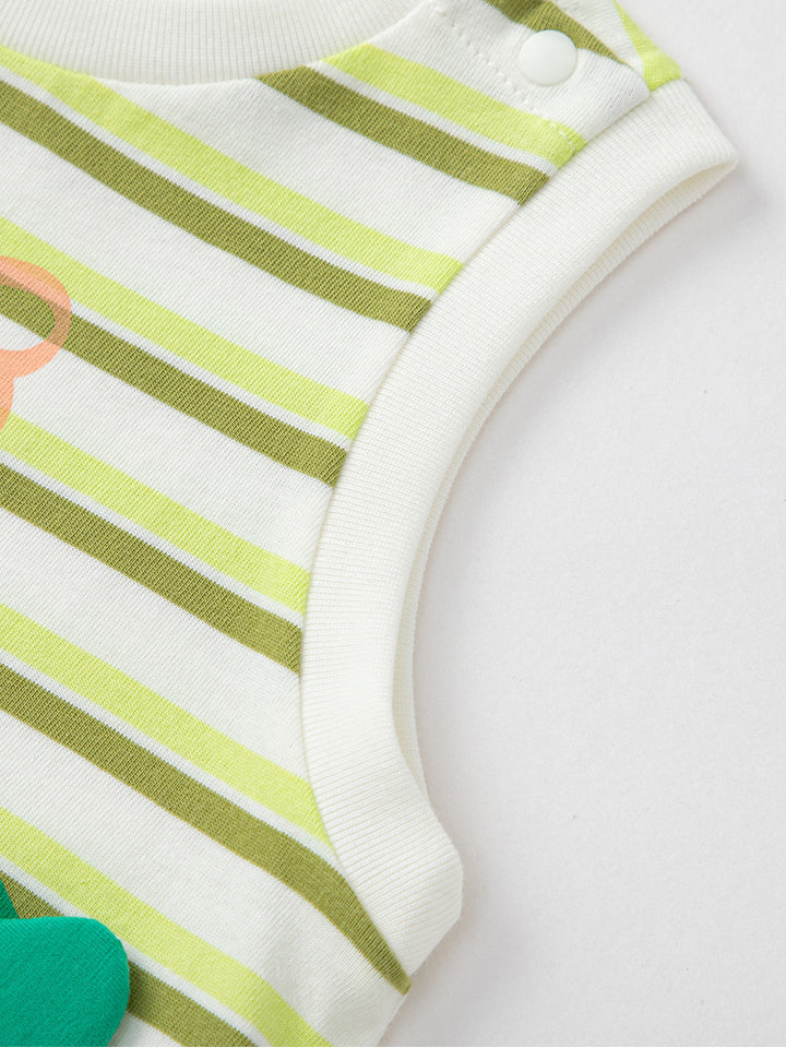 sleeveless bodysuit decorated with striped pattern and fun design on the front side, comes with bottom buttons and a rounded shape neckline