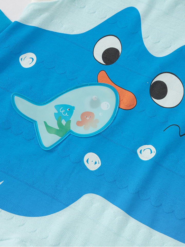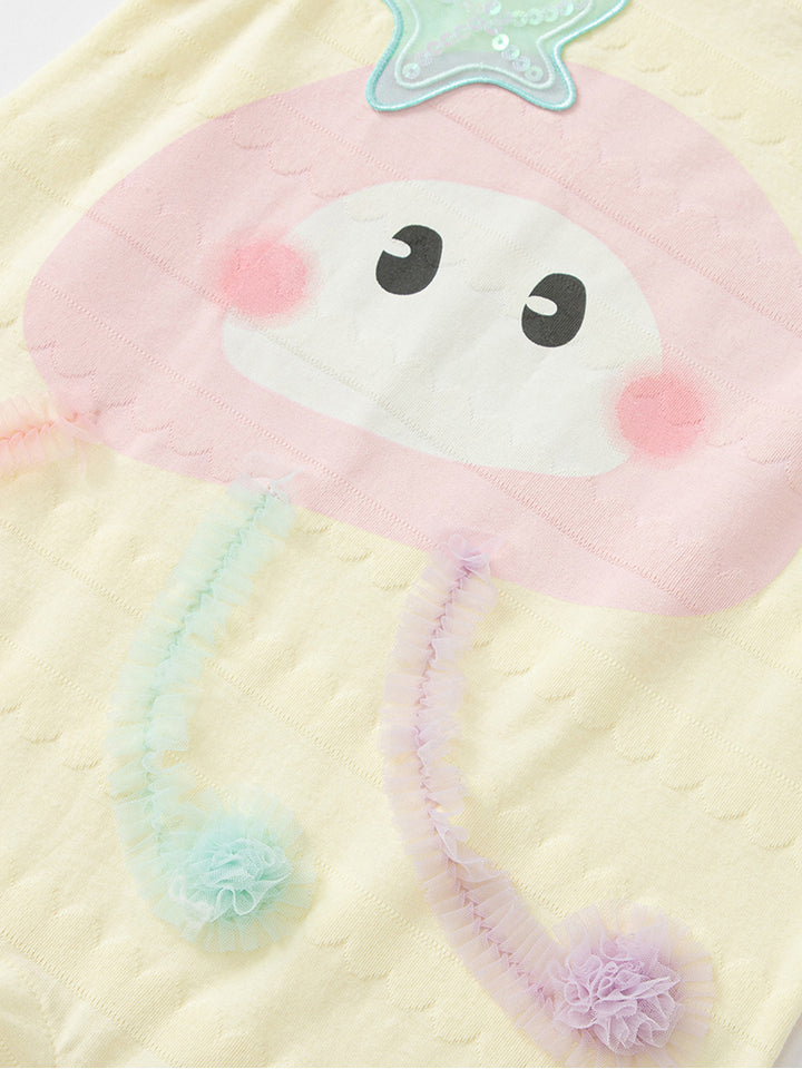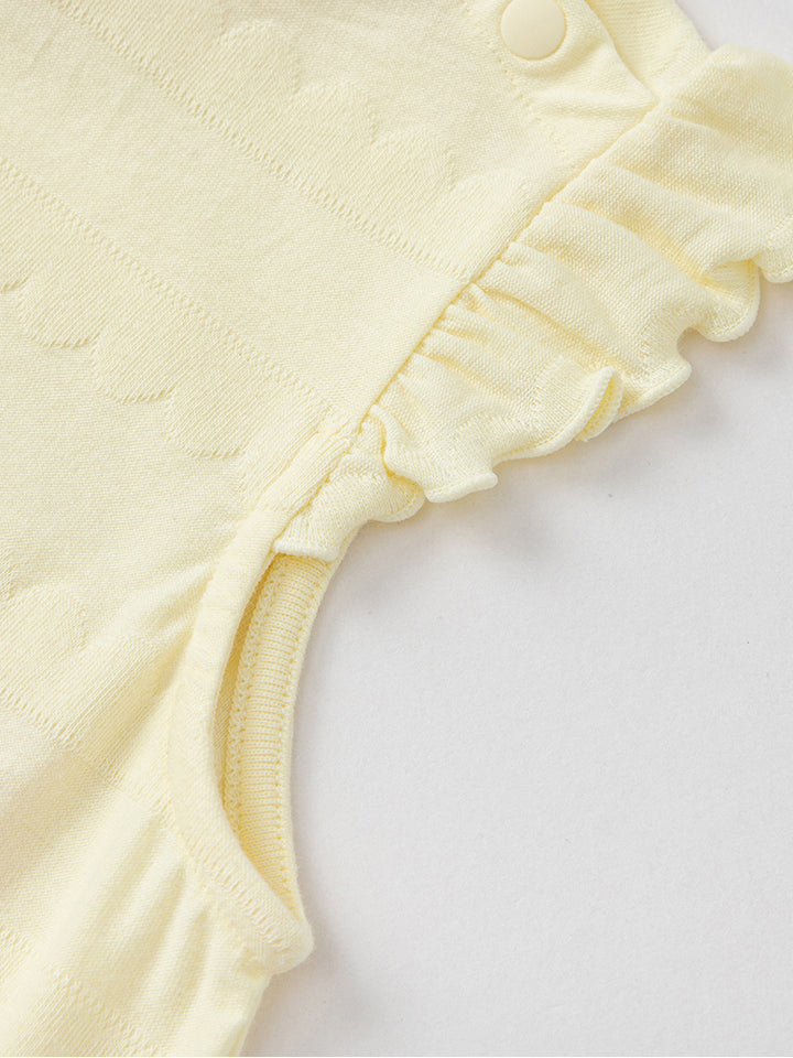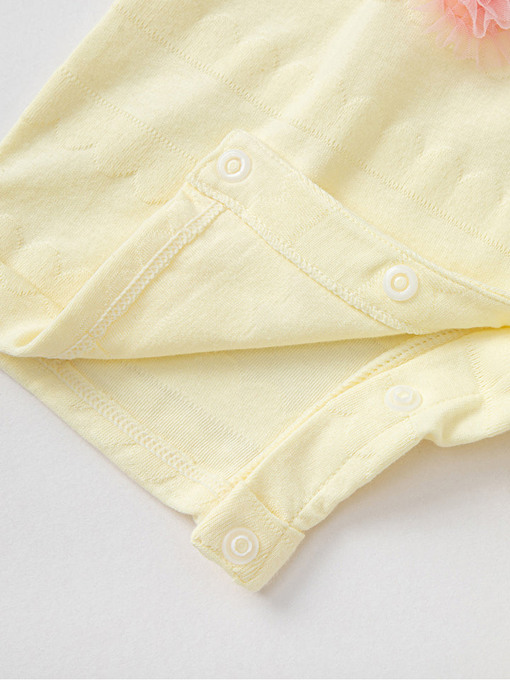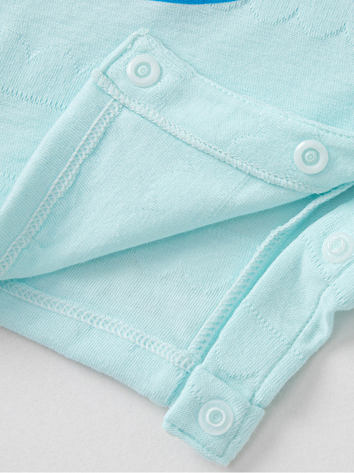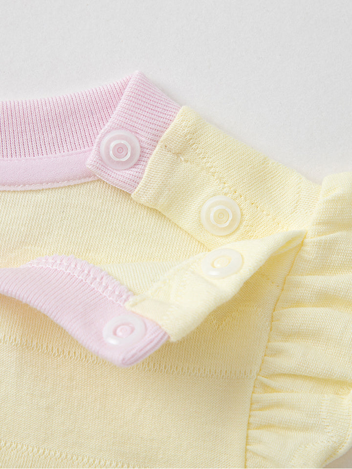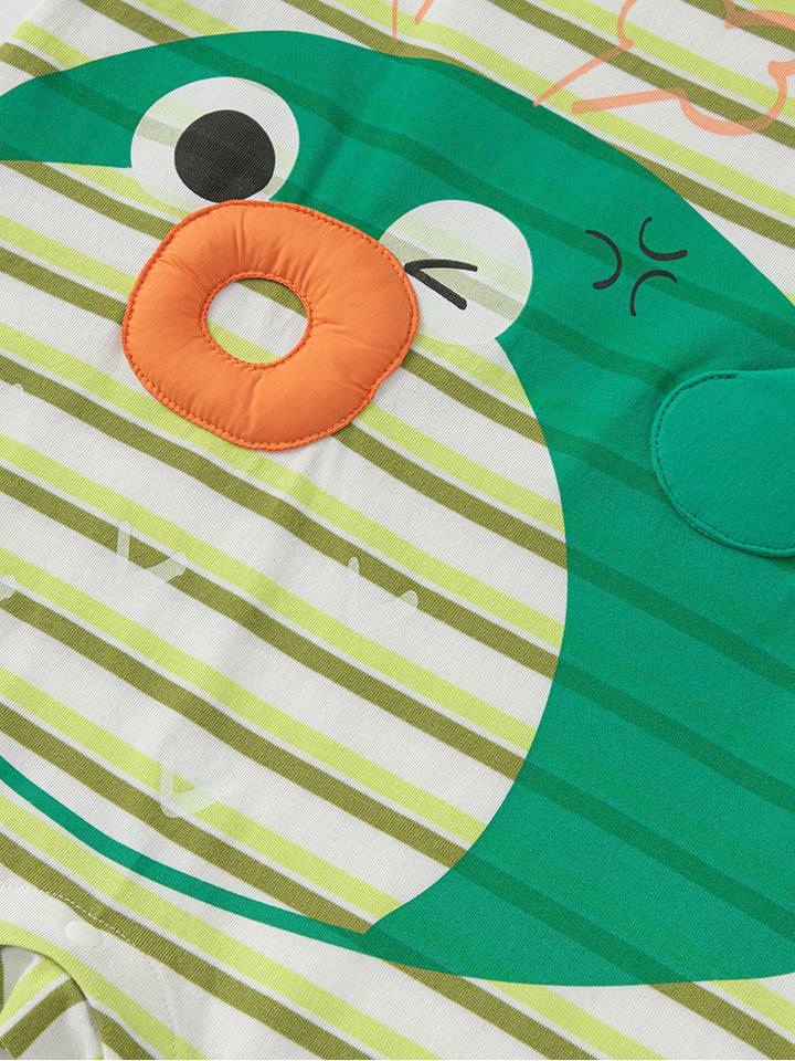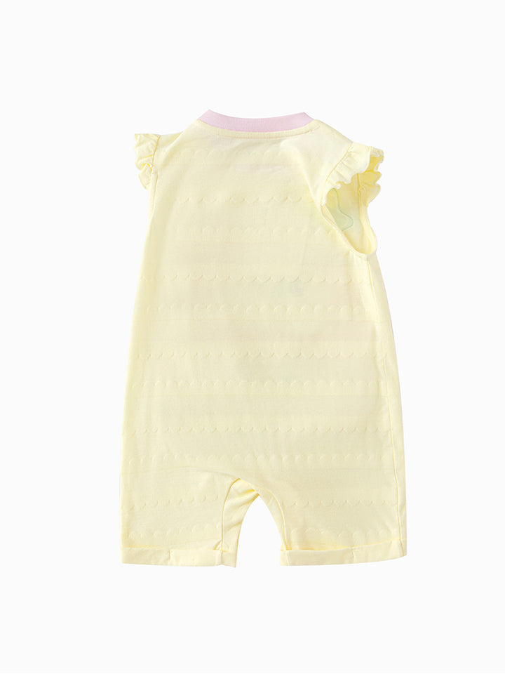 sleeveless bodysuit decorated with striped pattern and fun design on the front side, comes with bottom buttons and a rounded shape neckline