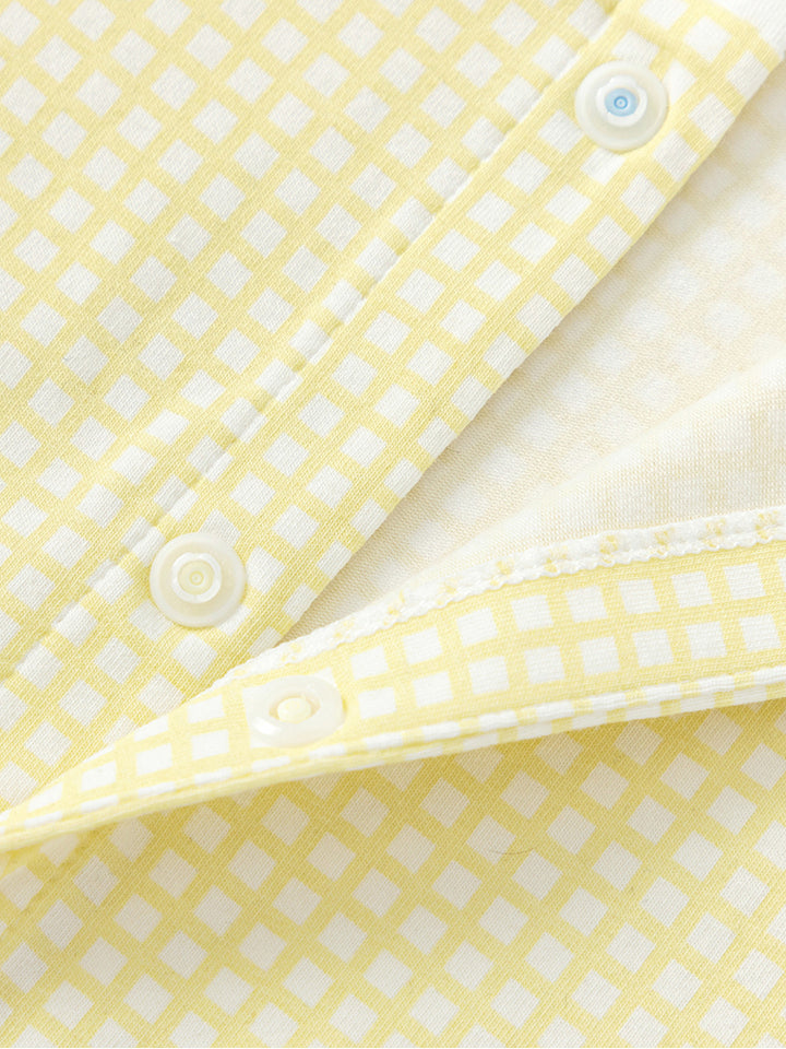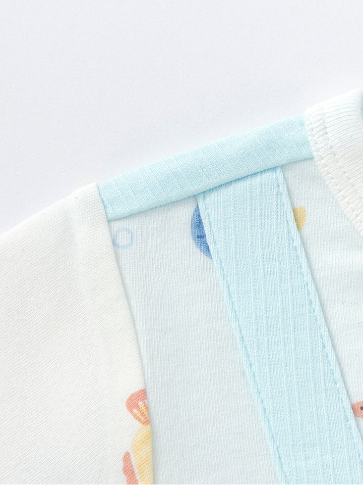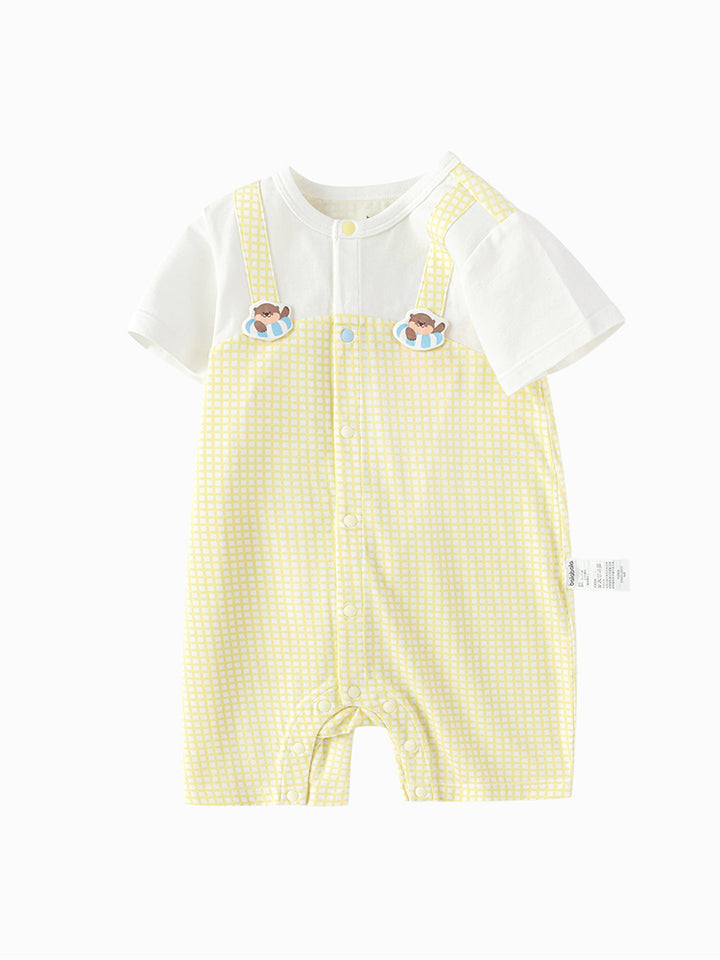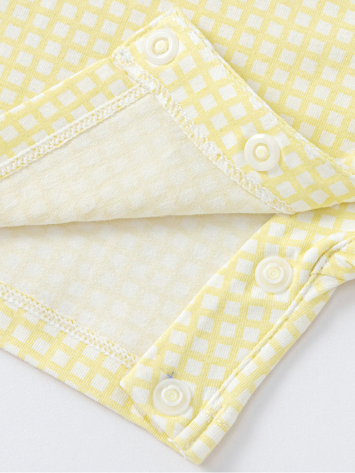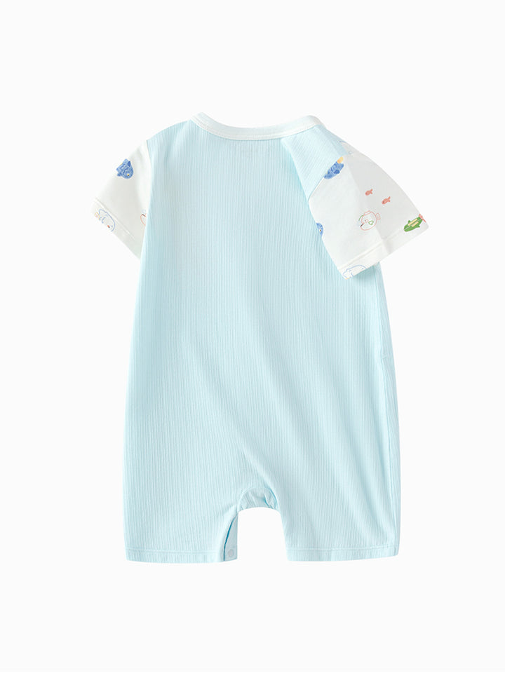 short sleeves bodysuit decorated with a colored printed pattern, comes with front buttons and a rounded shape neckline