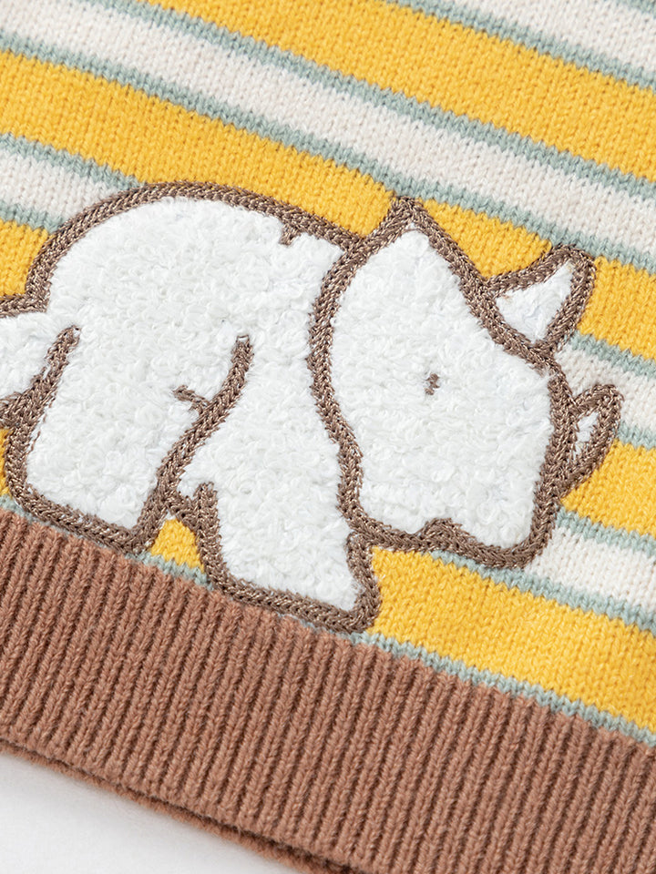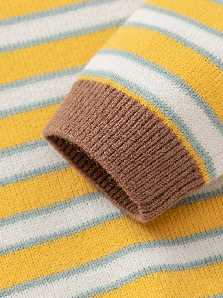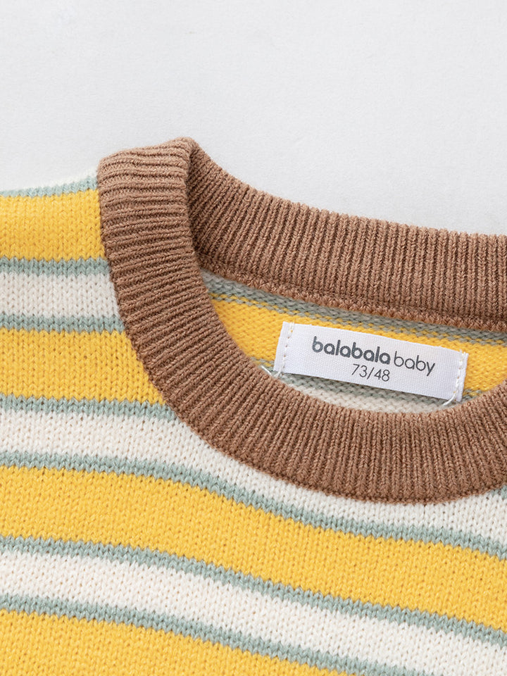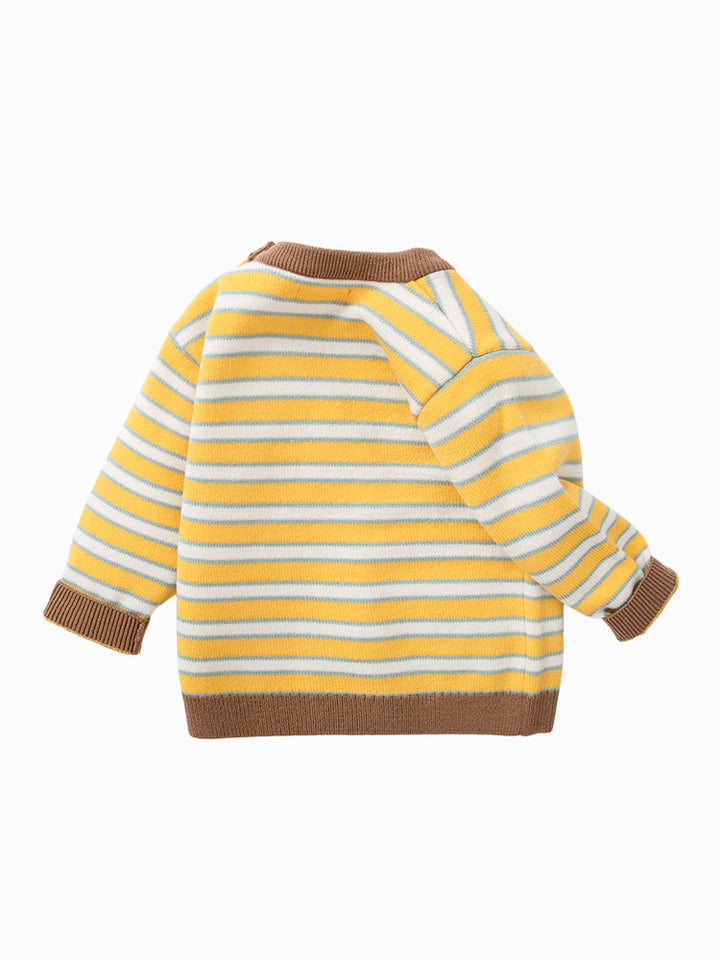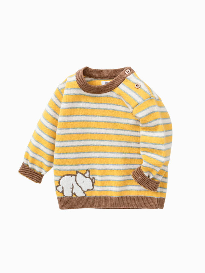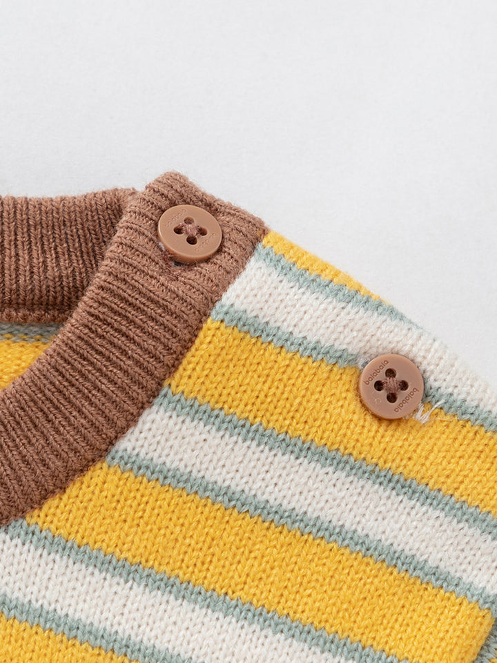 long sleeves baby boy sweater in a knitted fabric, decorated with striped pattern on full design, comes with buttons for closure on one shoulder and with a rounded shape neckline