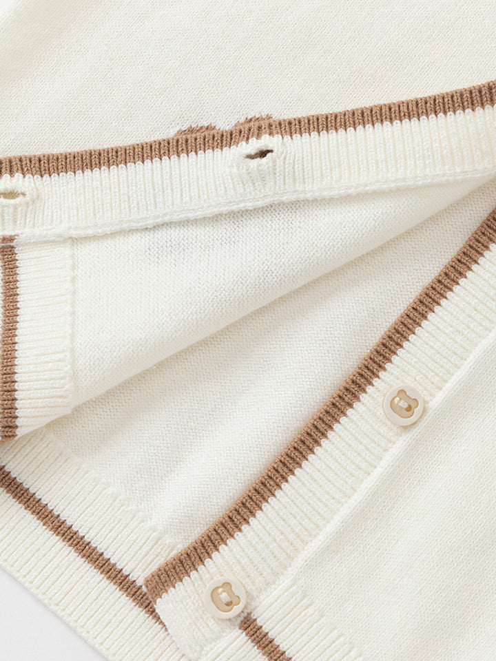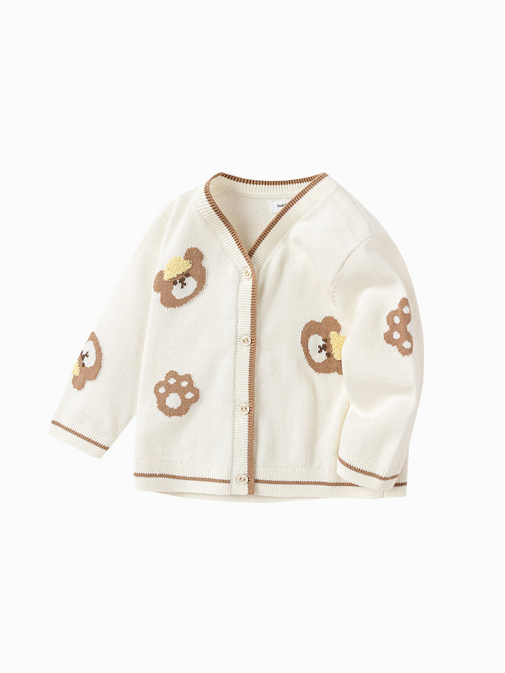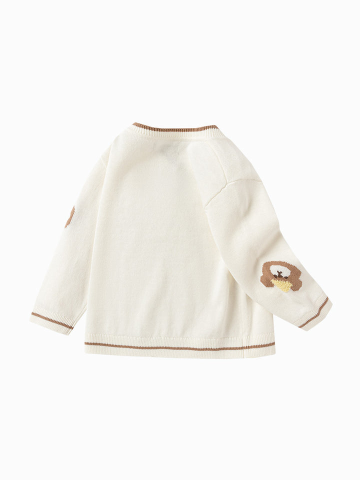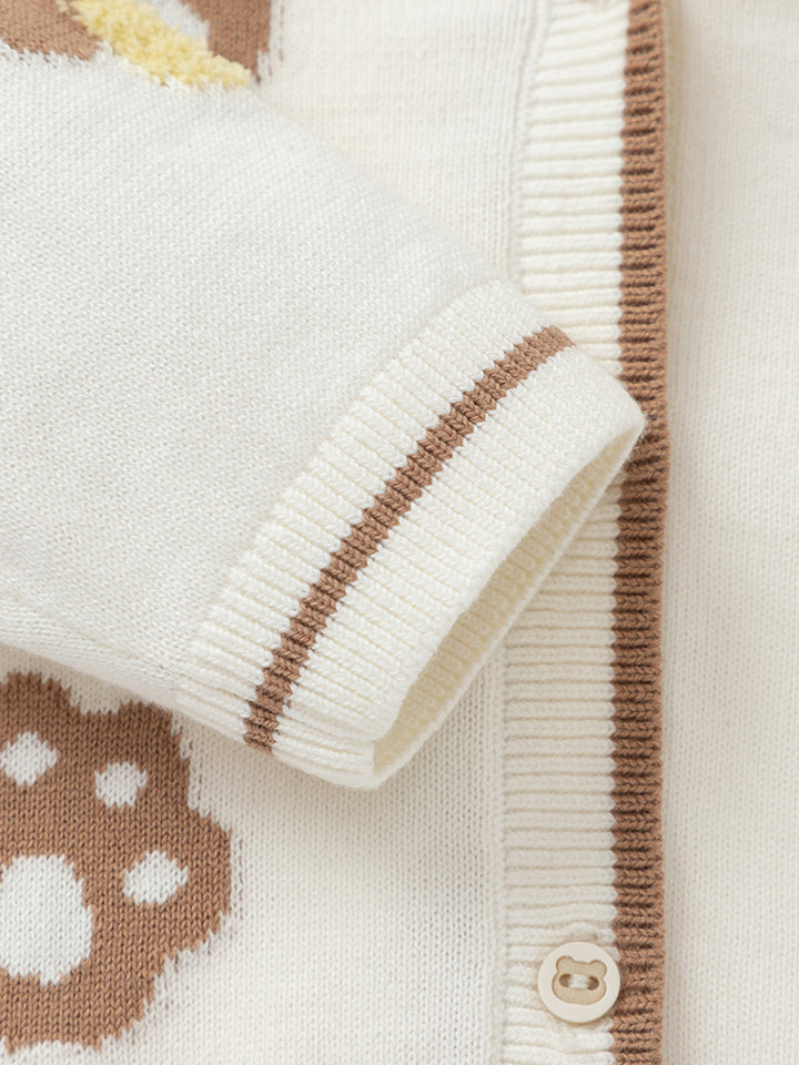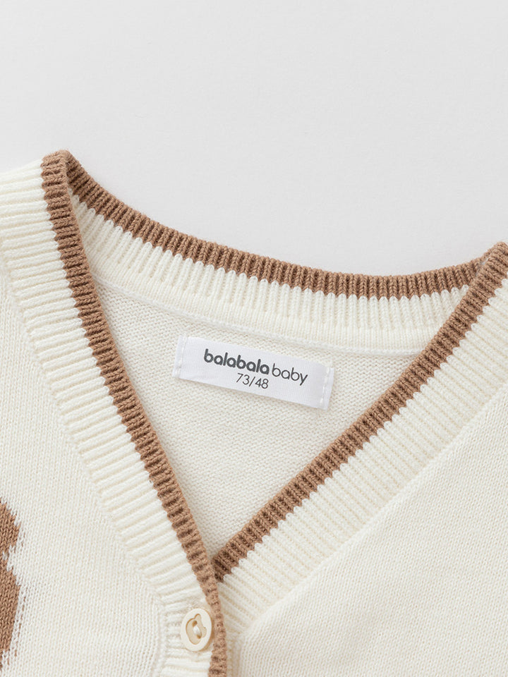 long sleeves knitted cardigan jacket, decorated with knitted prints on the front side and on sleeves, comes with buttons for closure on the front side and with a V shape collar