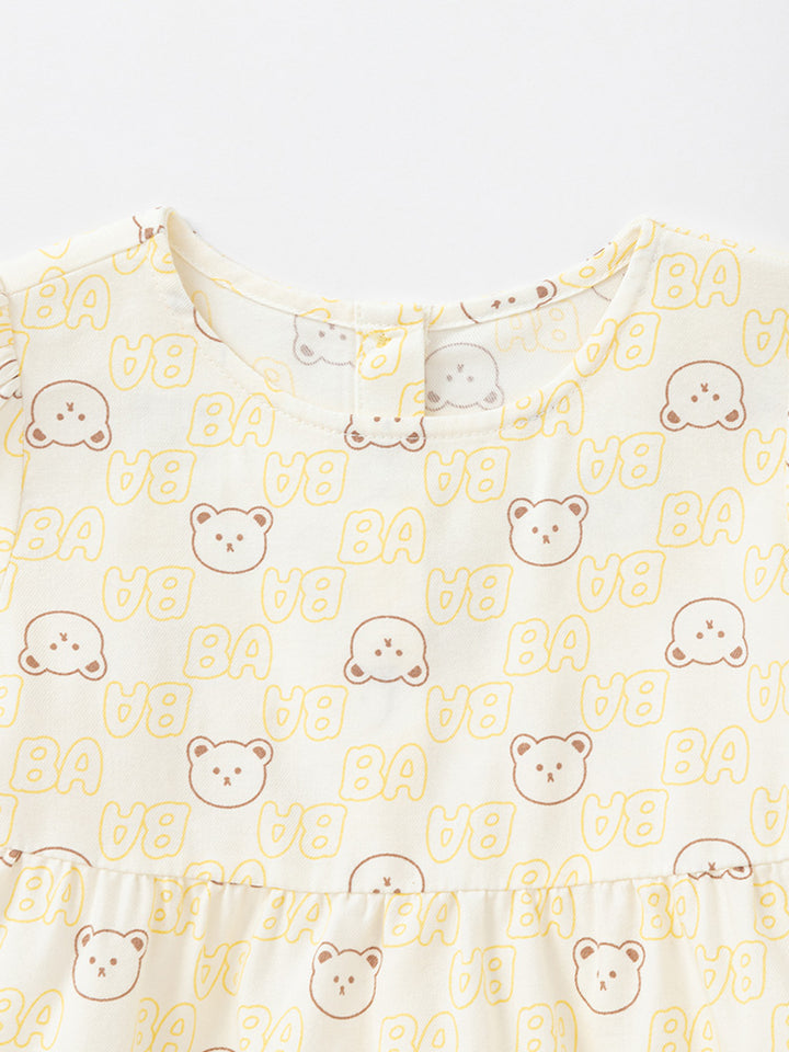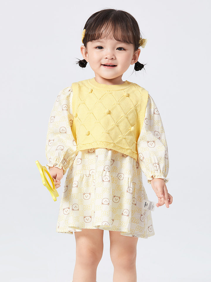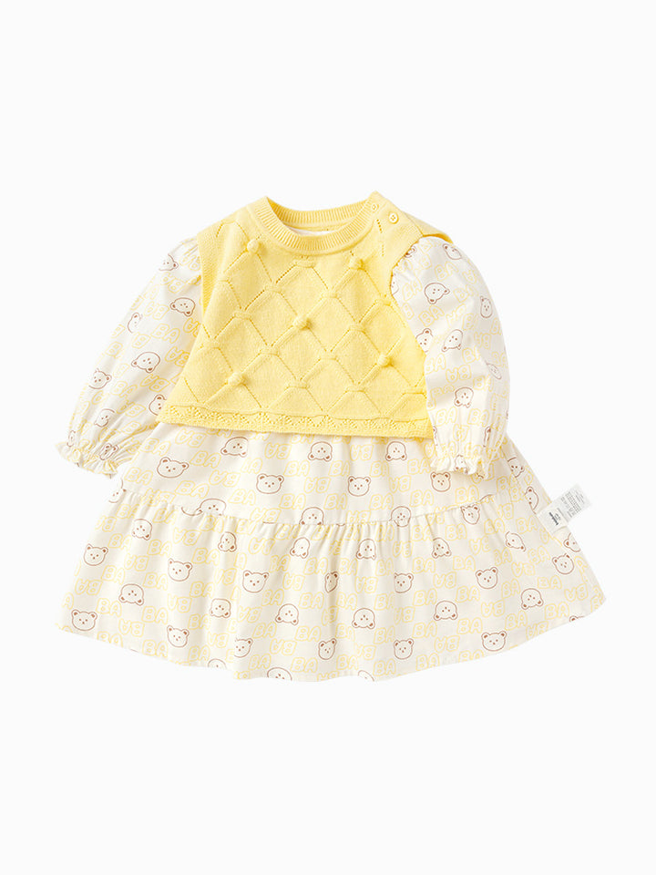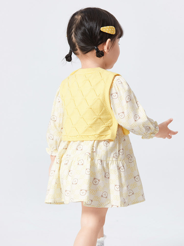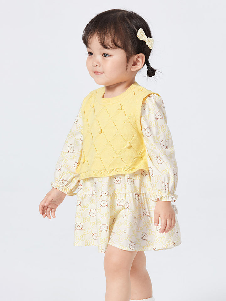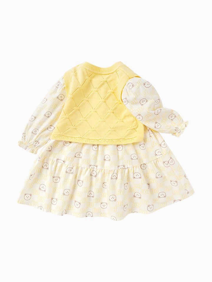baby dress set of two pieces, a sleeveless textured pattern knitted vest in a solid mono colored pattern, and a long sleeves dress decorated with a printed pattern, comes with buttons for closure on the back side and with a rounded shape collar