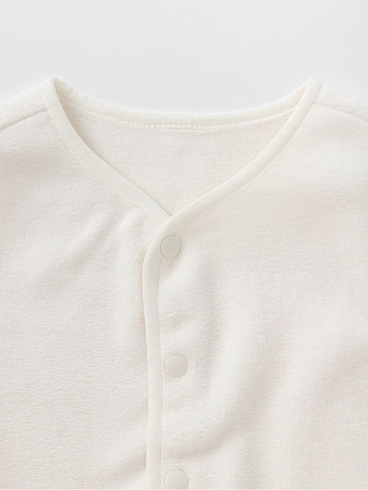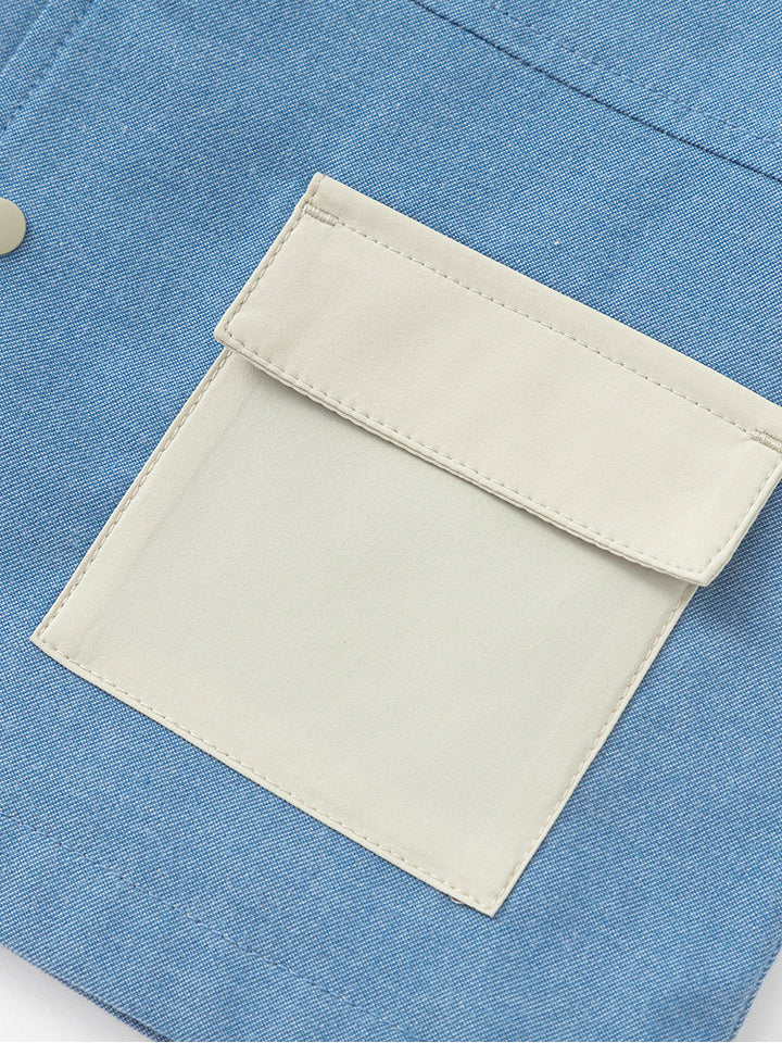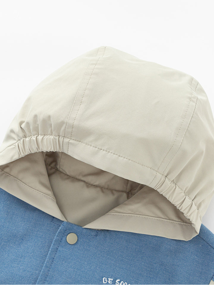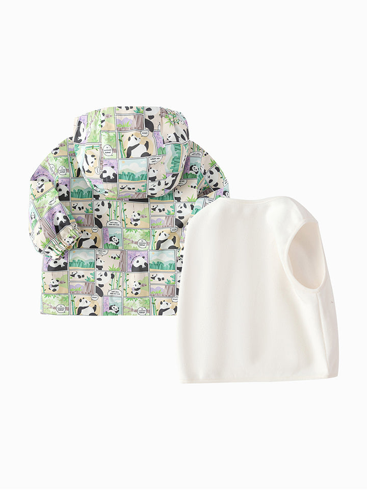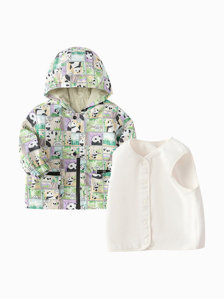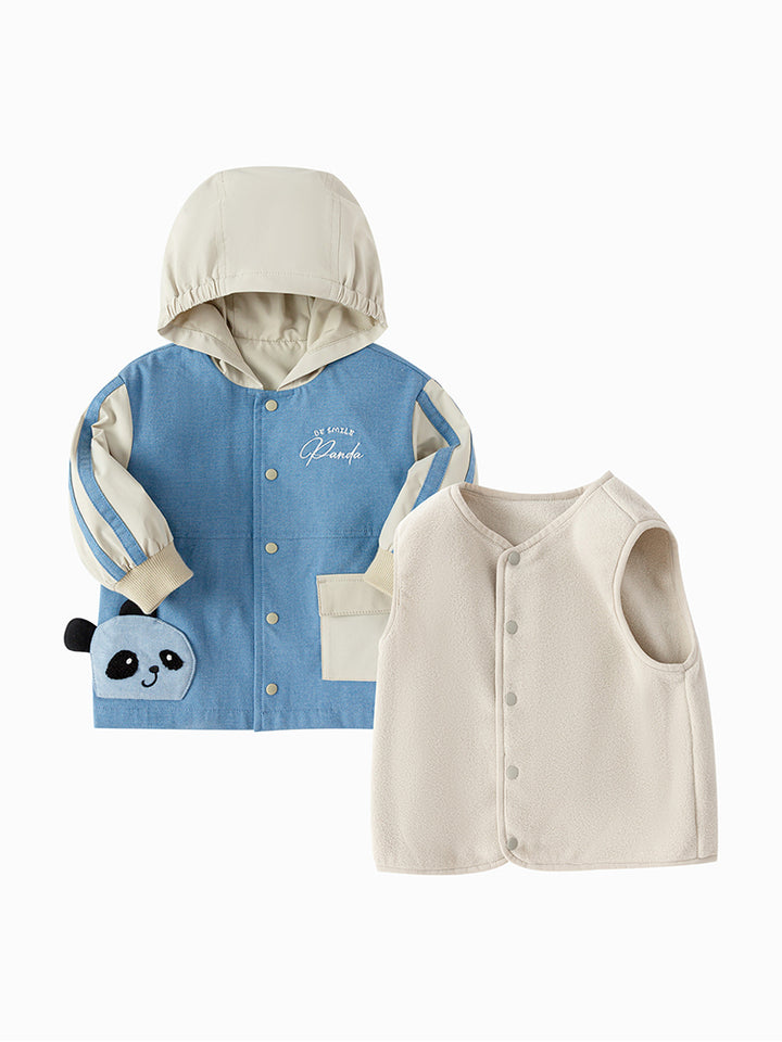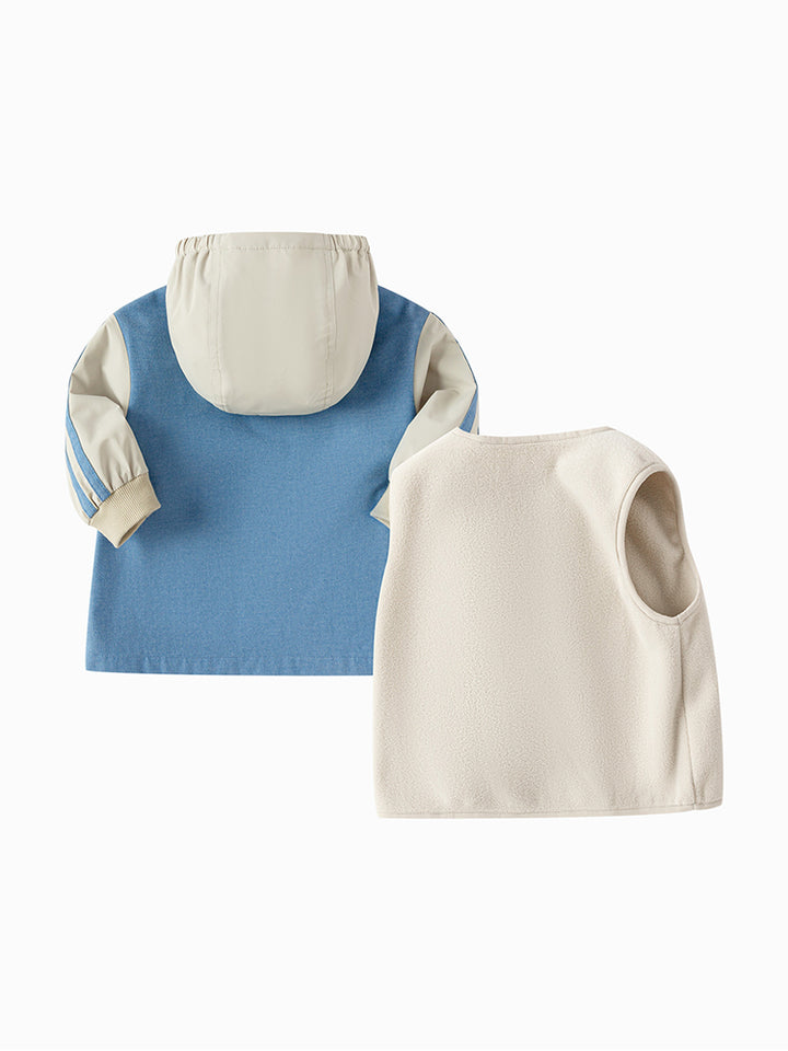 long sleeves boy winter jacket, decorated with contrast pattern, comes with pockets and buttons for closure and comes with internal vest in a solid colored pattern with buttons for closure