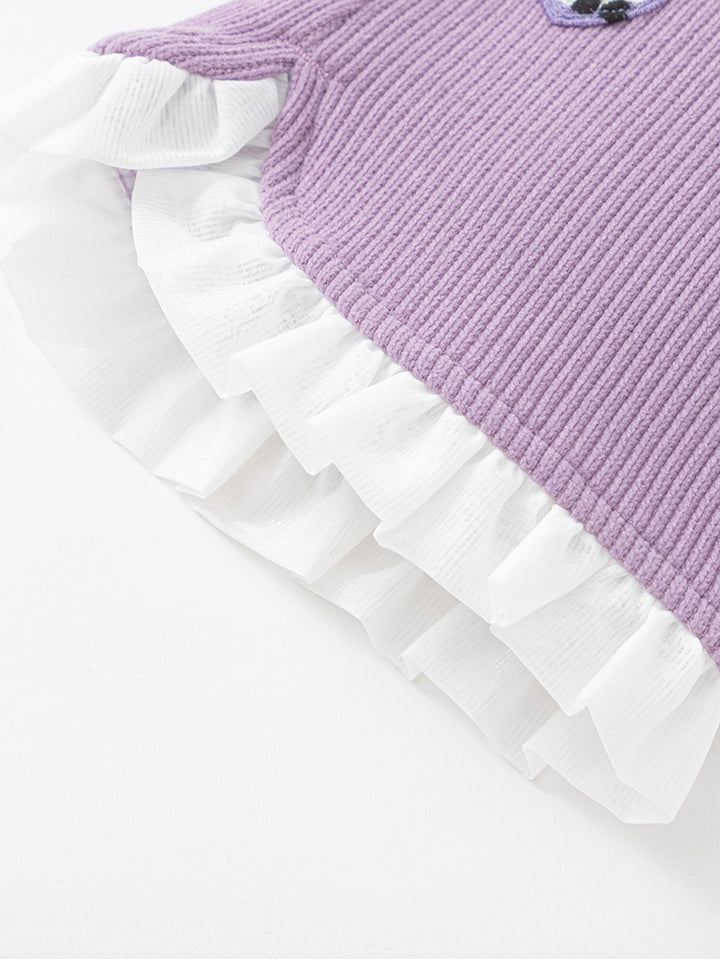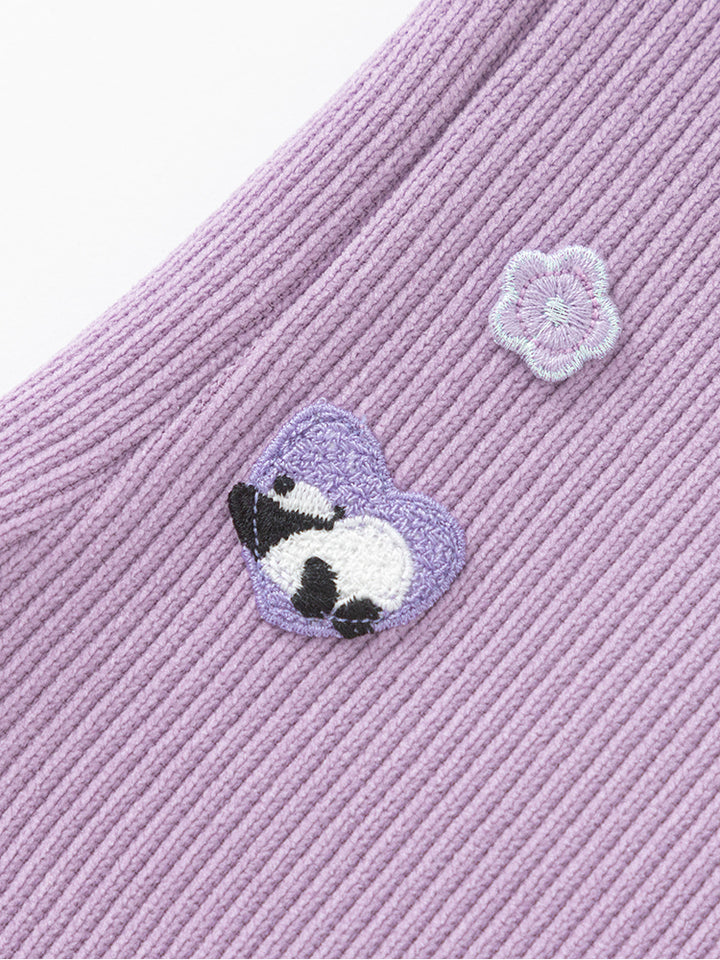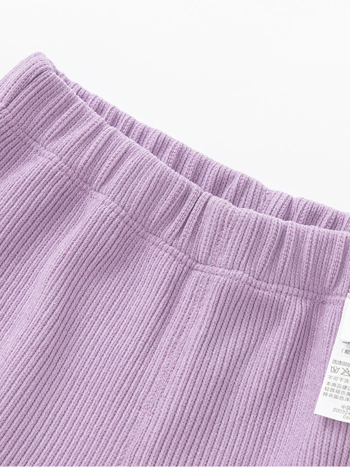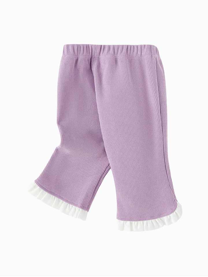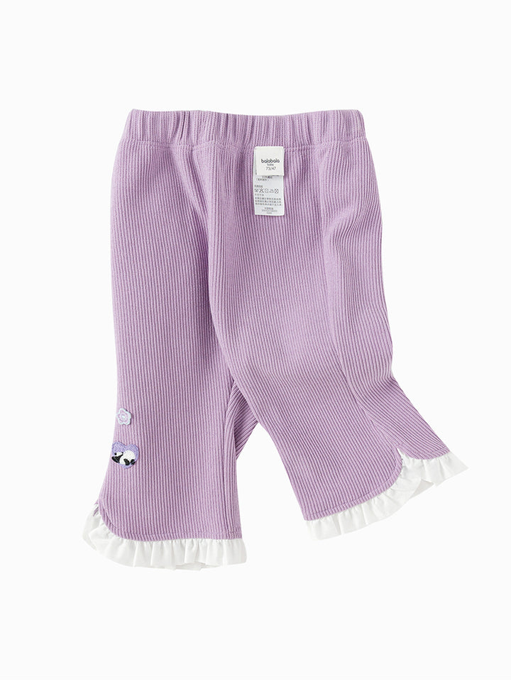 girl pants in a textured pattern fabric, decorated with ruffled and embroidery details, comes with an elasticated waistband