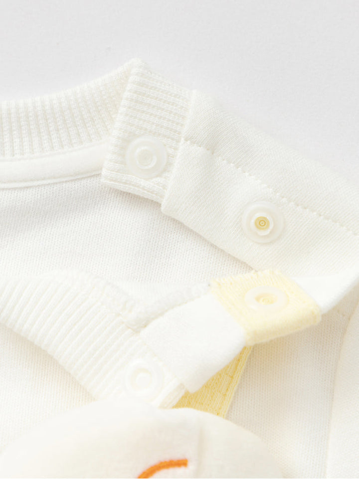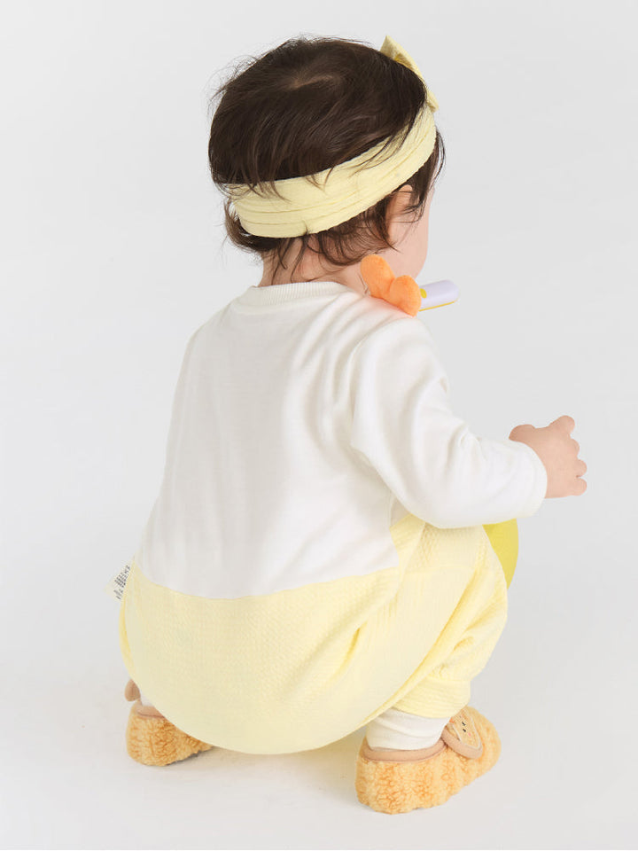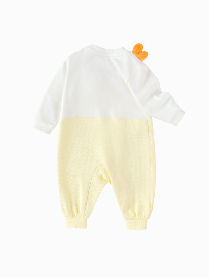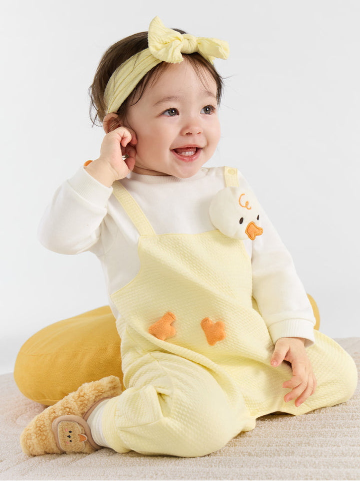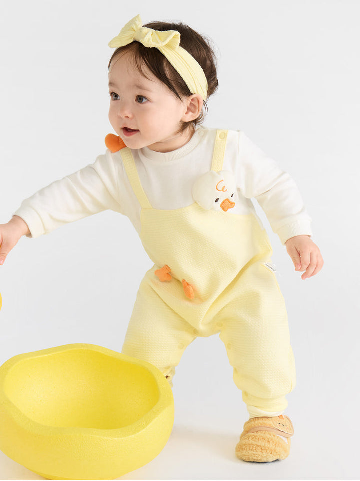 A cheerful bodysuit designed with playful character details on the front and shoulder paired with overall style straps Made from soft comfortable fabric and finished with snap closures for easy dressing it blends fun design with everyday practicality.