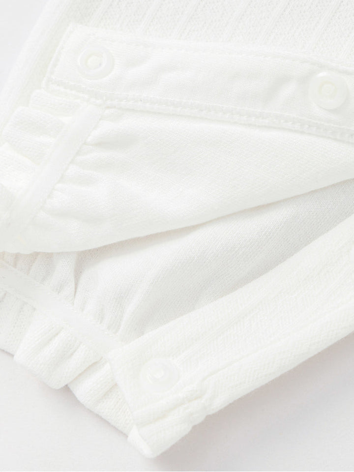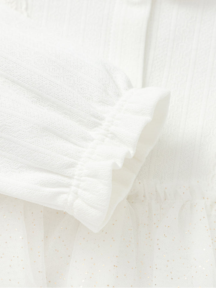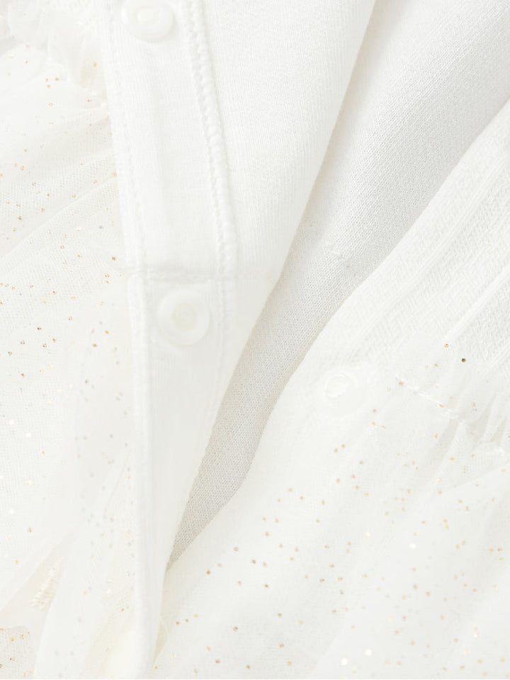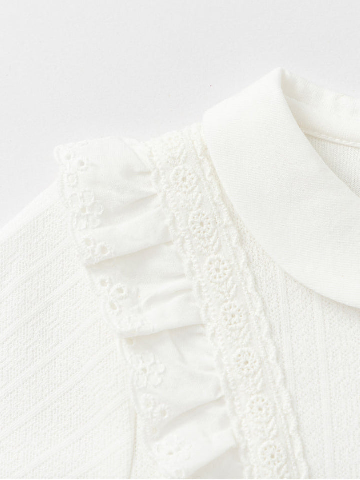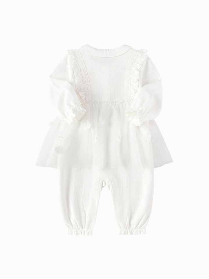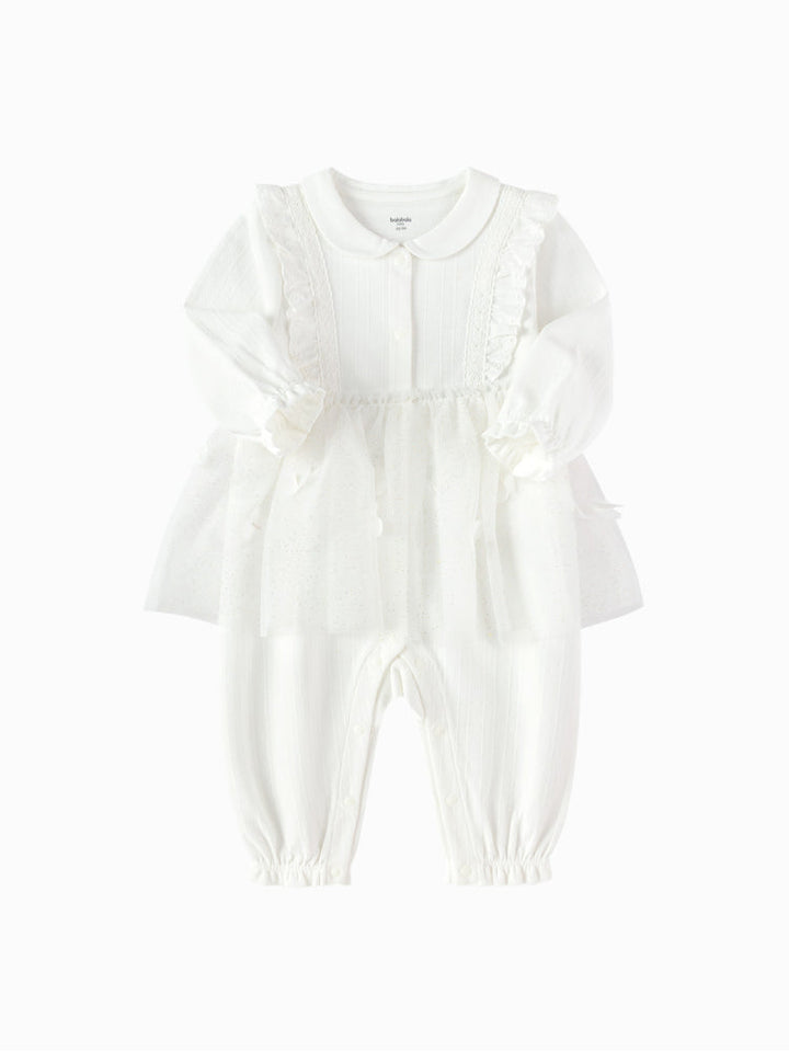 An elegant bodysuit featuring delicate lace trims along the front and soft layered tulle for a graceful touch Designed with a peter pan collar and elasticated cuffs it offers both refined style and all day comfort with practical snap closures for easy dressing.