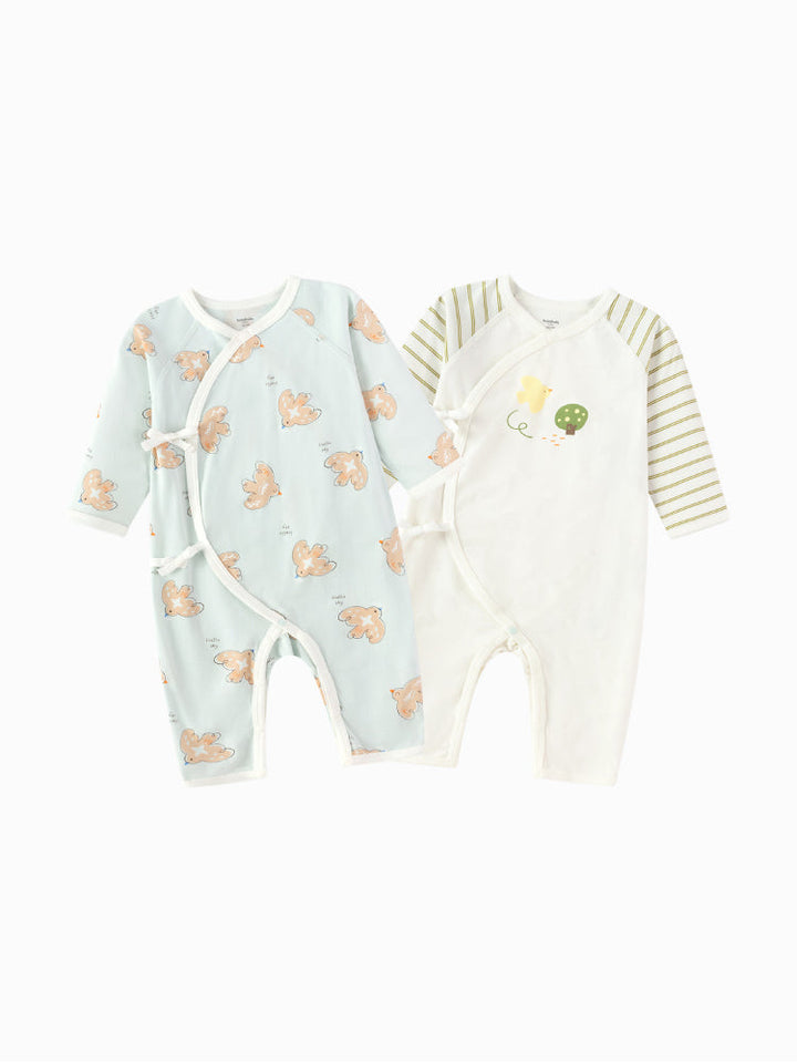 A practical set of two wrap style bodysuits featuring different patterns Designed from soft fabric for comfort and ease each piece is finished with snap closures for quick dressing and changing making them ideal for everyday wear.