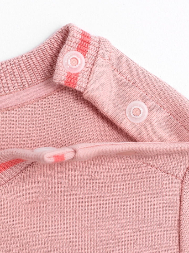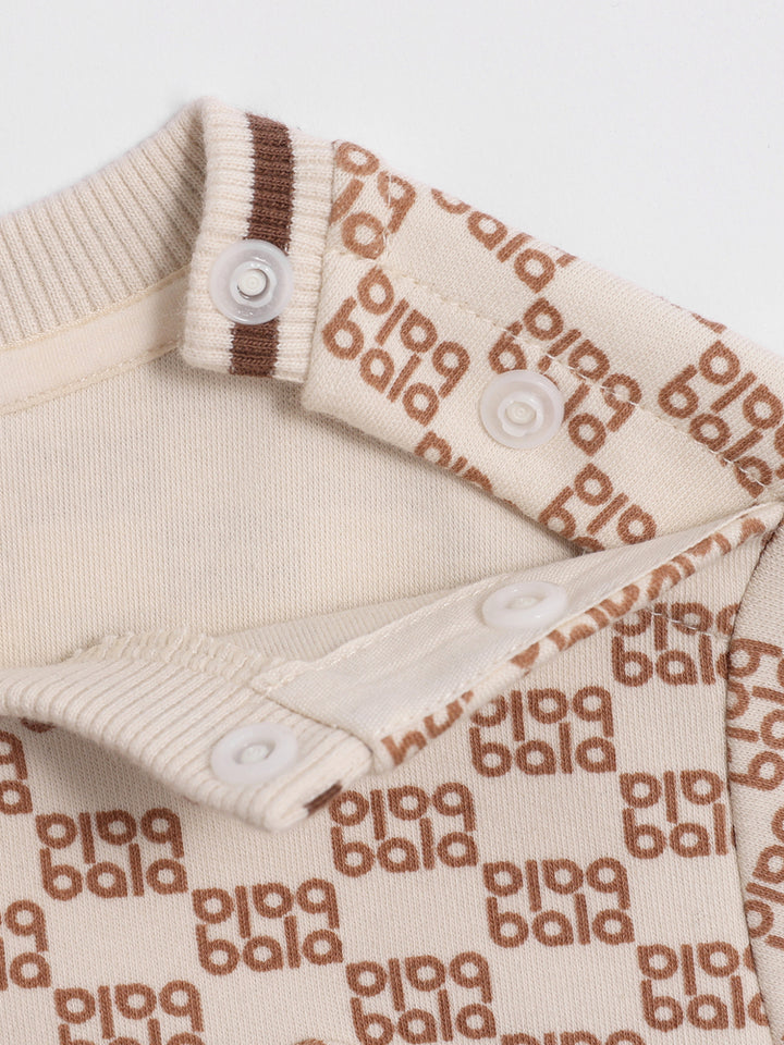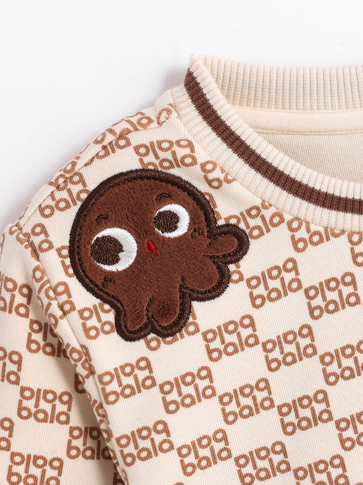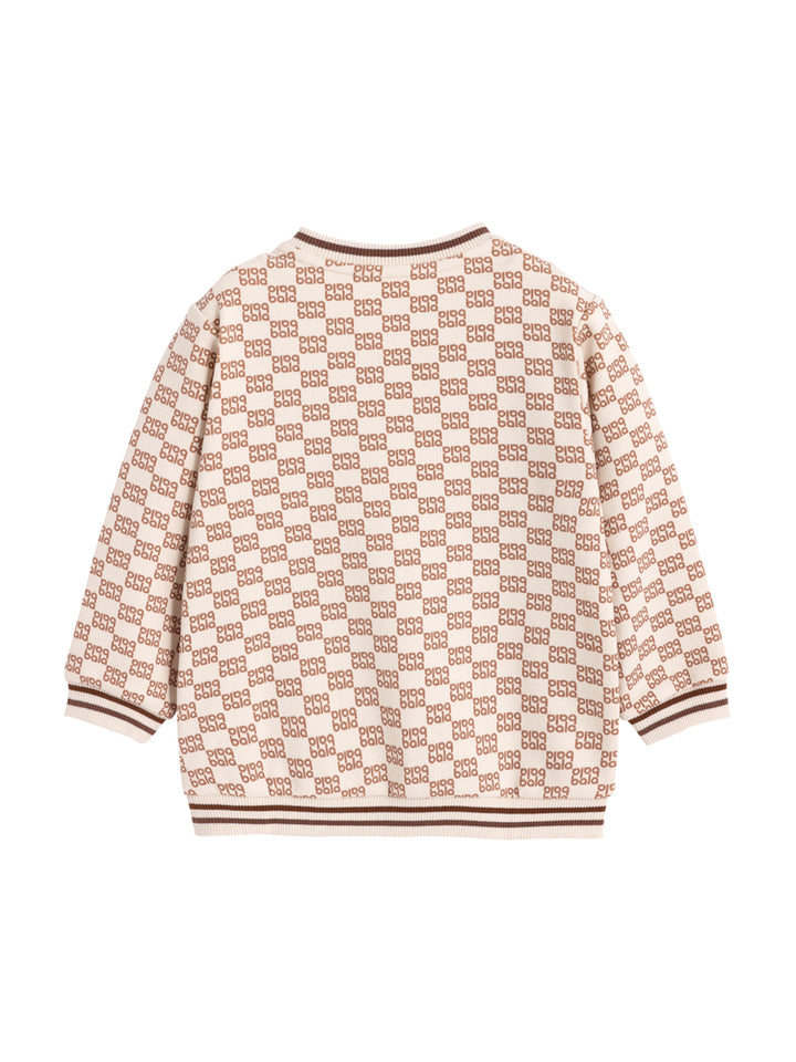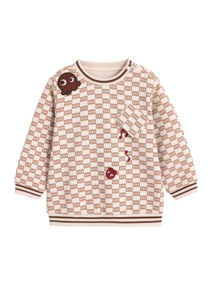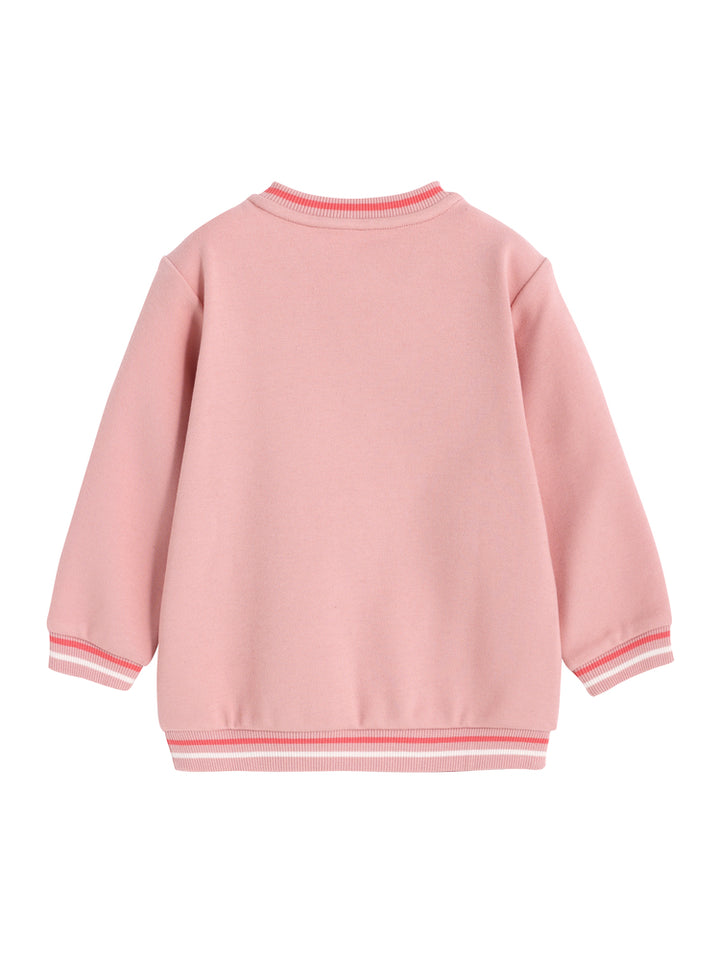 long sleeves baby sweatshirt, decorated with a printed pattern on full design and pocket detail on the front side, comes with push buttons for closure on one shoulder and with a rounded shape neckline