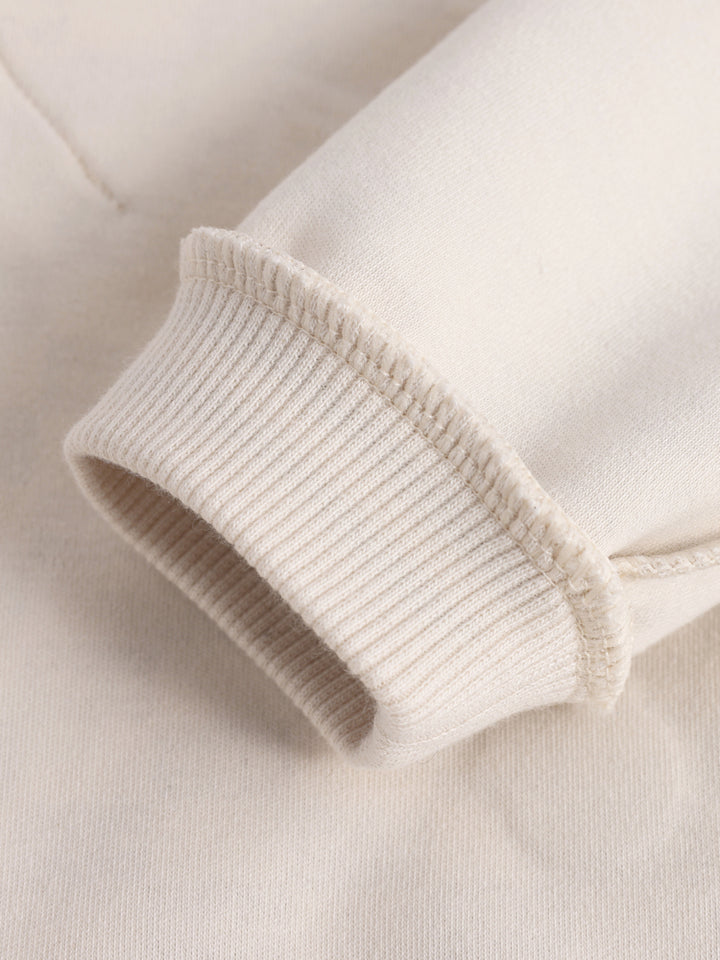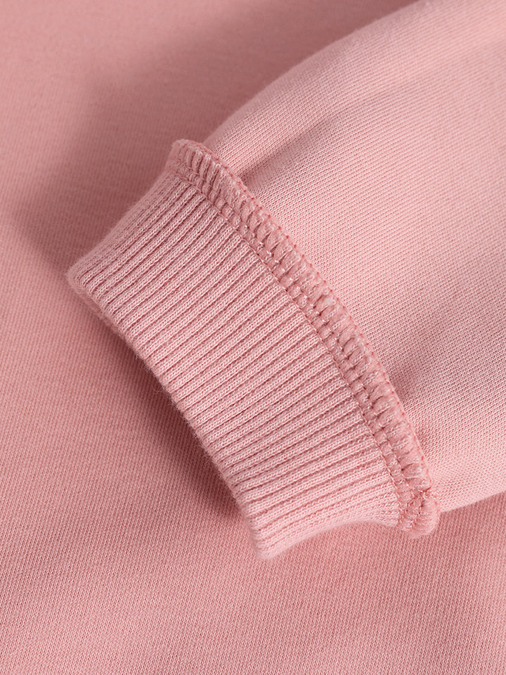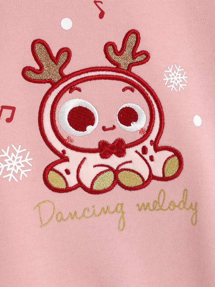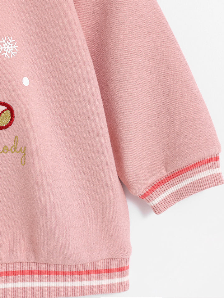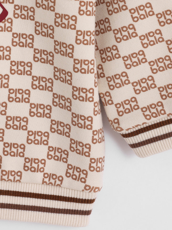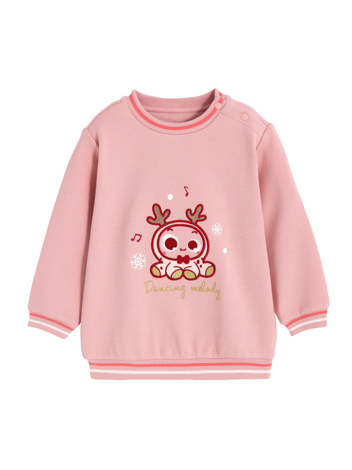 long sleeves baby sweatshirt, decorated with a printed pattern on full design and pocket detail on the front side, comes with push buttons for closure on one shoulder and with a rounded shape neckline