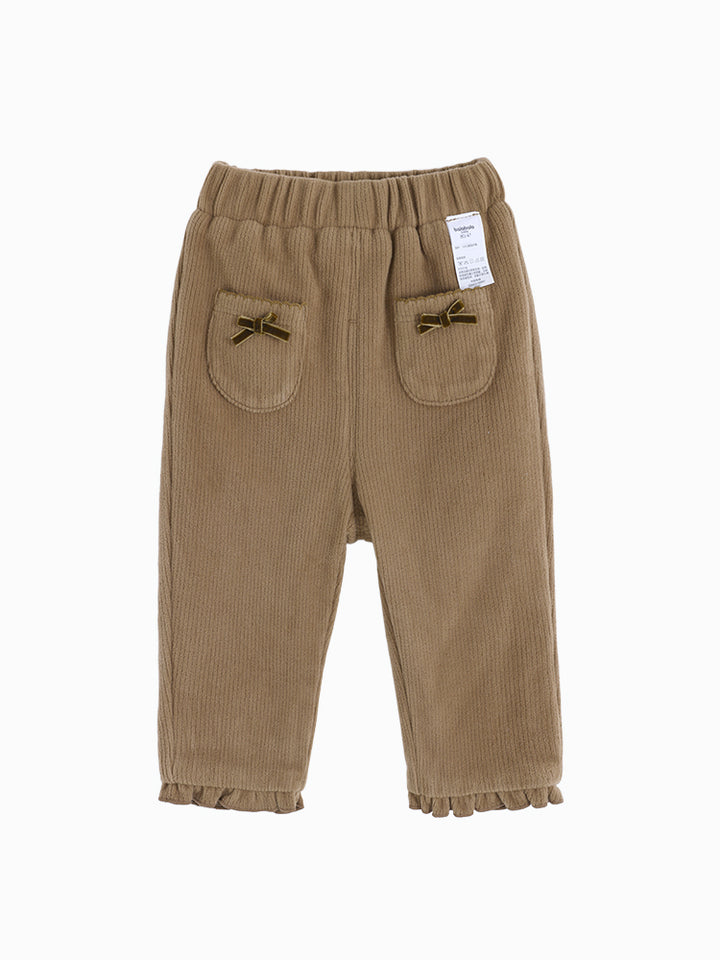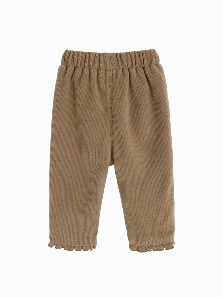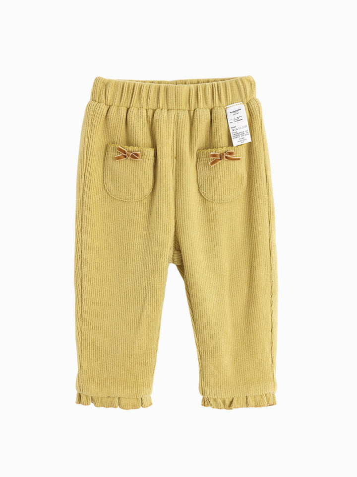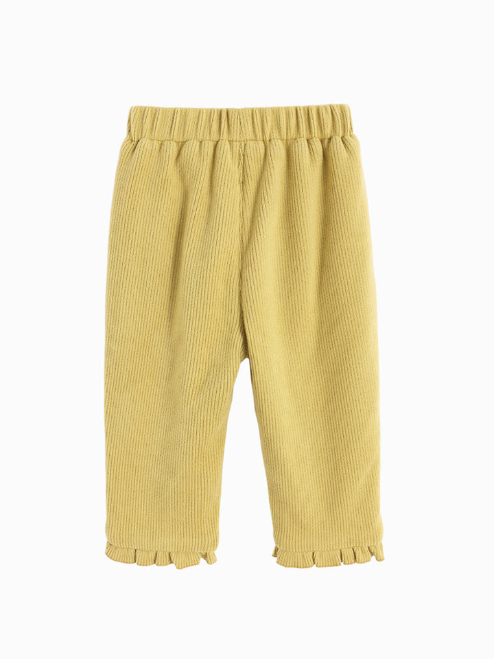 baby girls pants in a solid colored pattern and a textured pattern fabric, decorated with slight ruffled details on legs edges, comes with pockets on the front side and with a comfy elasticated waistband