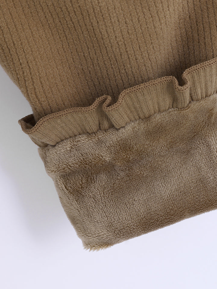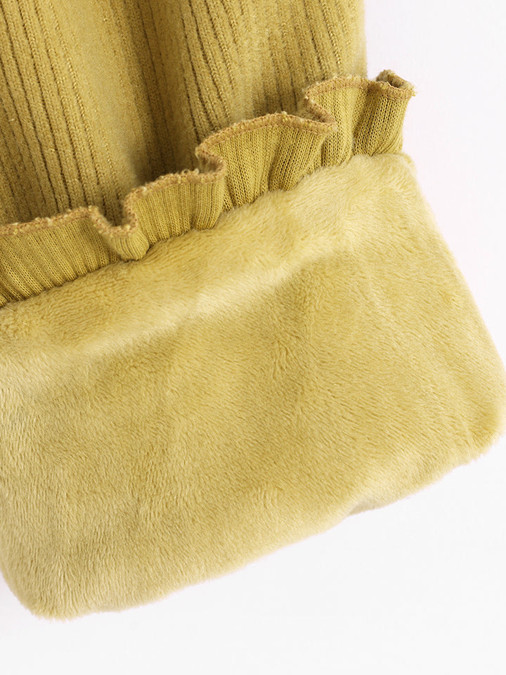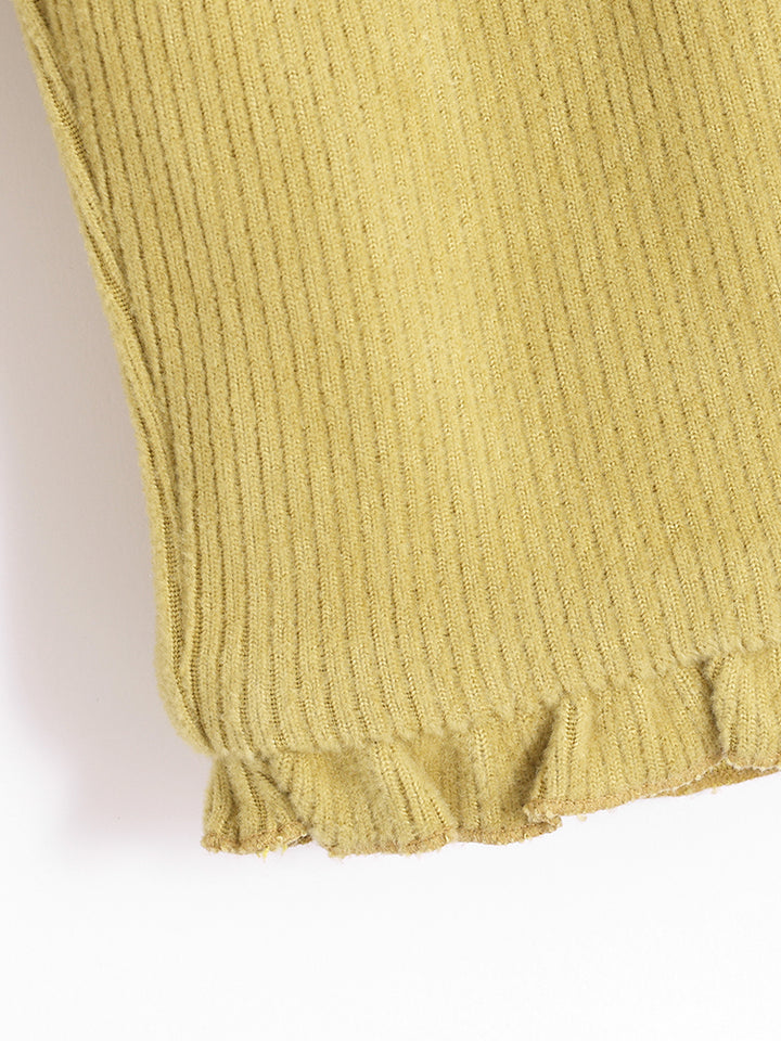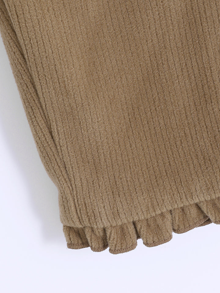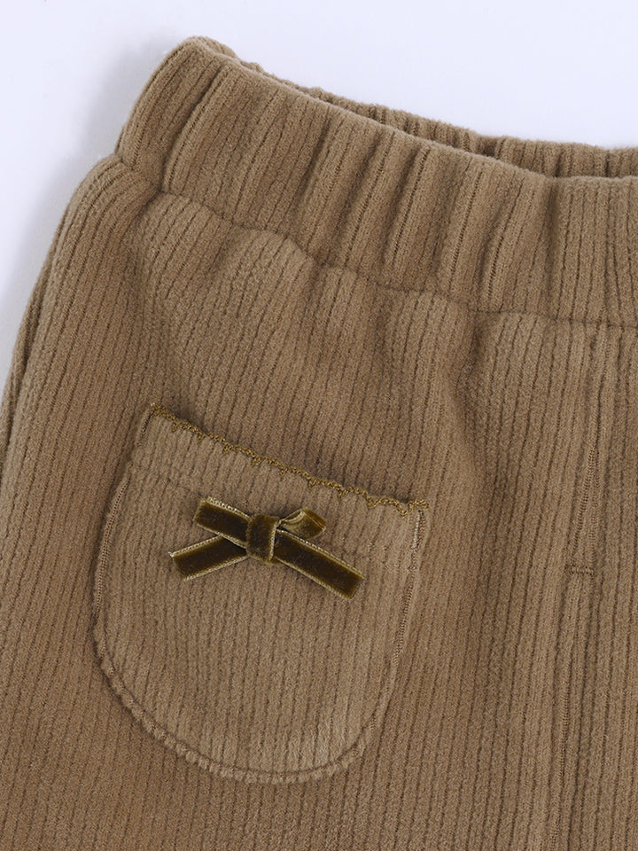 baby girls pants in a solid colored pattern and a textured pattern fabric, decorated with slight ruffled details on legs edges, comes with pockets on the front side and with a comfy elasticated waistband