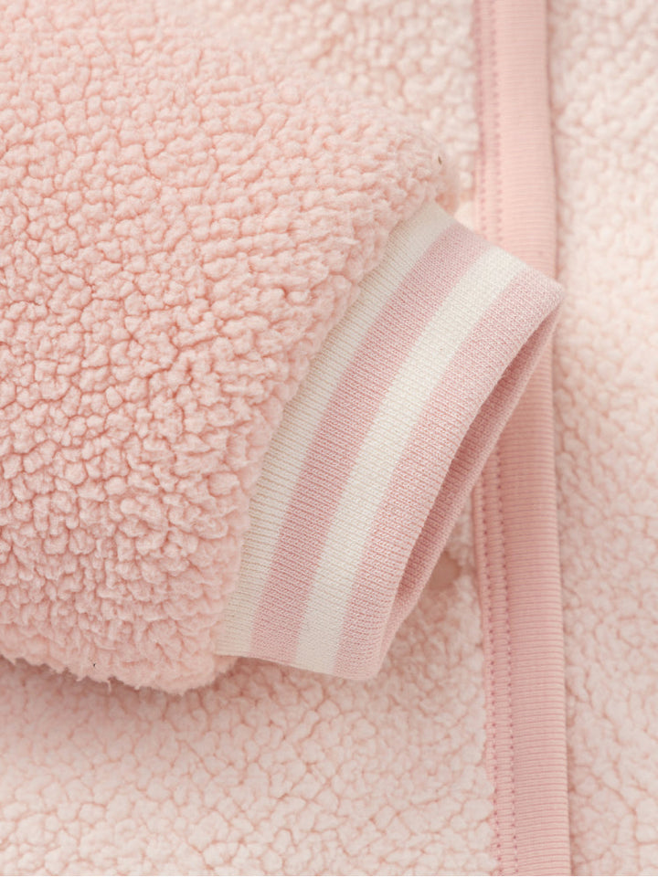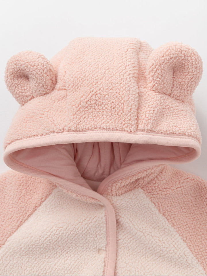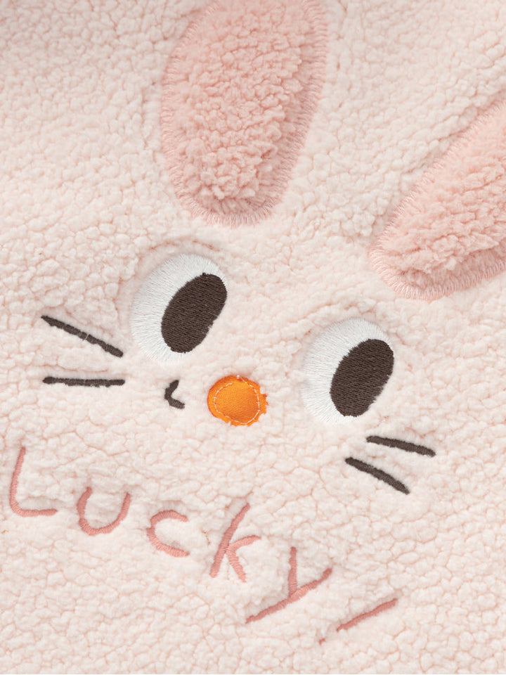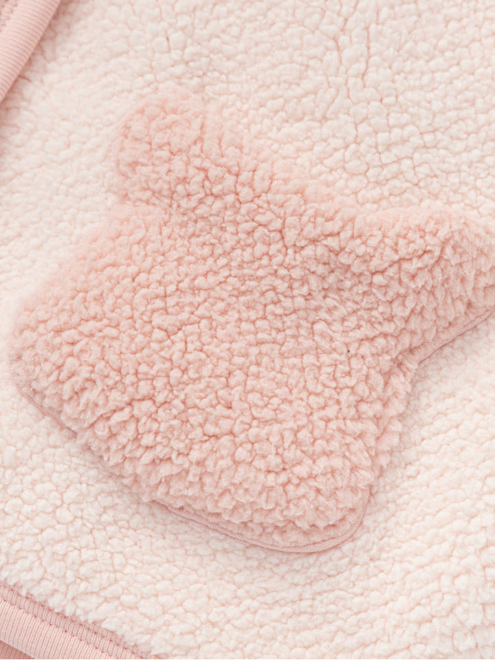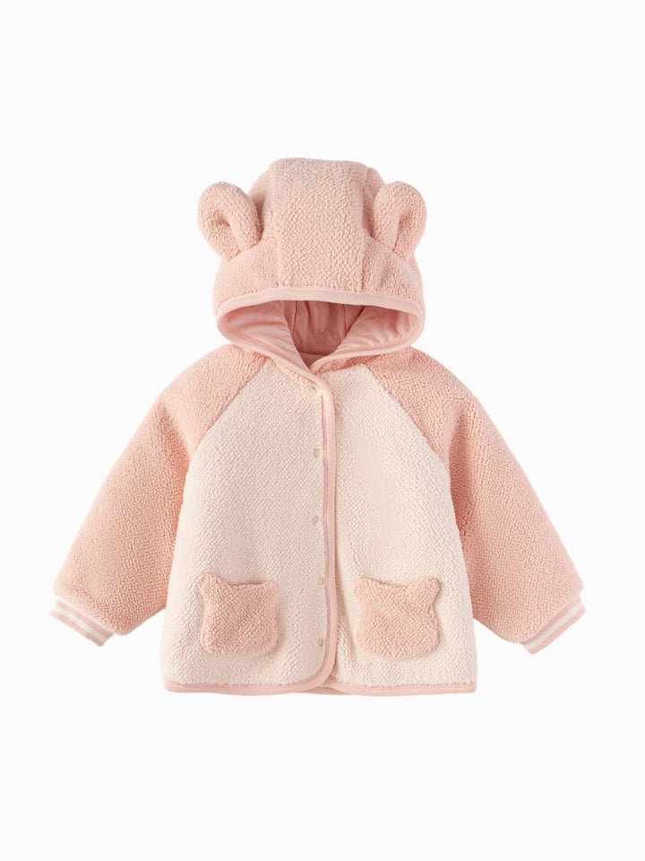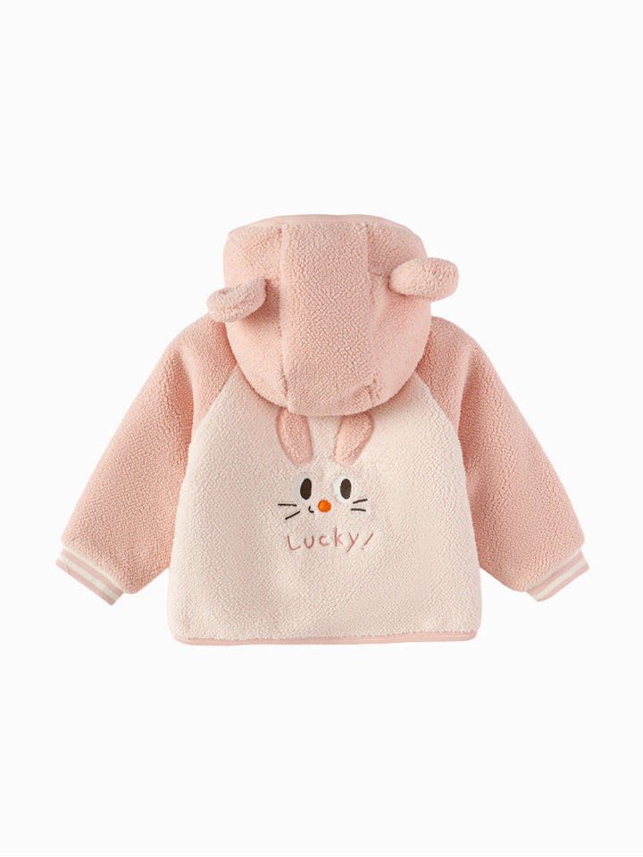 Warm fleece jacket for kids, featuring a hood with cute 3D ears and playful front pockets. Designed with long sleeves, elastic cuffs, and soft-touch fabric for extra comfort. Embroidered back detail adds a fun touch, making it perfect for winter outings.