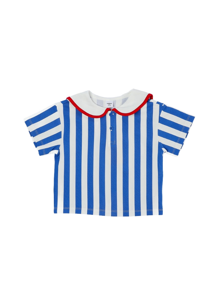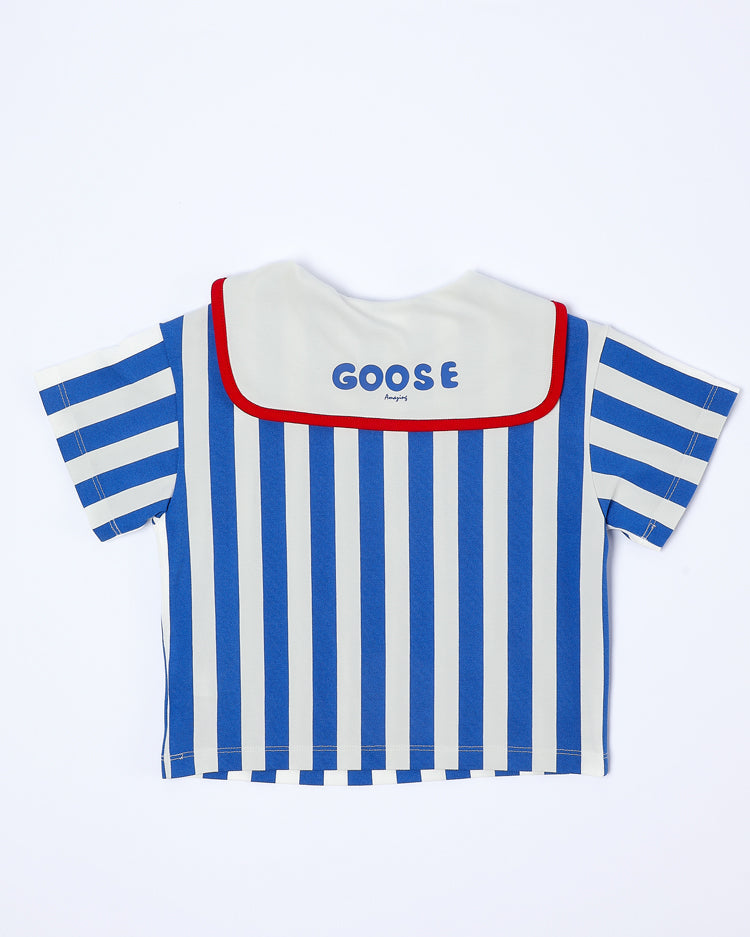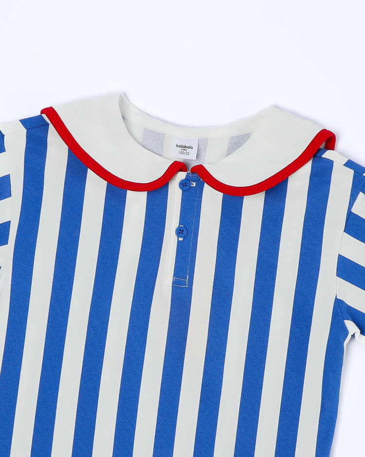 Trendy kids’ T-shirt featuring a striped pattern and short sleeves, accented with a standout collar and a back print. Made from soft and breathable fabric for lasting comfort, perfect for casual wear and modern looks.