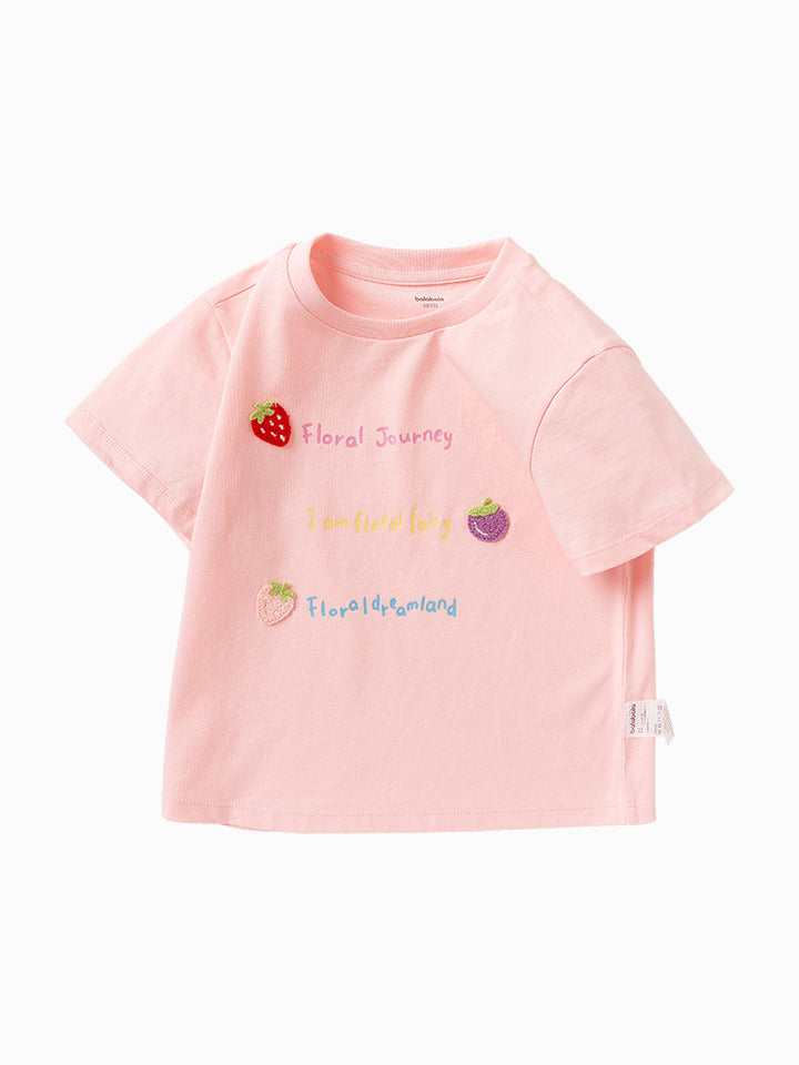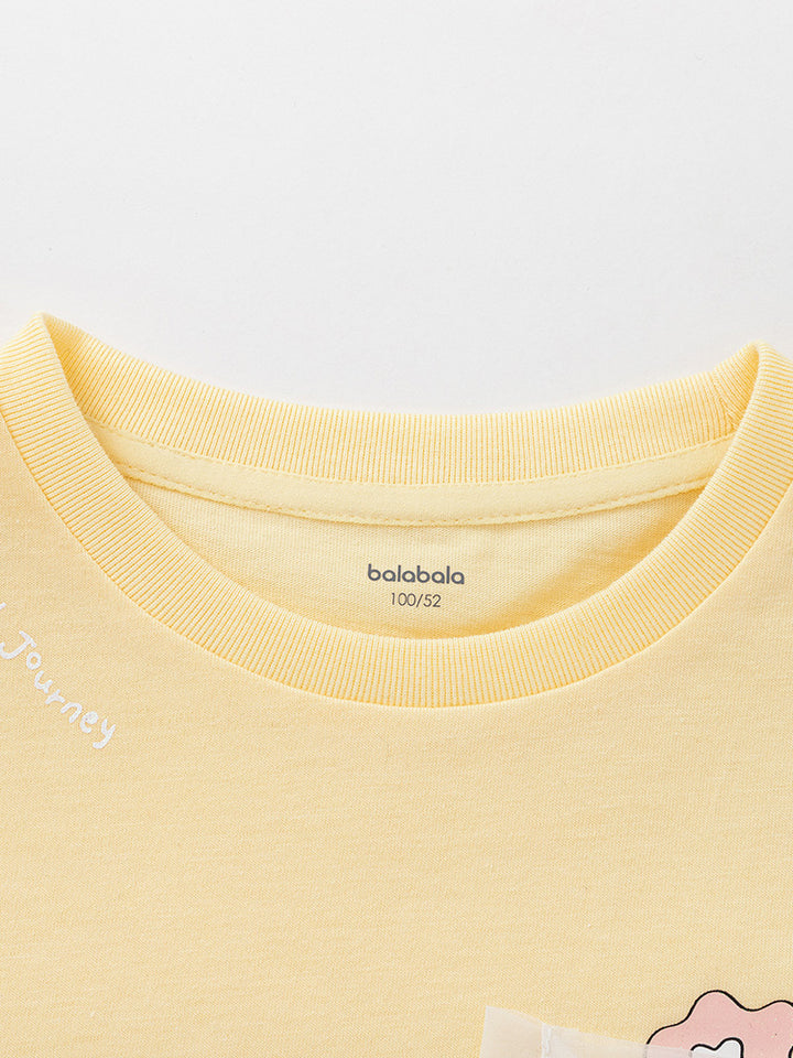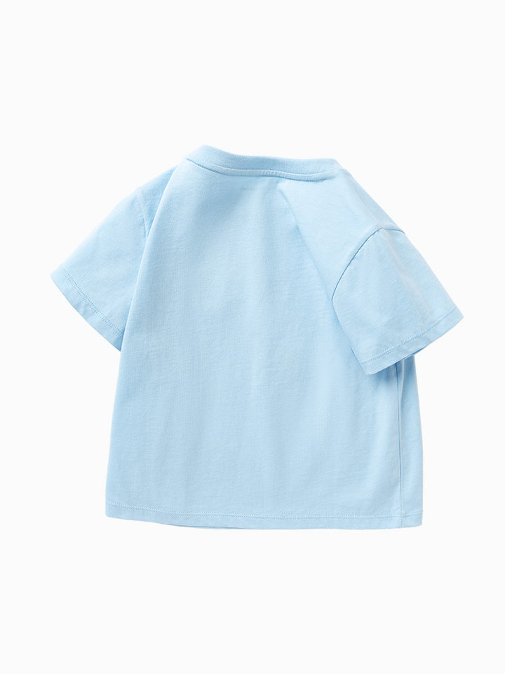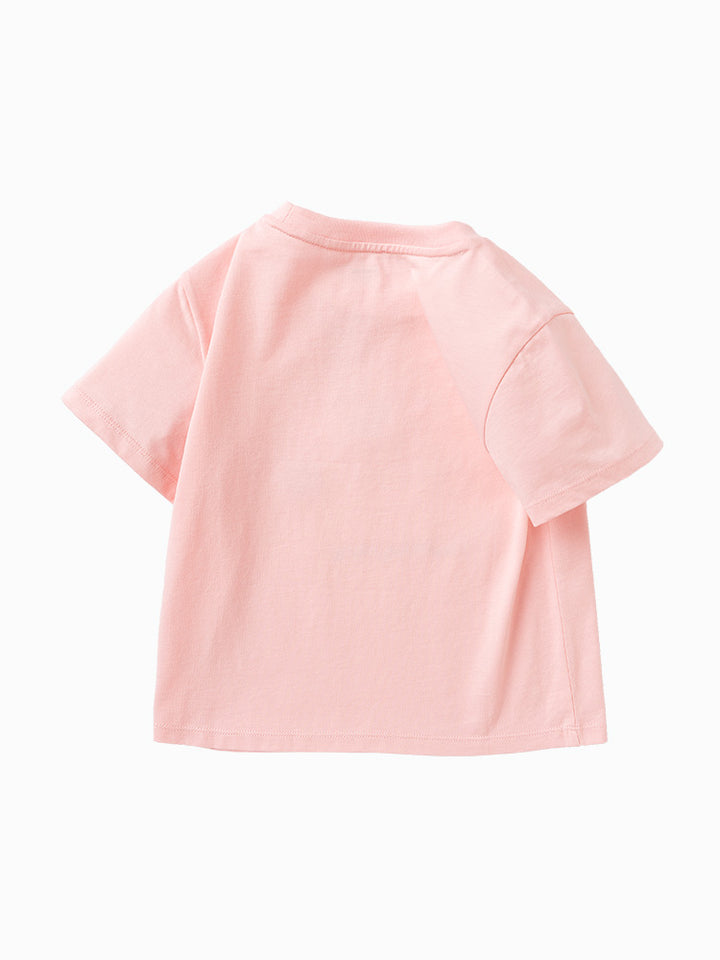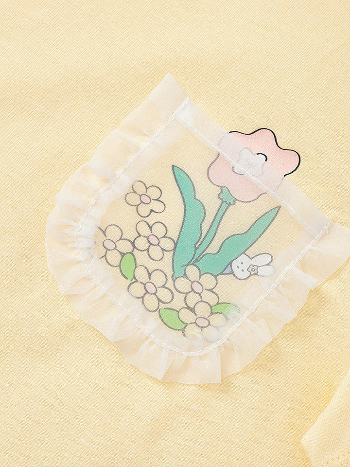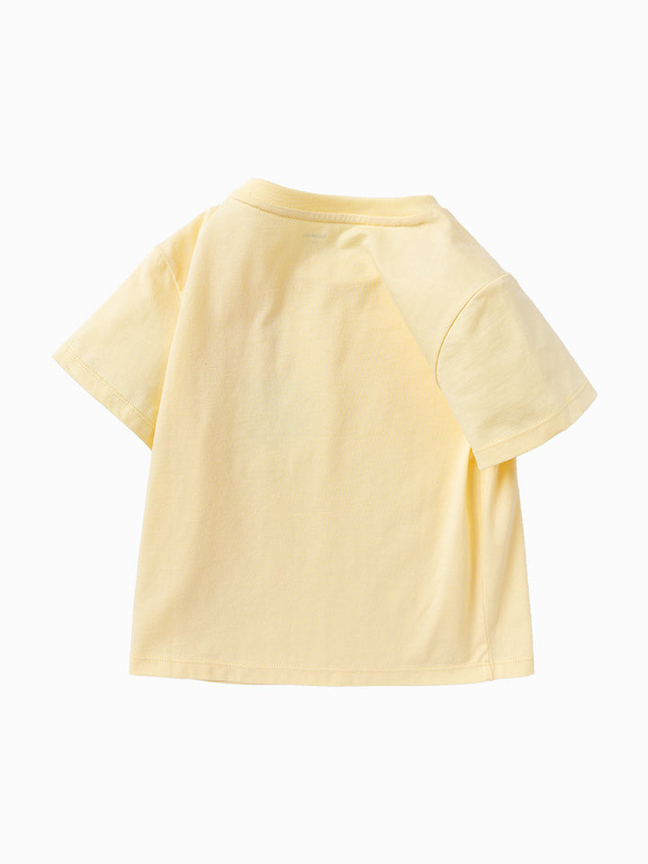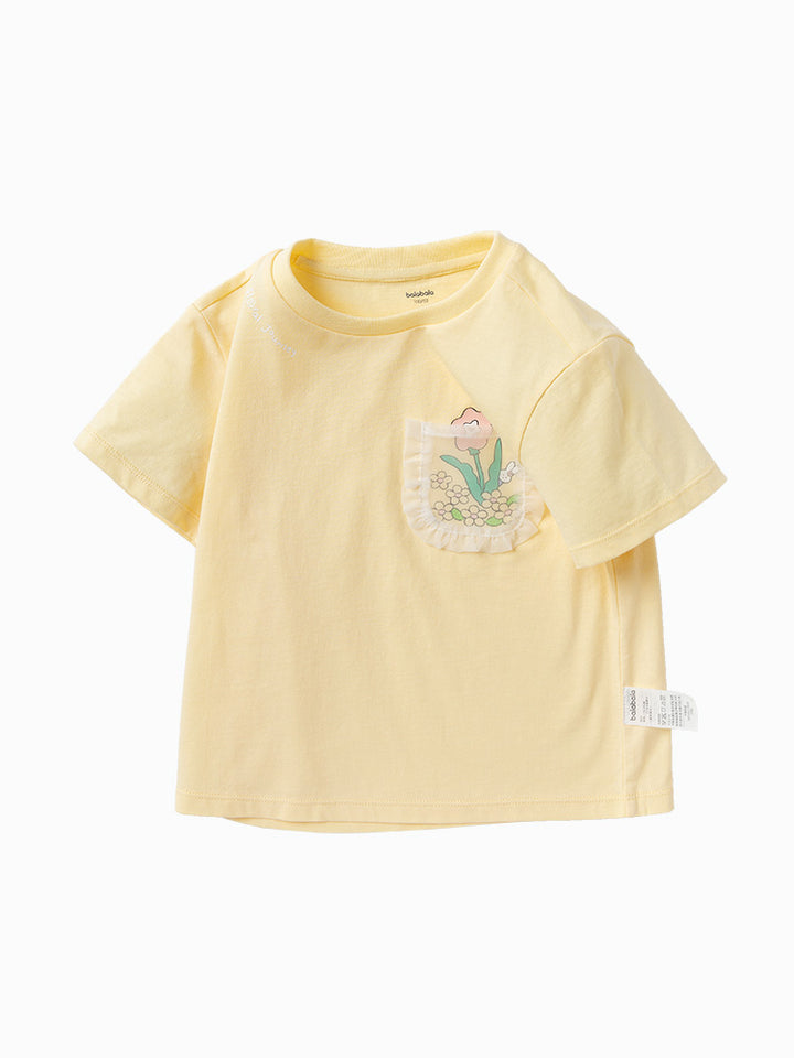 short sleeves t-shirt, decorated with a print and chiffon pocket on the front side, comes with a rounded shape neckline