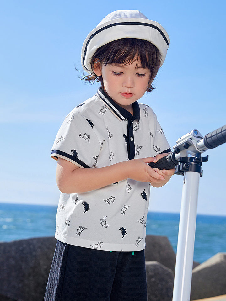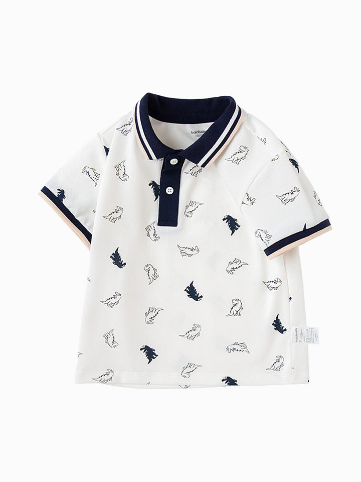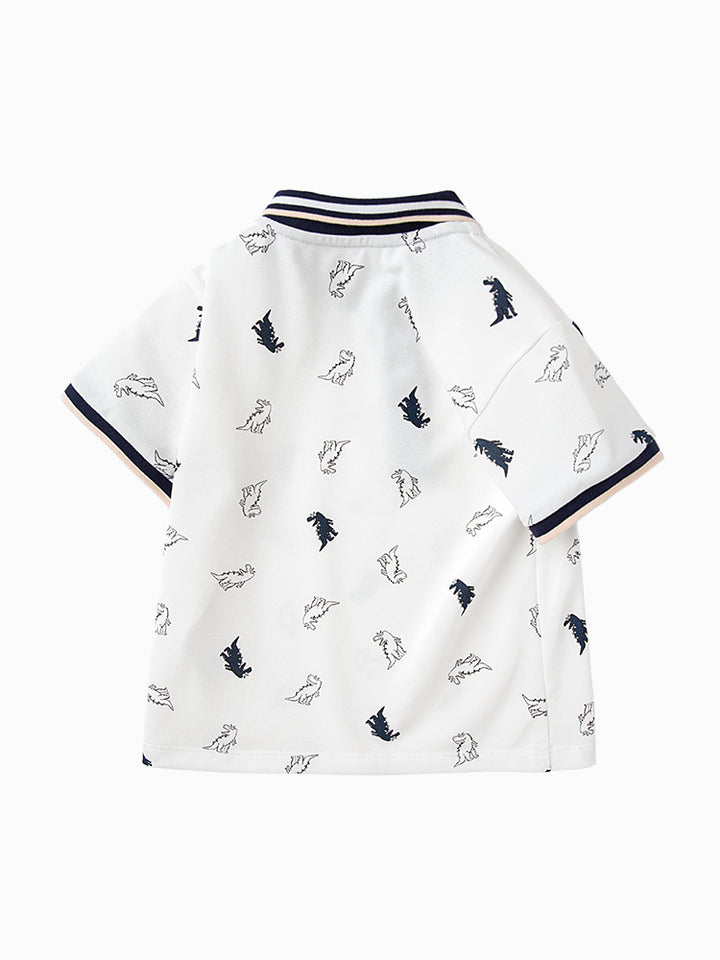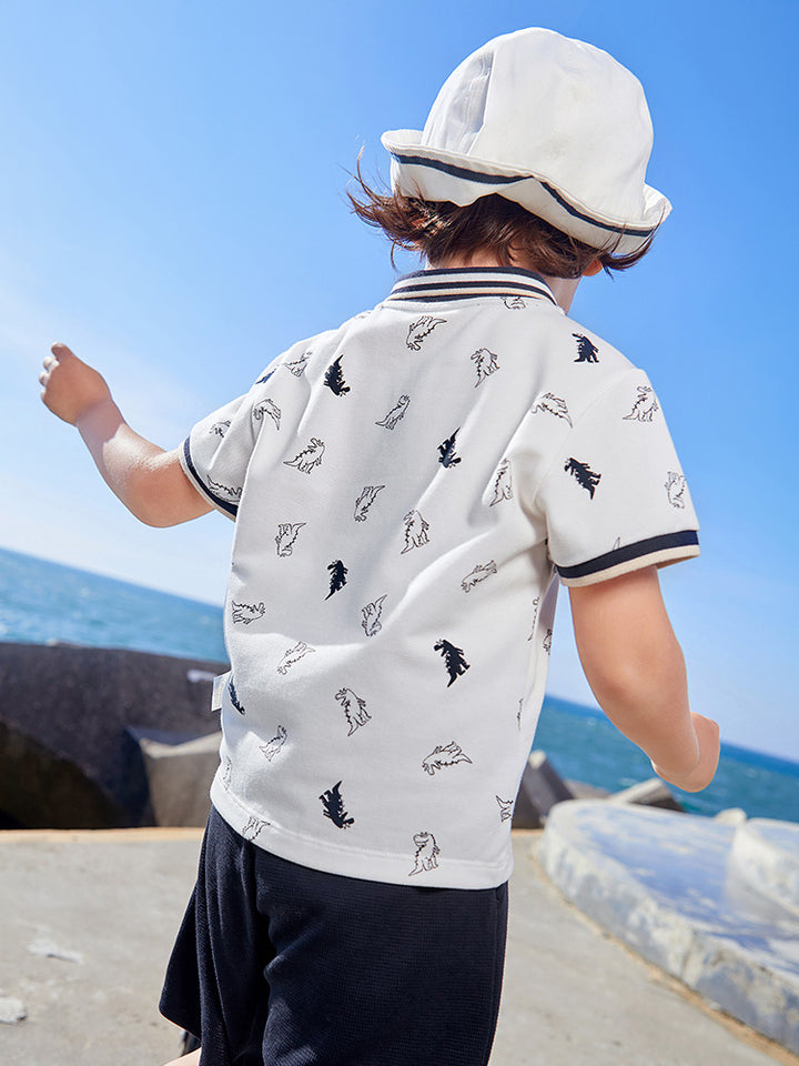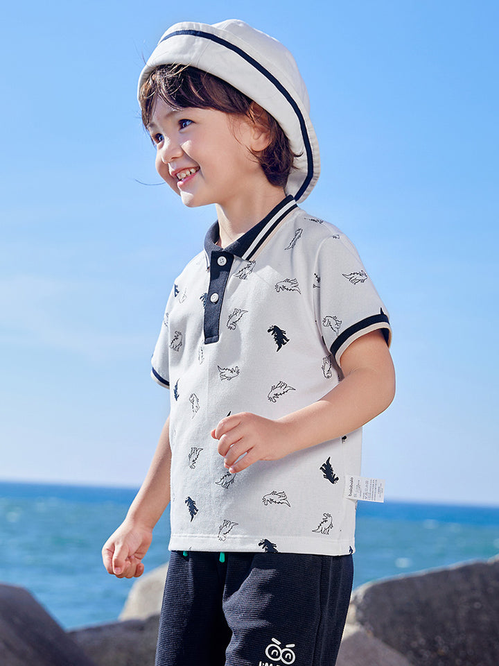 short sleeves polo t-shirt, decorated with a printed pattern, comes with buttons on the front side and with a regular collar