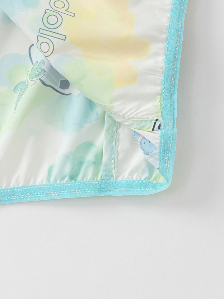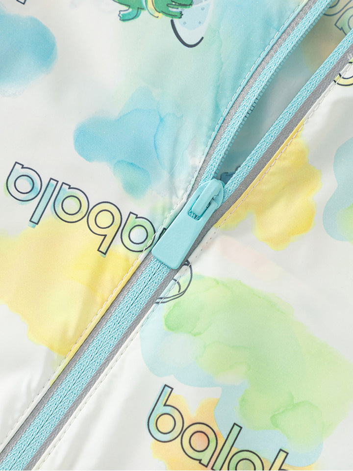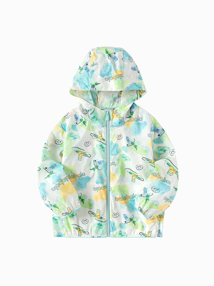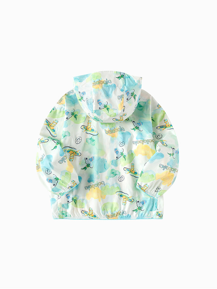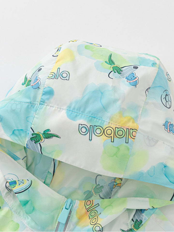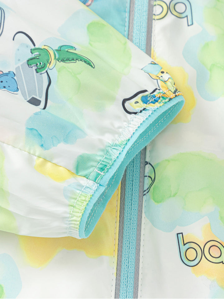 long sleeves casual boy jacket, decorated with a colored printed pattern on full design, comes with a zipper for closure on the front side and with an attached hoodie collar