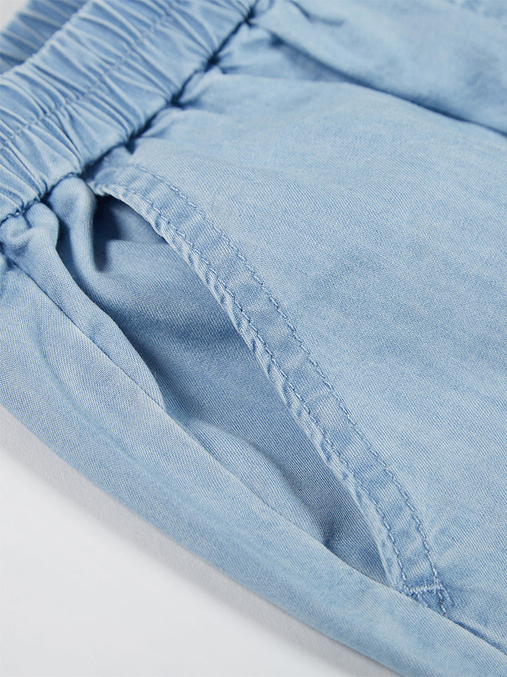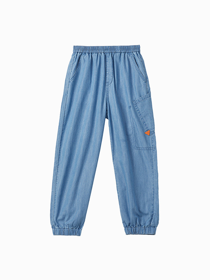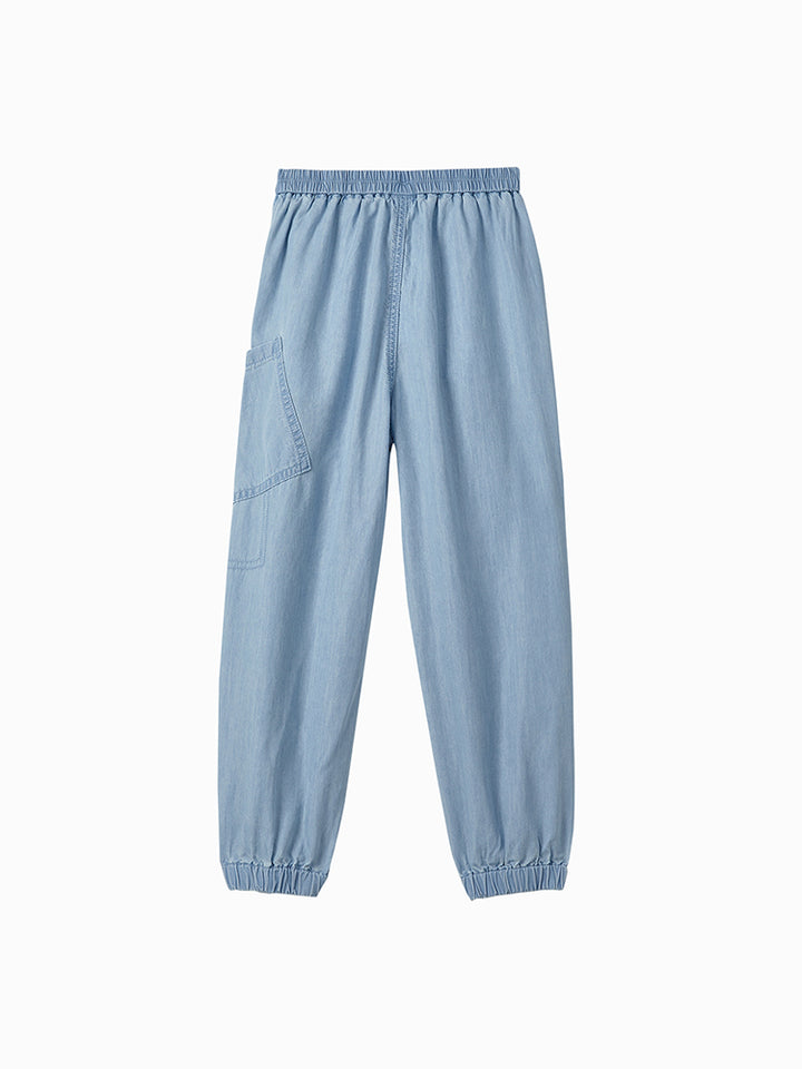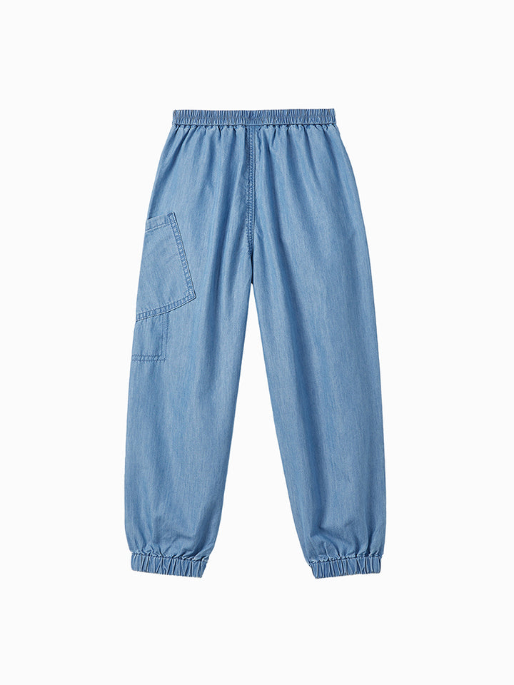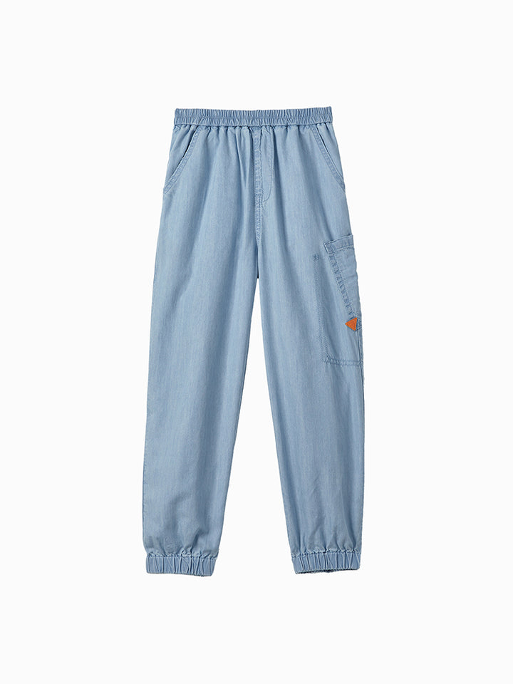 casual denim pants in a solid mono colored pattern, comes with pockets on the front side and a comfy elasticated waistband