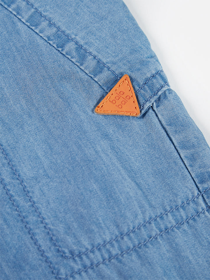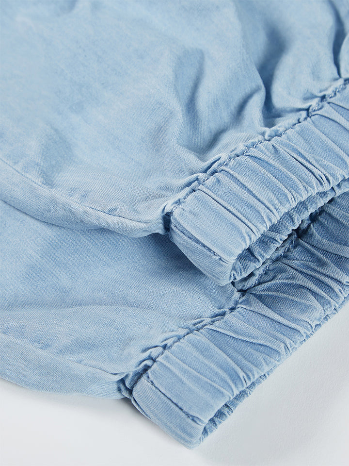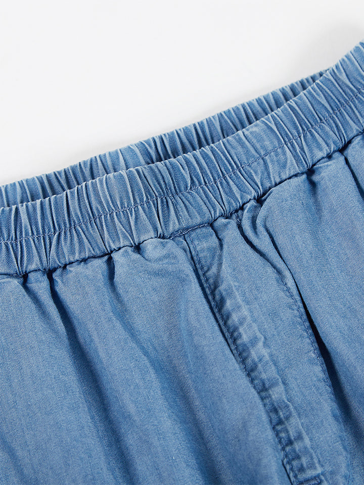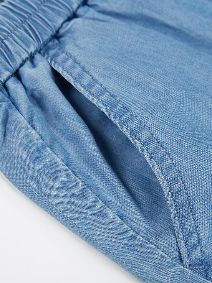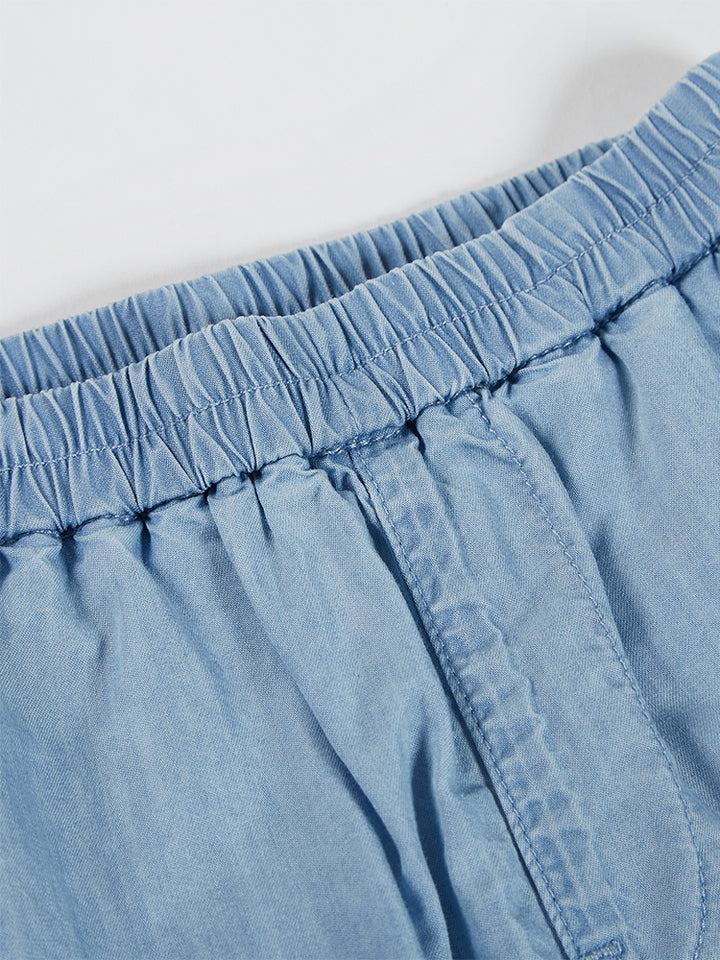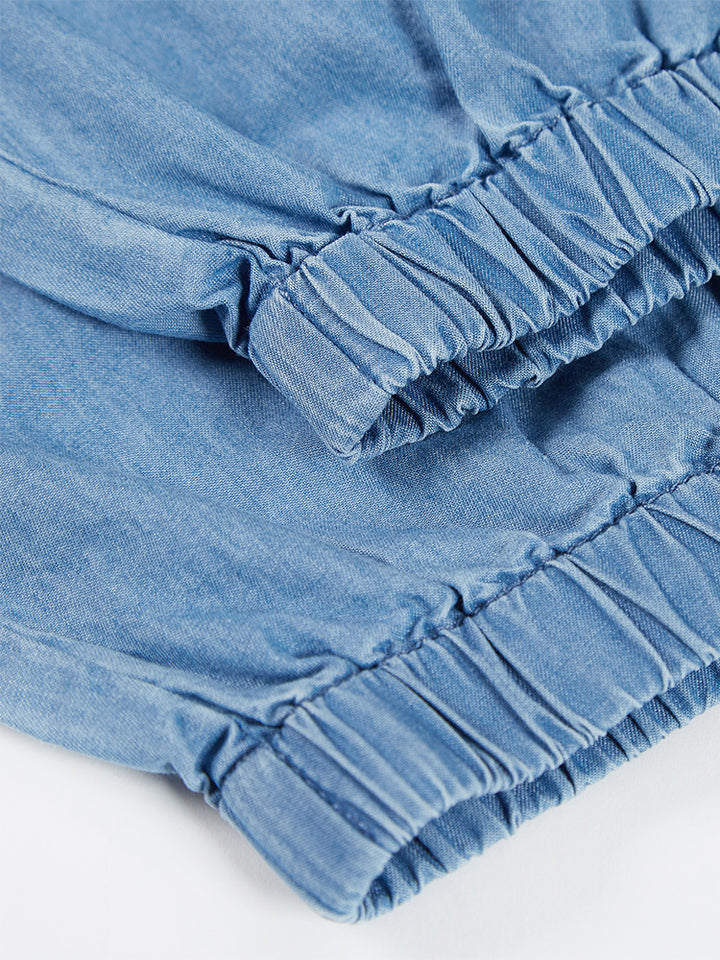 casual denim pants in a solid mono colored pattern, comes with pockets on the front side and a comfy elasticated waistband