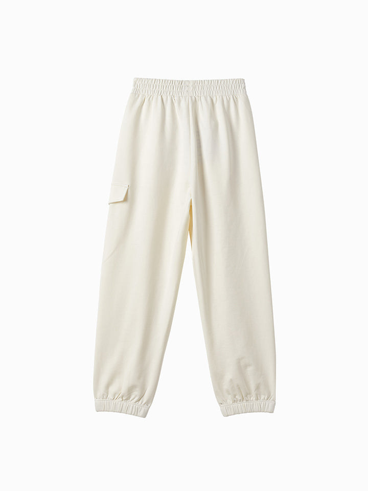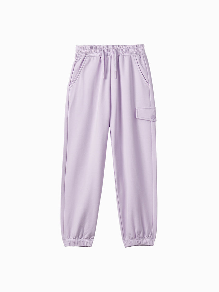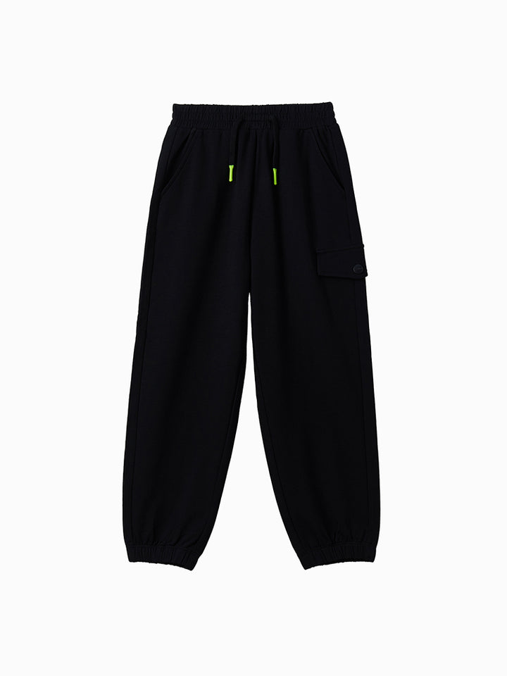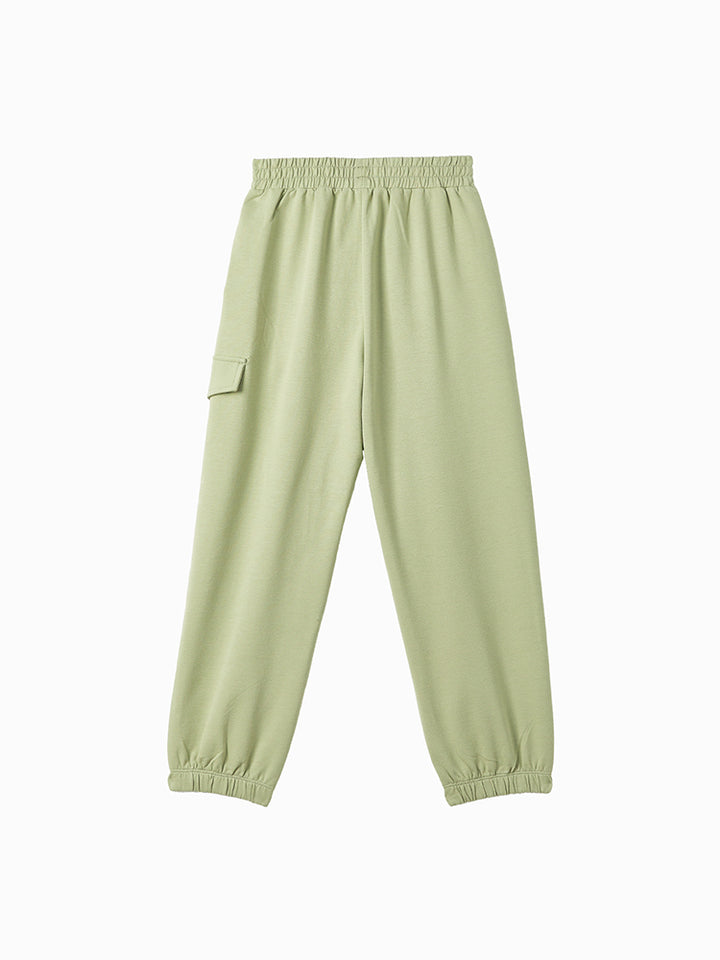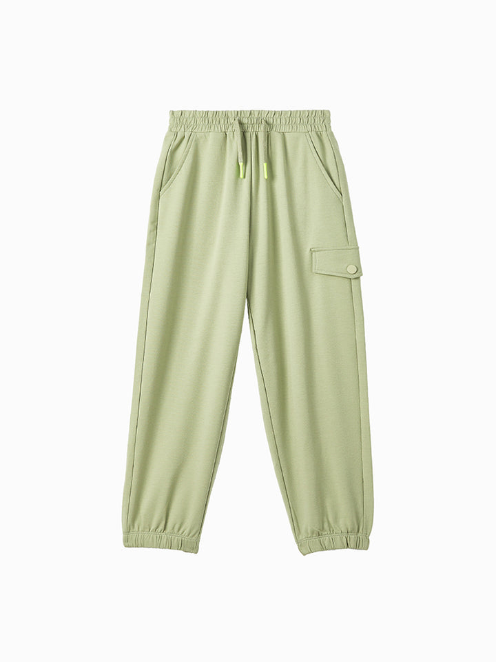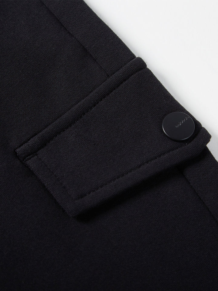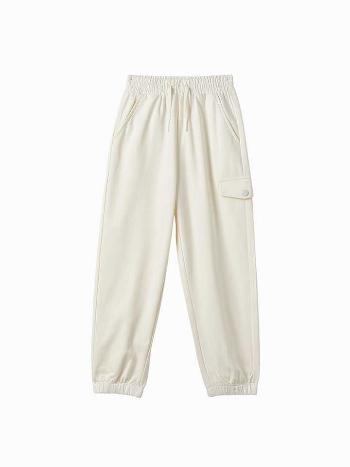 casual sweatpants in a solid mono colored pattern, comes with pockets on the front side and flap pocket on the side of one leg, comfy elasticated waistband and an adjustable drawstring on waistline