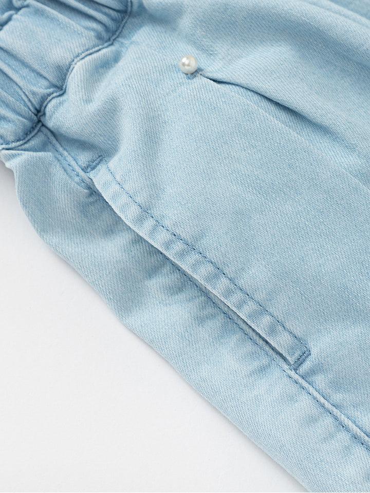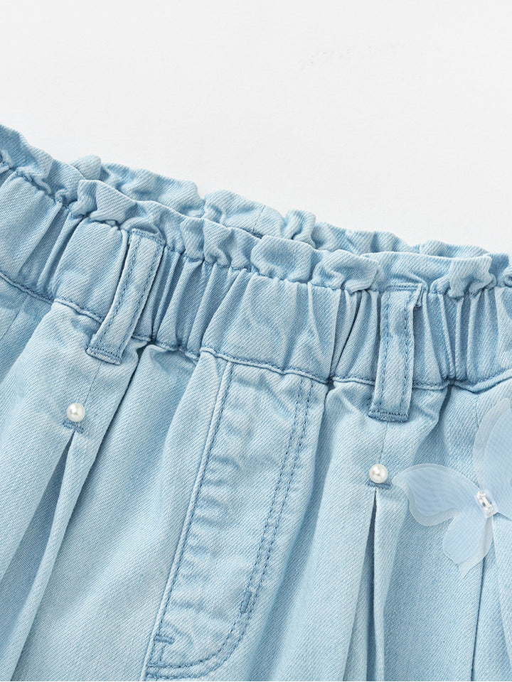 casual girls denim shorts in a solid mono colored pattern, decorated with beads and pleated details, comes with pockets on the front side and with a comfy elasticated waistband