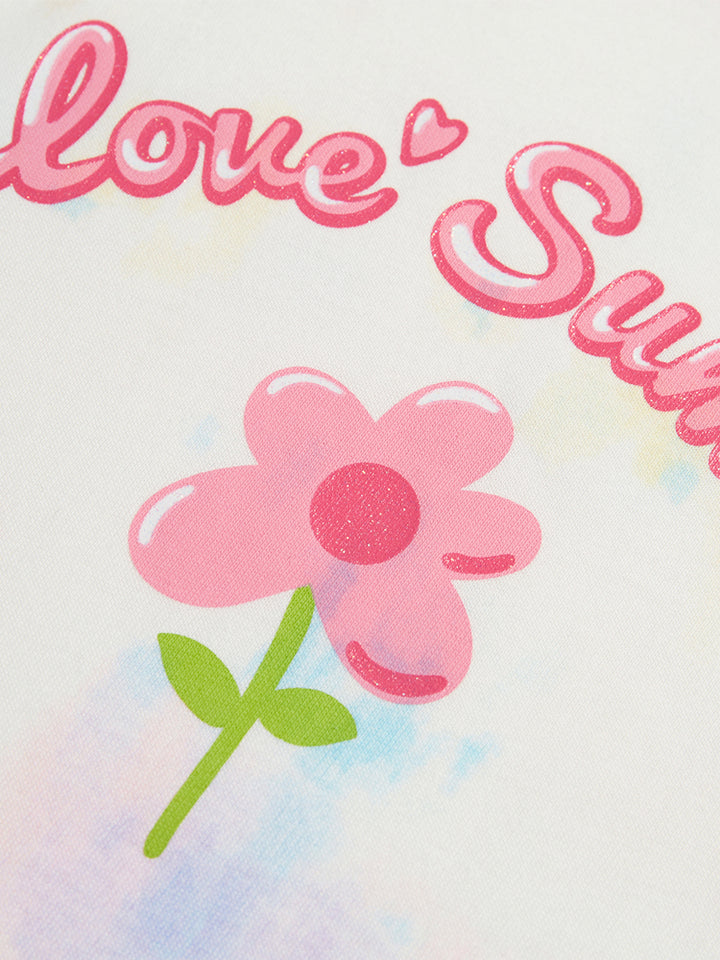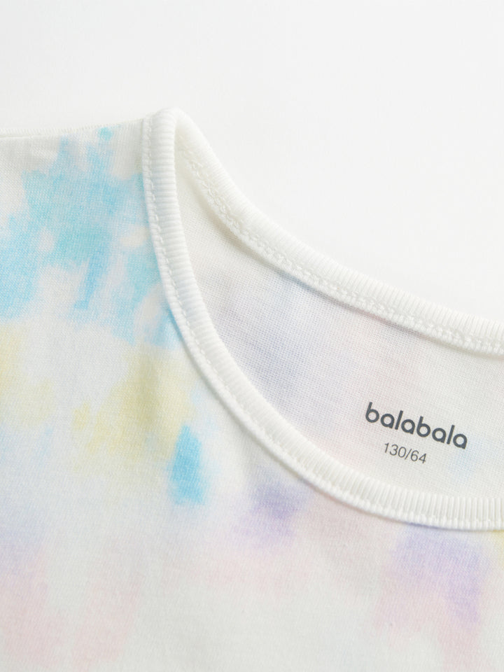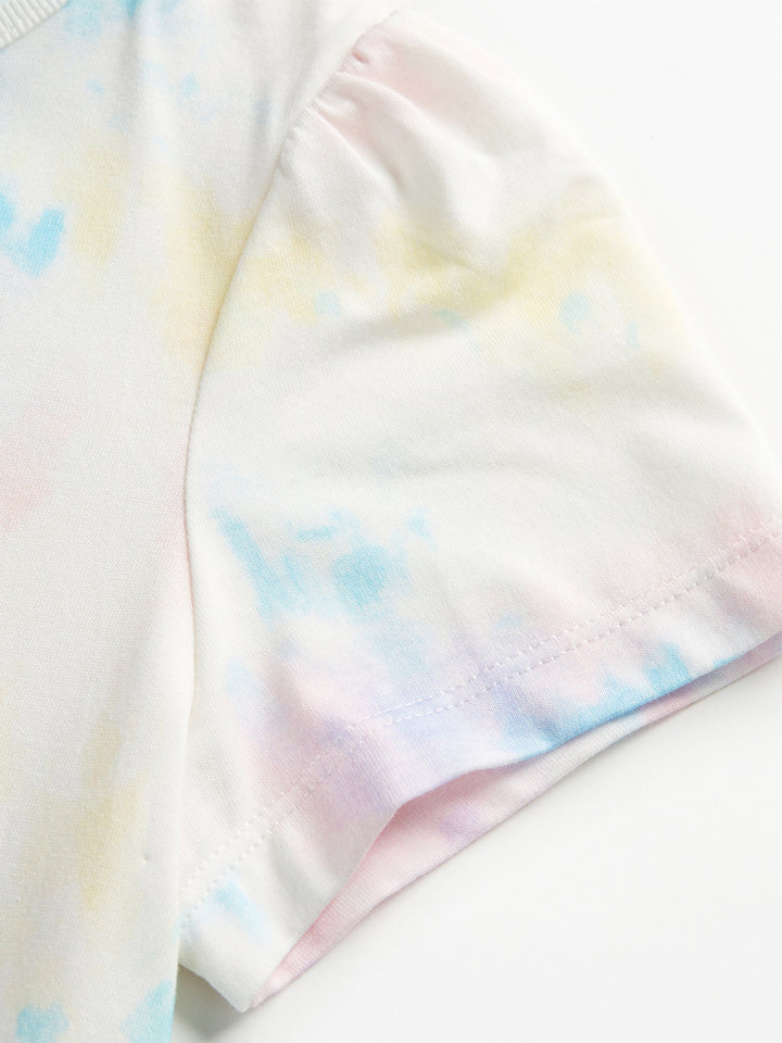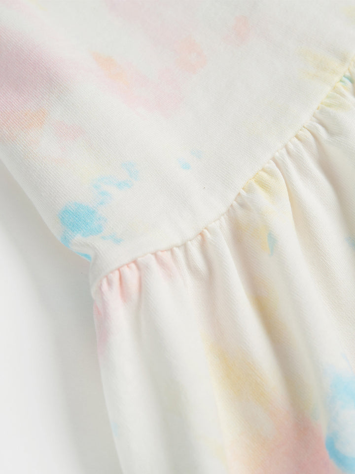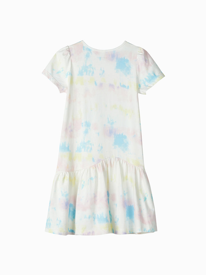 short sleeves casual dress in a flowy style design, decorated with a tie-dye printed pattern and a print on the front side, comes with a crew neck cut