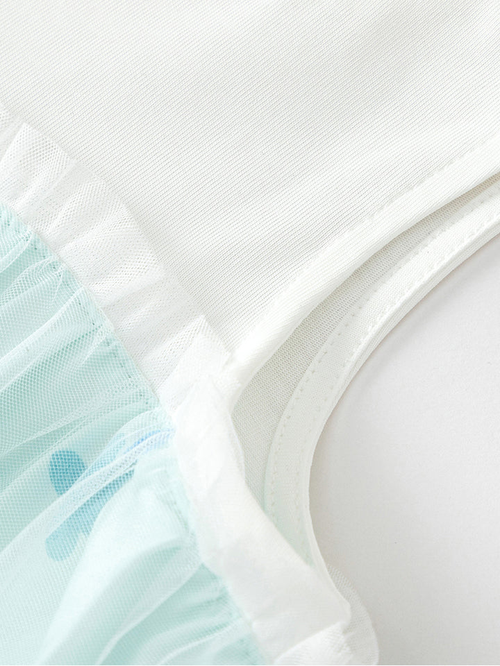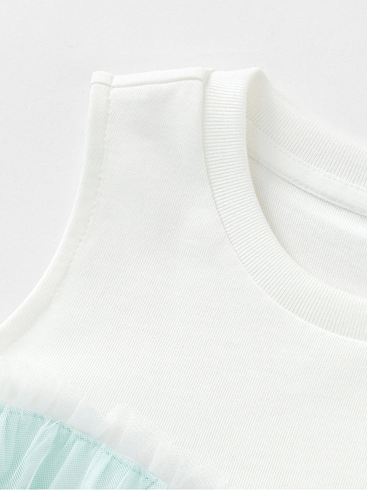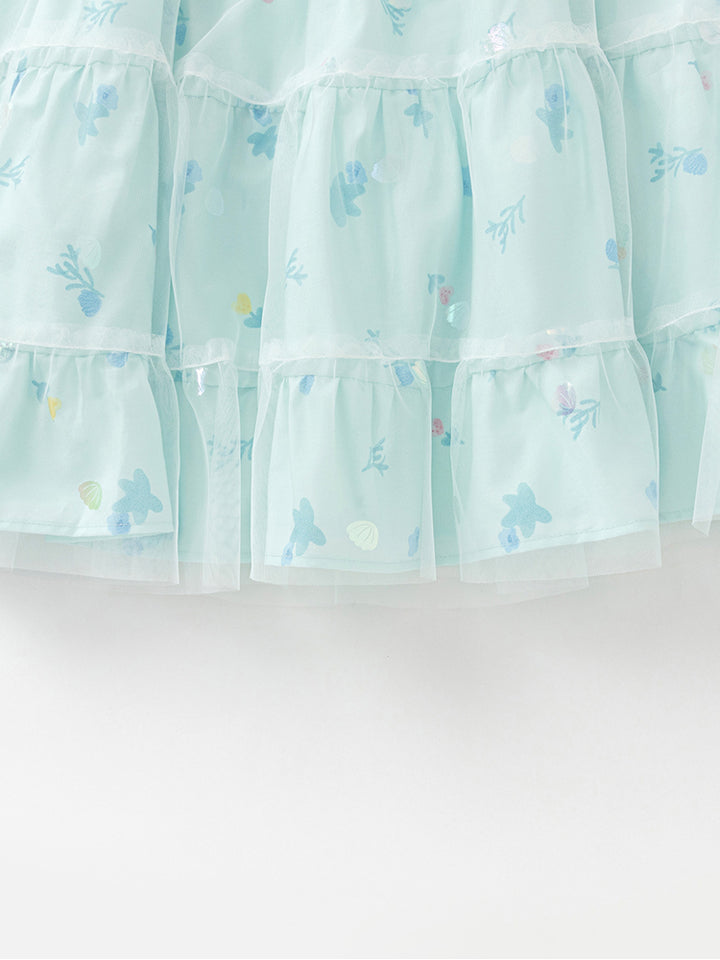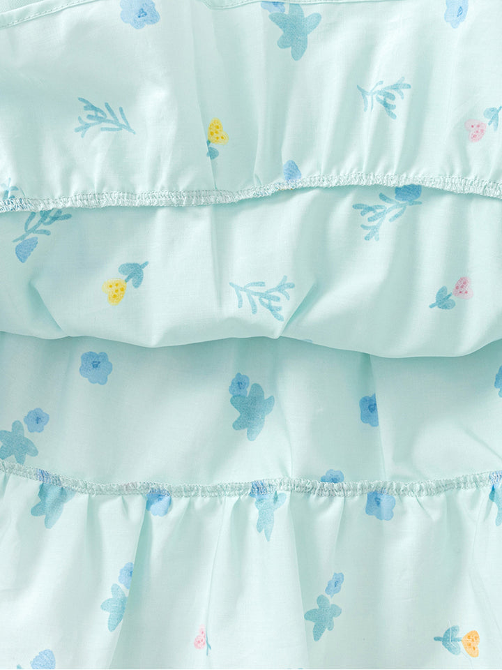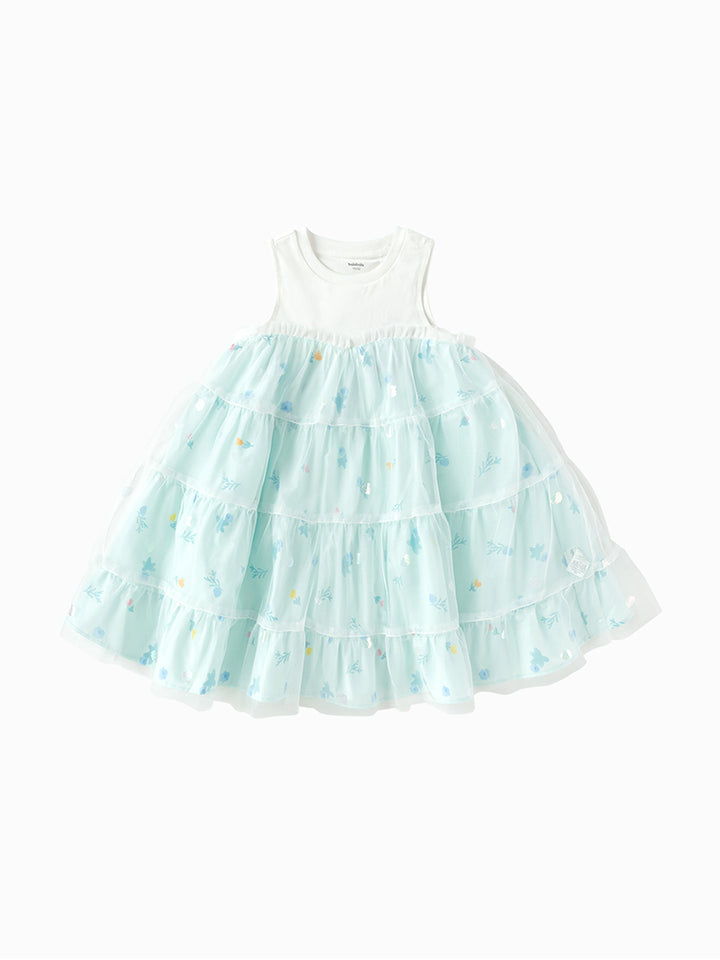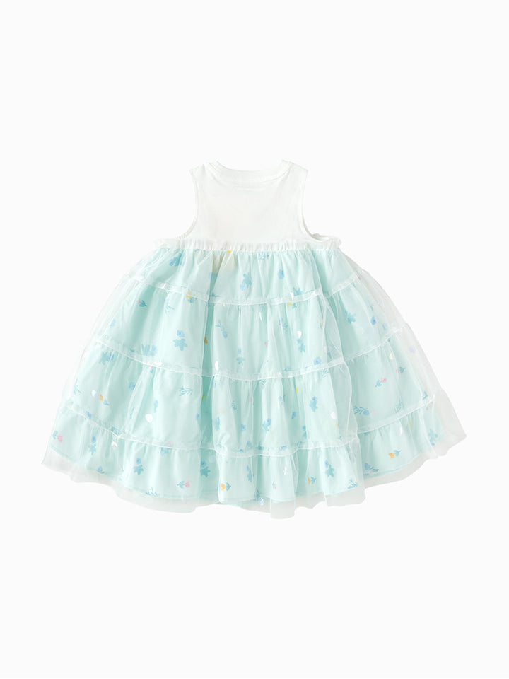 sleeveles girl dress in a flowy layered style design, decorated with a printed pattern and layered ruffled details with mesh fabric layer, comes with a rounded shape neckline