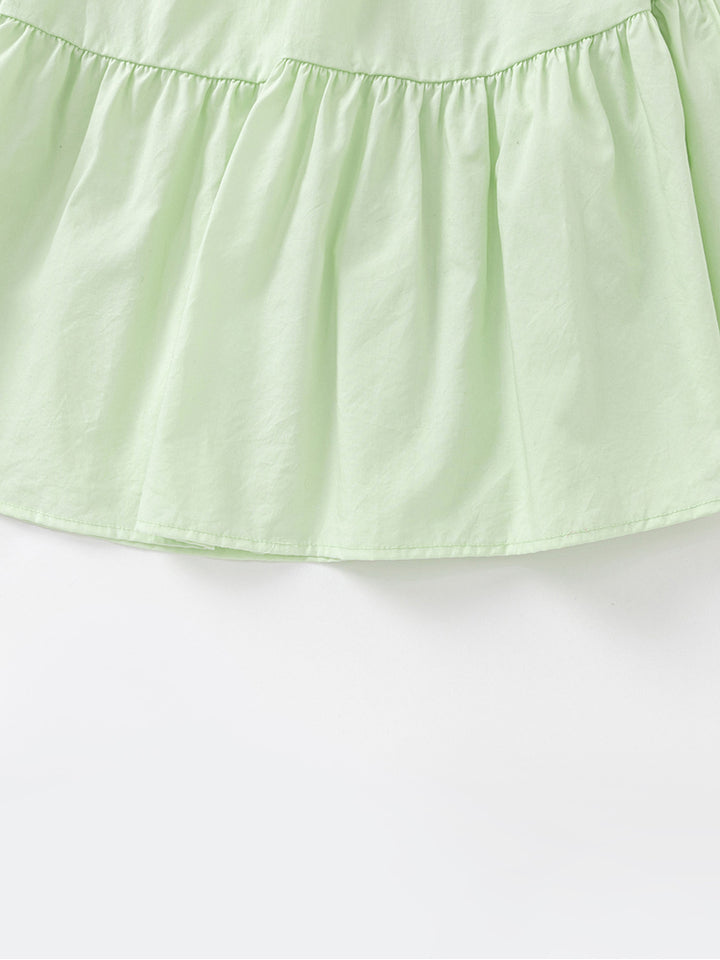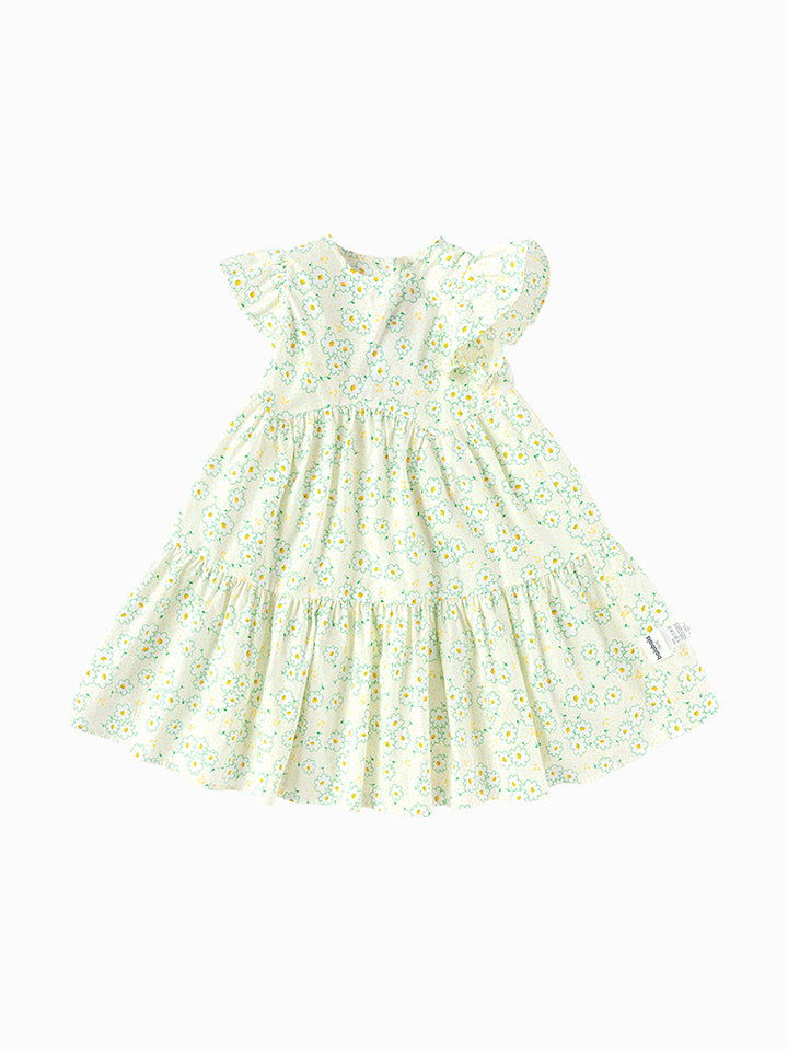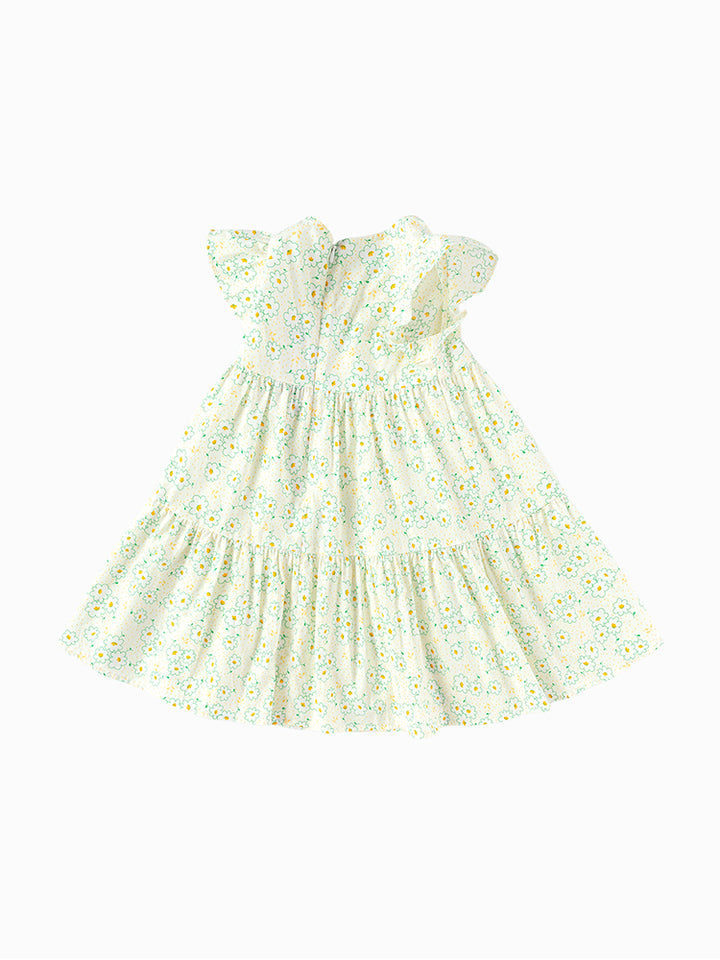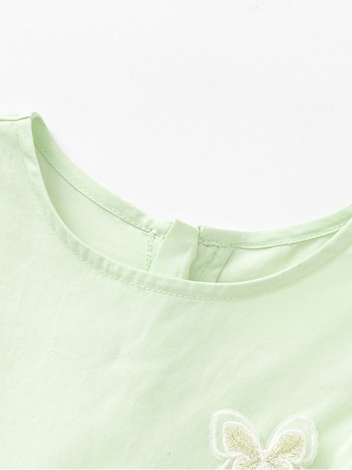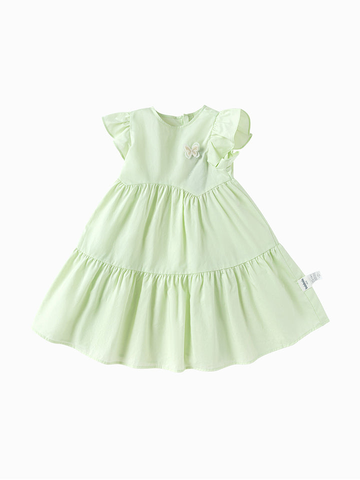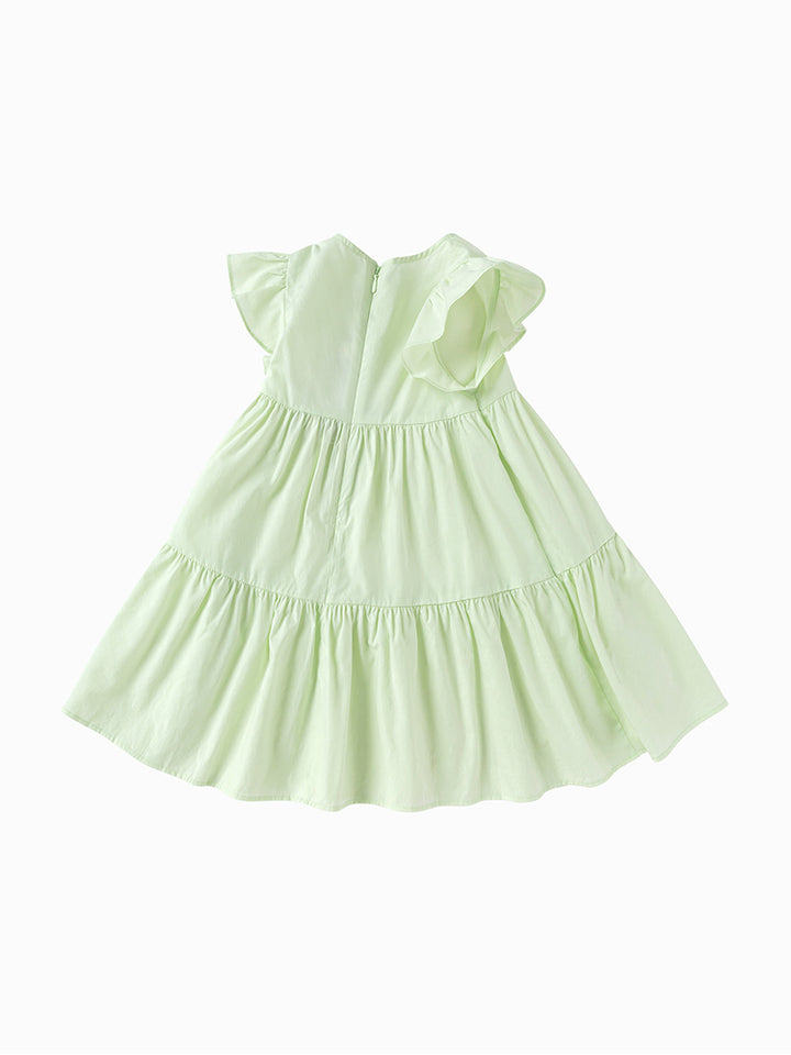 short sleeves girls dress in a flowy style design, decorated with a small embroidery patch on the fornt side and ruffle on sleeves, comes with a zipper for closure on the back side and with a rounded shape neckline