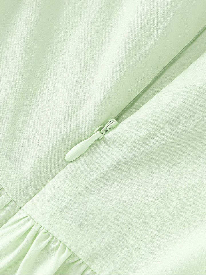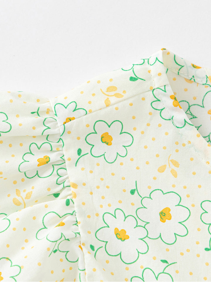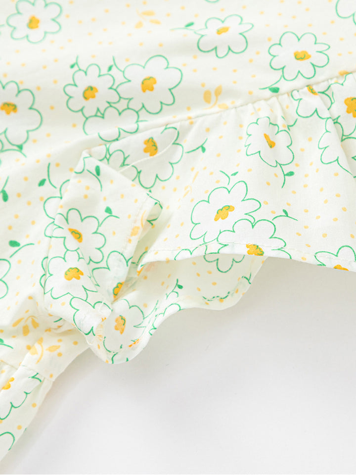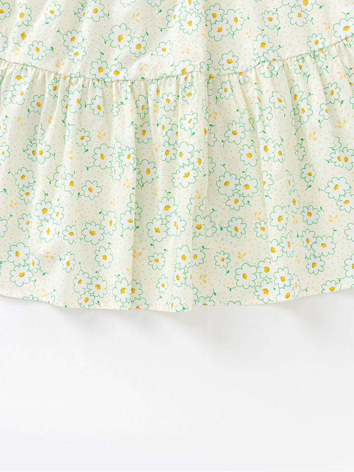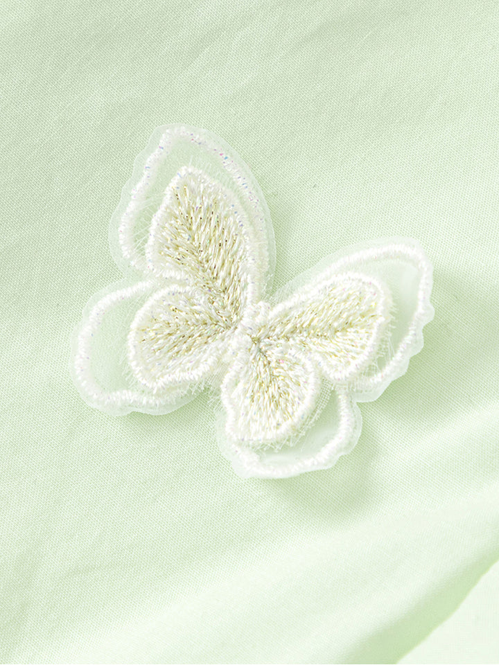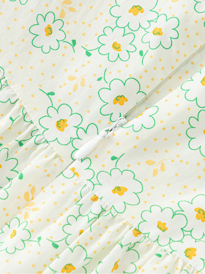 short sleeves girls dress in a flowy style design, decorated with a small embroidery patch on the fornt side and ruffle on sleeves, comes with a zipper for closure on the back side and with a rounded shape neckline