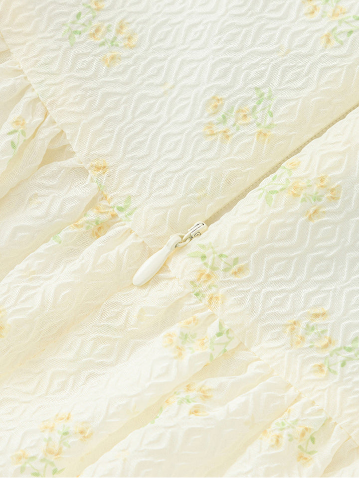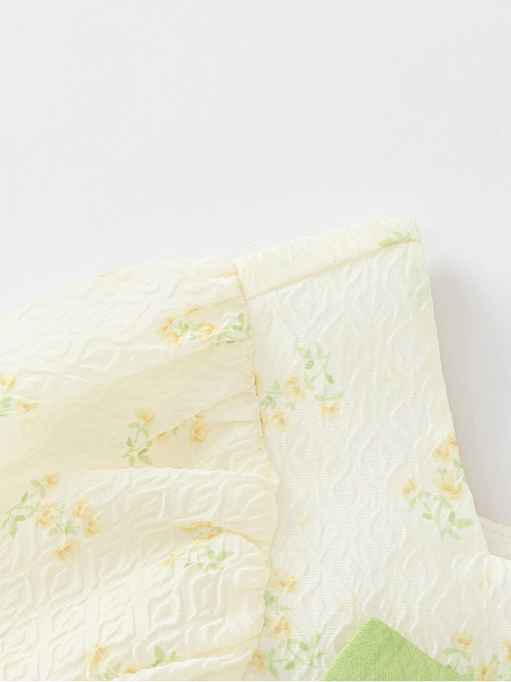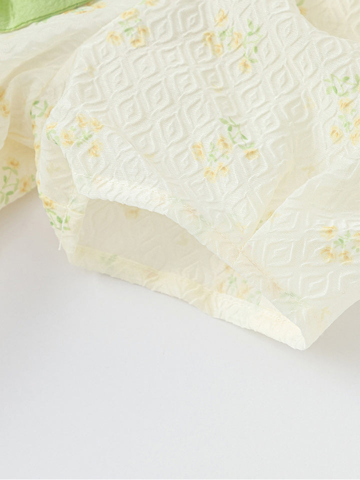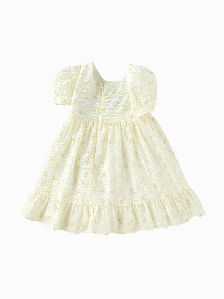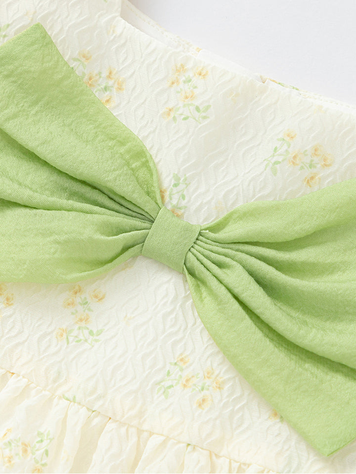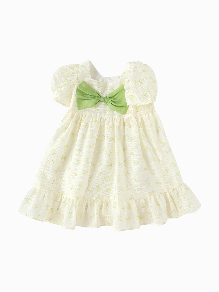 short sleeves girls dress in a flowy style design, decorated with a colored printed pattern on full design and a bow detail on the front side, comes with a zipper for closure on the back side and with a straight shape neckline