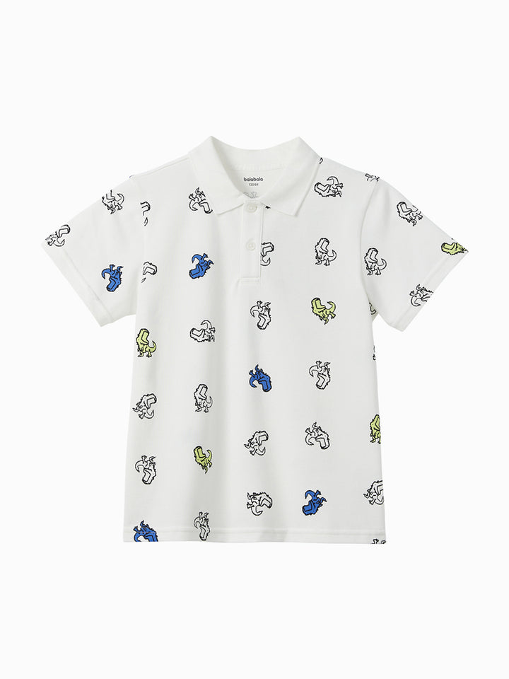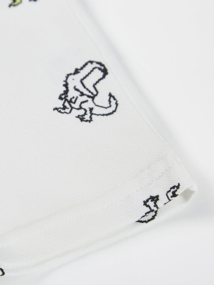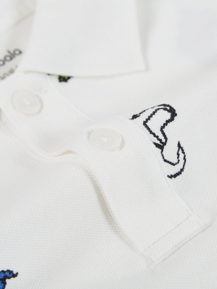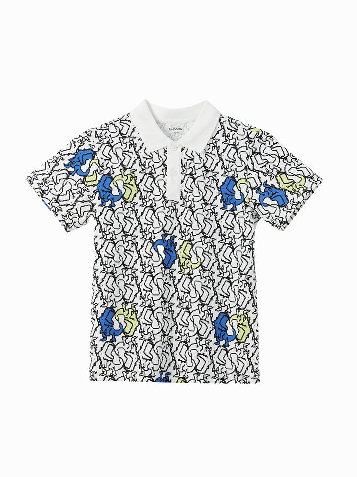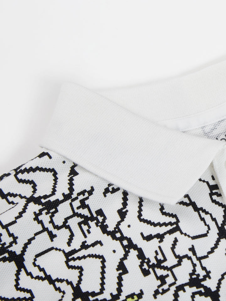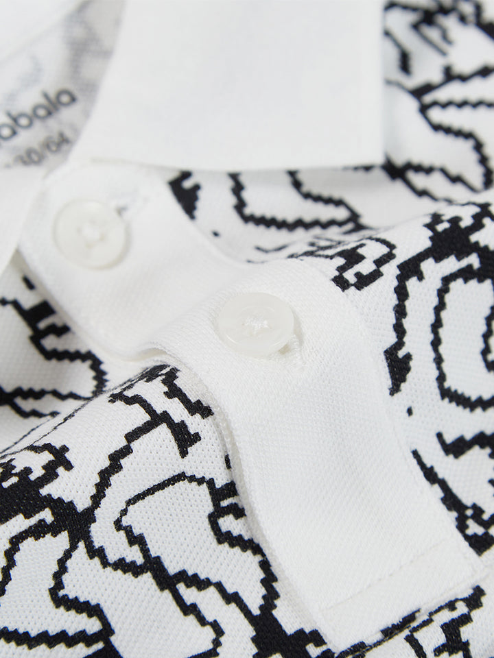 short sleeves casual polo t-shirt, decorated with a printed pattern, comes with buttons for closure on the front side and with a classic regular collar