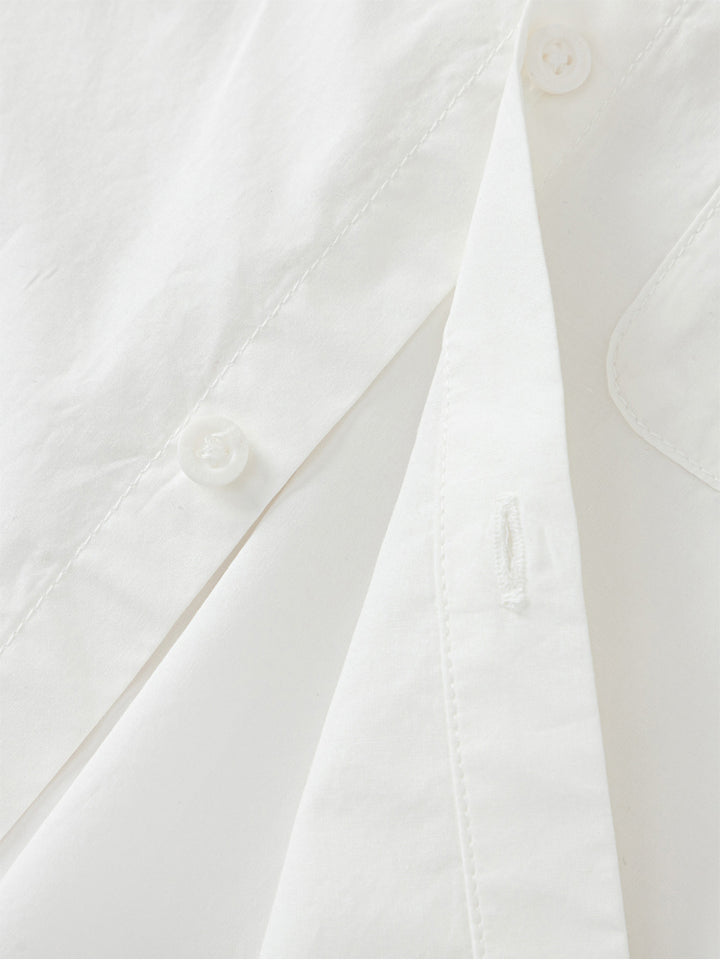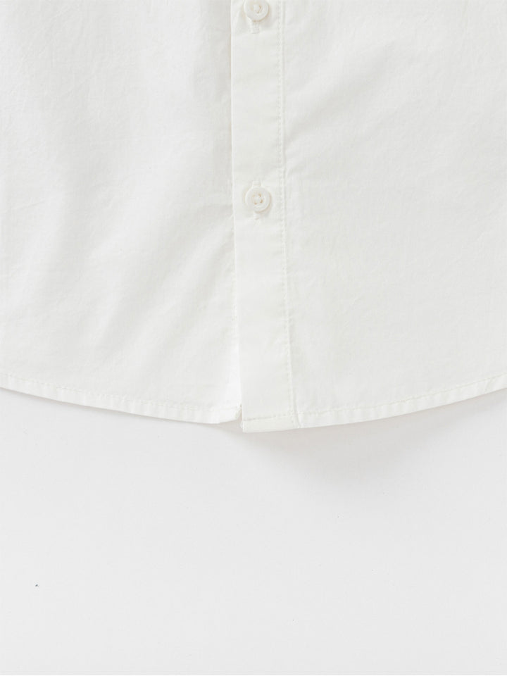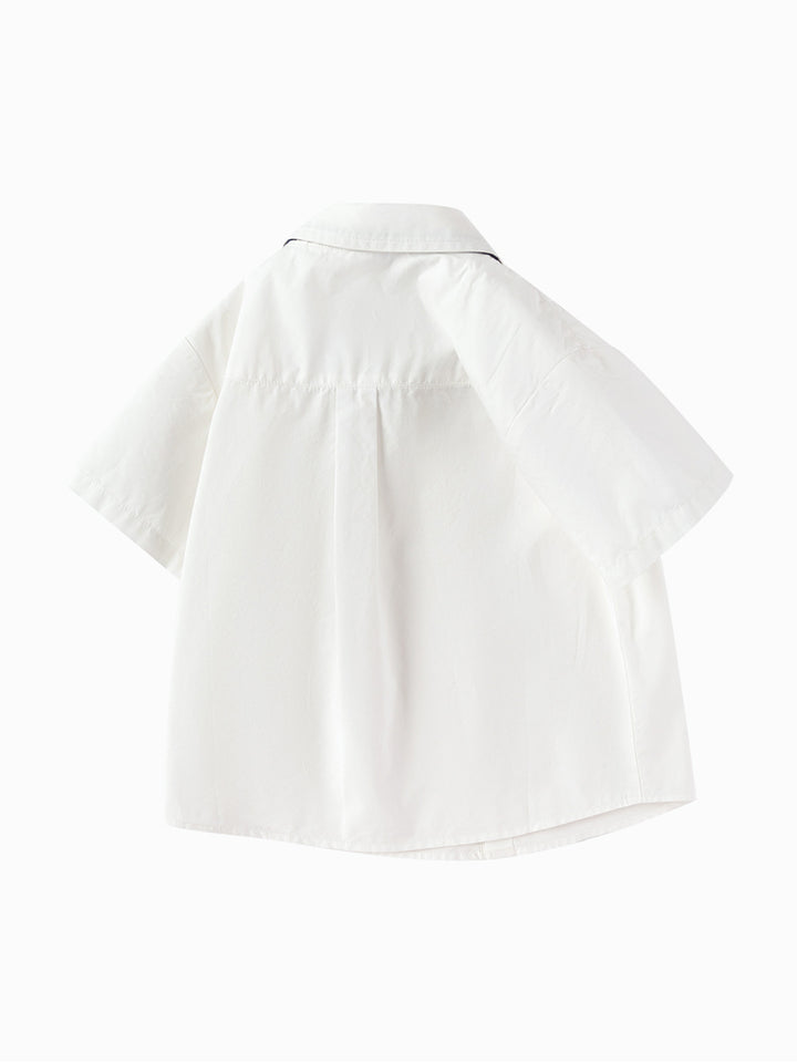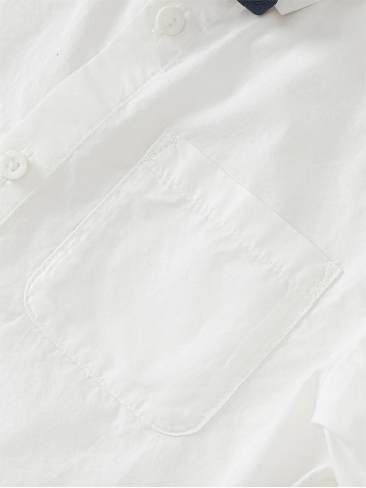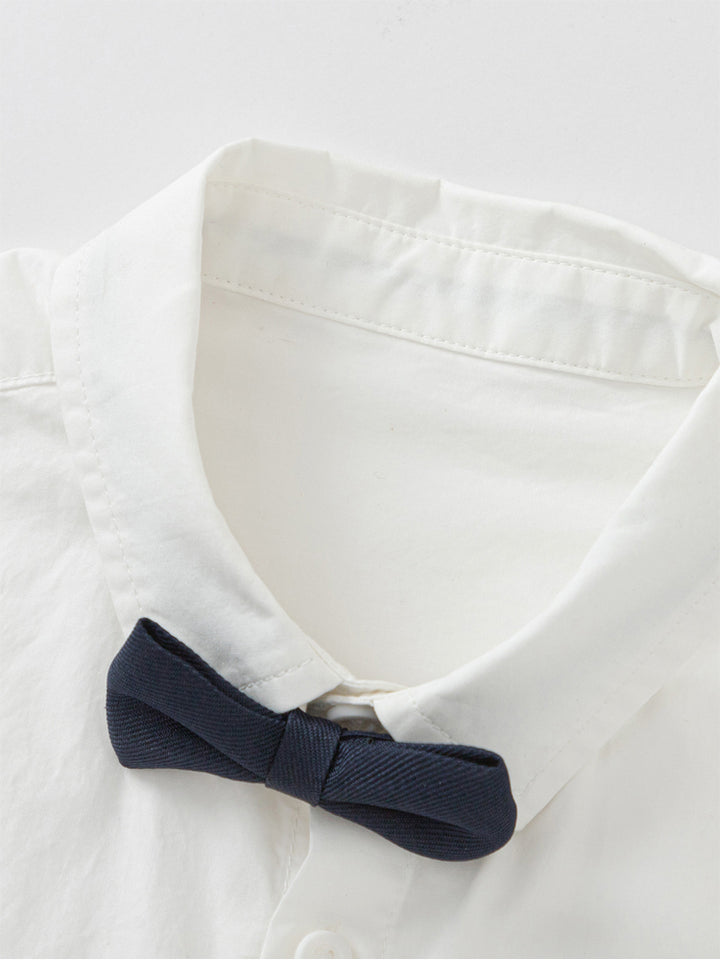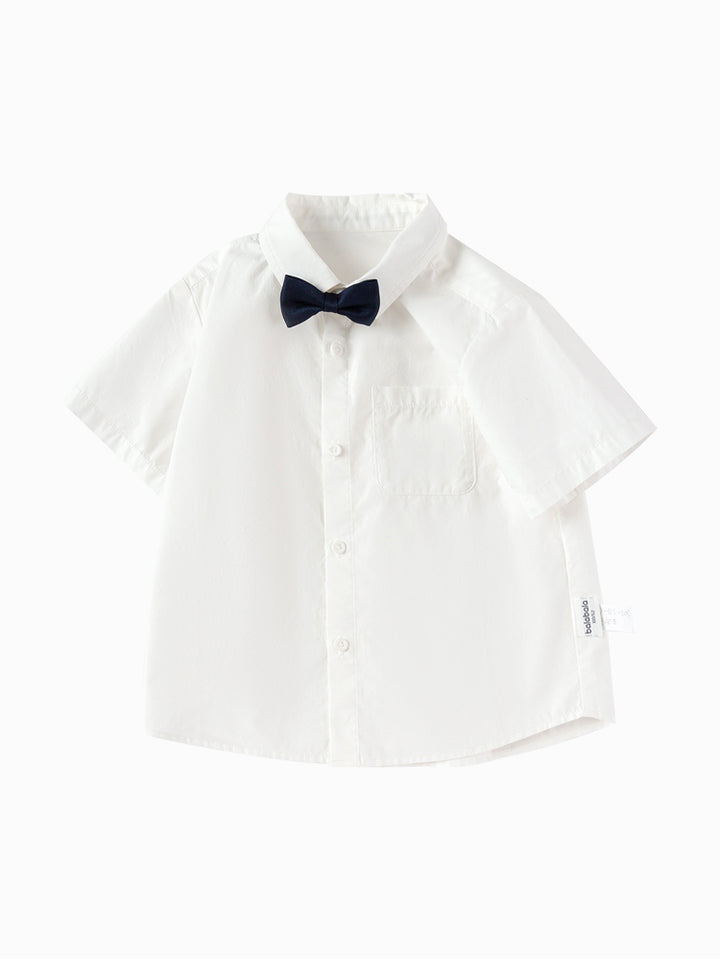 short sleeves boy shirt, in a solid mono colored pattern, comes with front pocket, buttons for closure on the front side and with a classic regular collar along with a bow tie