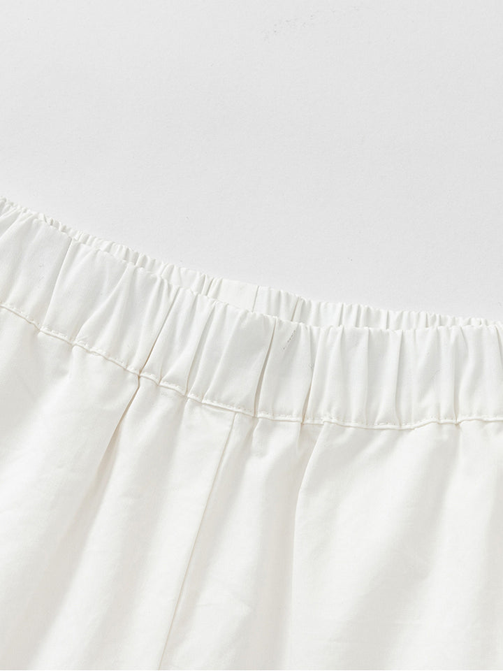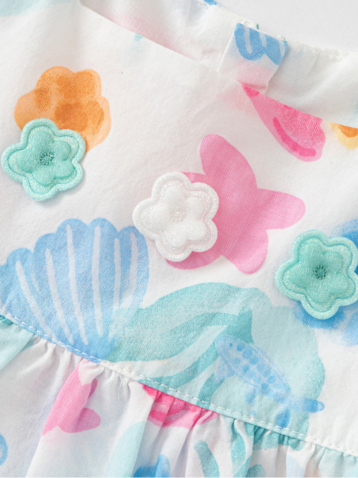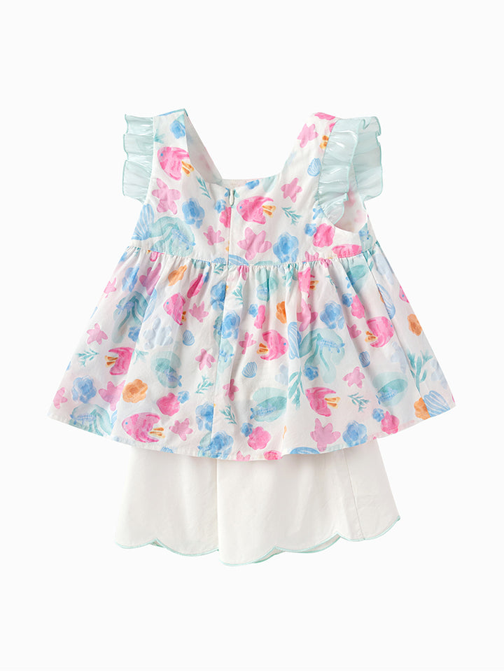 girls set of two pieces, a sleeveless flowy top, decorated with a multi colored printed pattern on full design and ruffled details on sleeves hems, comes with a zipper for closure on the back side and with a straight shape neckline, and a flowy shorts in solid colored pattern decorated with a slight embroidery lining on bottom legs hems, comes with a comfy elasticated waistband