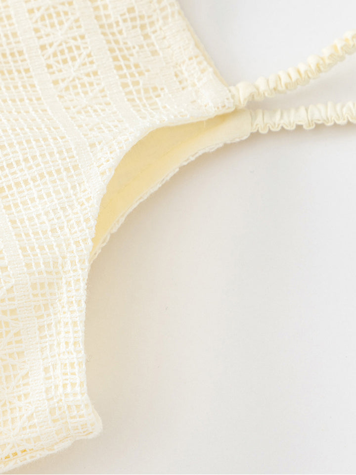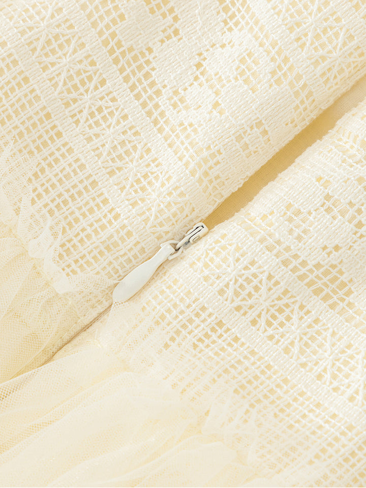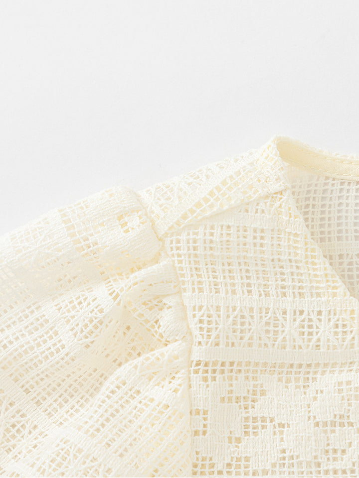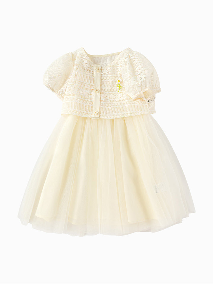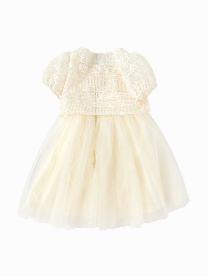 girls dress set of two pieces, a sleeveless dress with shoulder straps, decorated with crochet fabric details, comes with a zipper for closure on the back side and with a straight shape neckline, and a short sleeves cardigan jacket in a knitted crochet fabric, comes with buttons for closure on the front side and with a rounded shape neckline